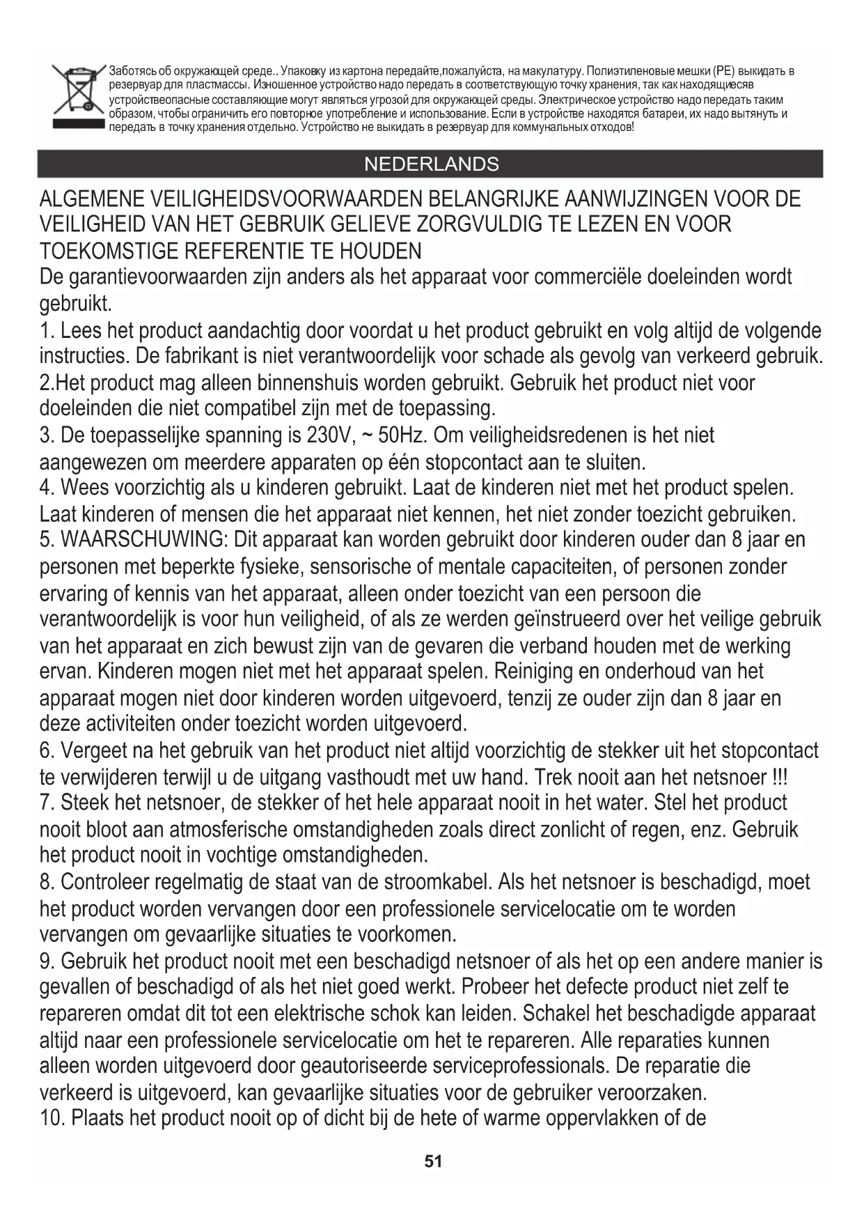personen met beperkte fysieke, sensorische of mentale capaciteiten, of personen zonder ervaring of kennis van het apparaat, alleen onder toezicht van een persoon die verantwoordelijk is voor hun veiligheid, of als ze werden geïnstrueerd over het veilige gebruik van het apparaat en zich bewust zijn van de gevaren die verband houden met de werking ervan. Kinderen mogen niet met het apparaat spelen. Reiniging en onderhoud van het apparaat mogen niet door kinderen worden uitgevoerd, tenzij ze ouder zijn dan 8 jaar en deze activiteiten onder toezicht worden uitgevoerd.