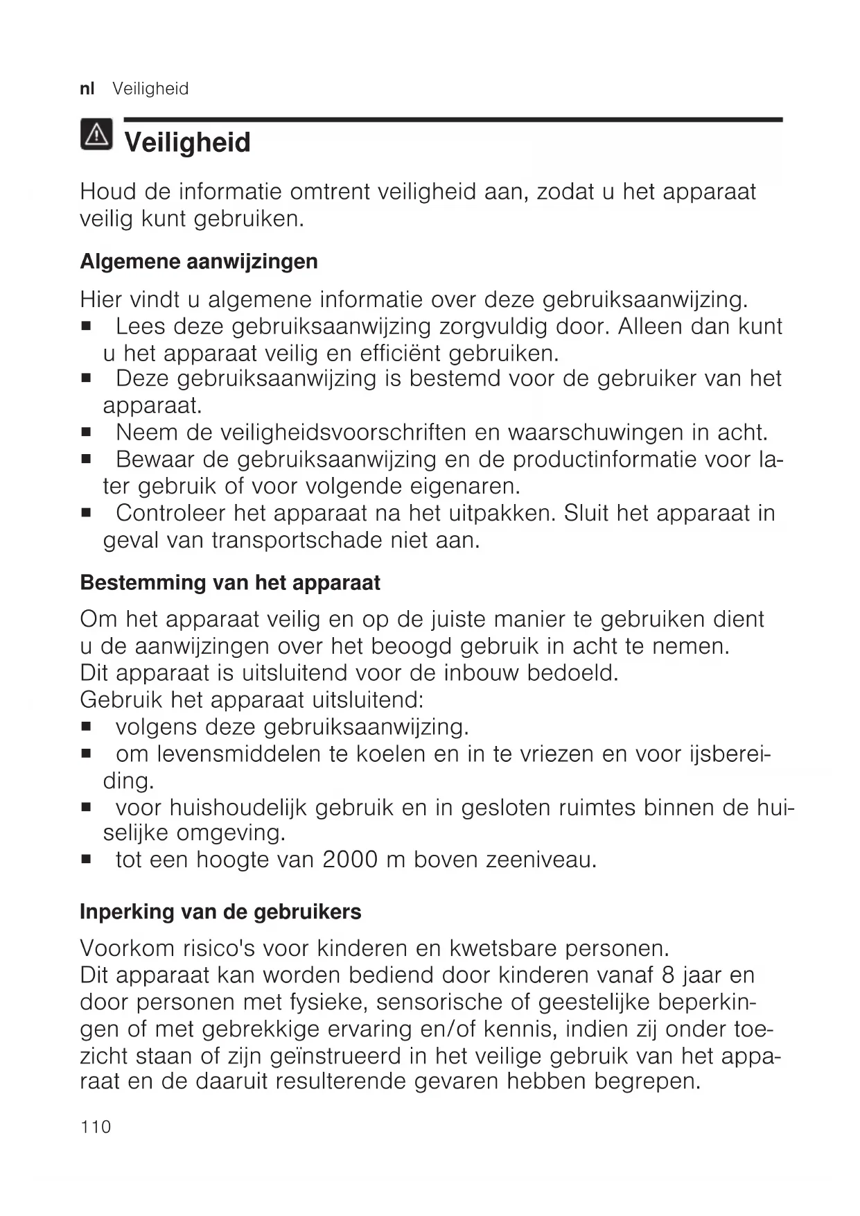 Veiligheid Houd de informatie omtrent veiligheid aan, zodat u het apparaat veilig kunt gebruiken. Algemene aanwijzingen Hier vindt u algemene informatie over deze gebruiksaanwijzing. ¡ Lees deze gebruiksaanwijzing zorgvuldig door. Alleen dan kunt u het apparaat veilig en efficiënt gebruiken. ¡ Deze gebruiksaanwijzing is bestemd voor de gebruiker van het apparaat. ¡ Neem de veiligheidsvoorschriften en waarschuwingen in acht. ¡ Bewaar de gebruiksaanwijzing en de productinformatie voor la- ter gebruik of voor volgende eigenaren. ¡ Controleer het apparaat na het uitpakken. Sluit het apparaat in geval van transportschade niet aan. Bestemming van het apparaat Om het apparaat veilig en op de juiste manier te gebruiken dient u de aanwijzingen over het beoogd gebruik in acht te nemen. Dit apparaat is uitsluitend voor de inbouw bedoeld. Gebruik het apparaat uitsluitend: ¡ volgens deze gebruiksaanwijzing. ¡ om levensmiddelen te koelen en in te vriezen en voor ijsberei- ding. ¡ voor huishoudelijk gebruik en in gesloten ruimtes binnen de hui- selijke omgeving. ¡ tot een hoogte van 2000m boven zeeniveau. Inperking van de gebruikers Voorkom risico's voor kinderen en kwetsbare personen. Dit apparaat kan worden bediend door kinderen vanaf 8 jaar en door personen met fysieke, sensorische of geestelijke beperkin- gen of met gebrekkige ervaring en/of kennis, indien zij onder toe- zicht staan of zijn geïnstrueerd in het veilige gebruik van het appa- raat en de daaruit resulterende gevaren hebben begrepen.Veiligheid nl