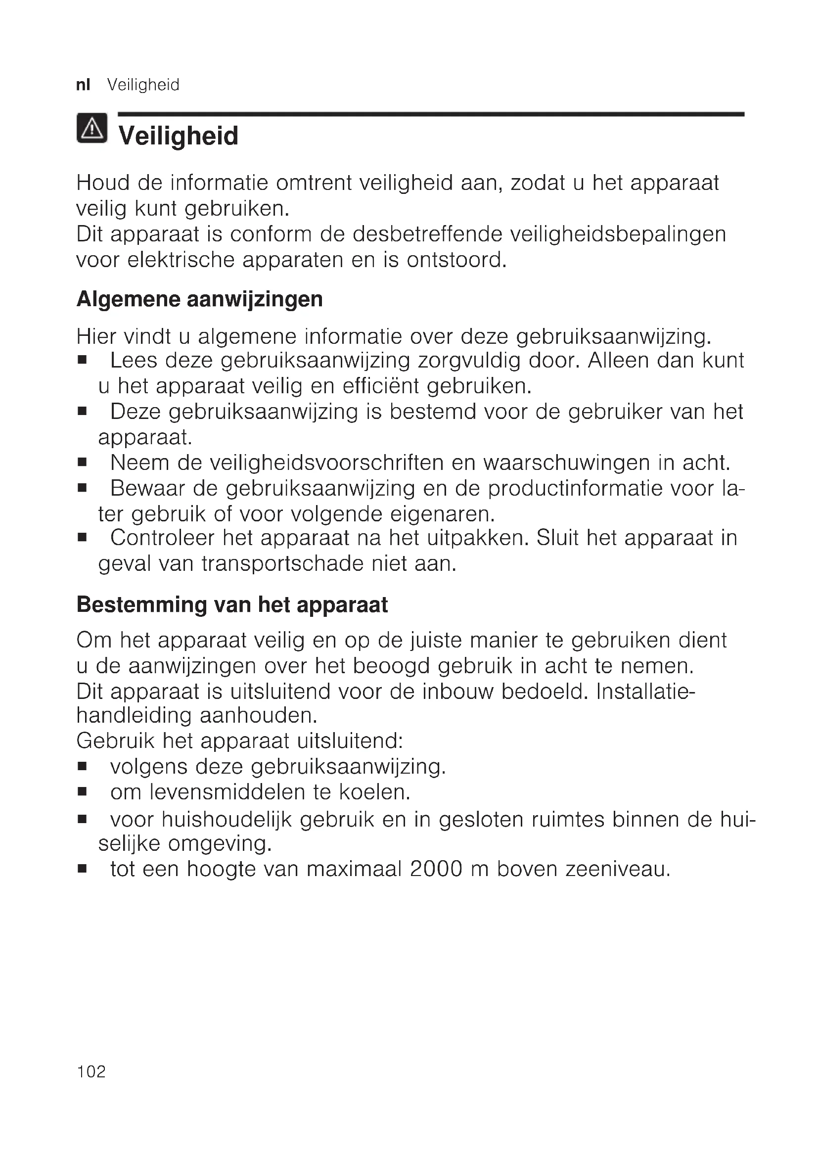 Veiligheid Houd de informatie omtrent veiligheid aan, zodat u het apparaat veilig kunt gebruiken. Dit apparaat is conform de desbetreffende veiligheidsbepalingen voor elektrische apparaten en is ontstoord. Algemene aanwijzingen Hier vindt u algemene informatie over deze gebruiksaanwijzing. ¡ Lees deze gebruiksaanwijzing zorgvuldig door. Alleen dan kunt u het apparaat veilig en efficiënt gebruiken. ¡ Deze gebruiksaanwijzing is bestemd voor de gebruiker van het apparaat. ¡ Neem de veiligheidsvoorschriften en waarschuwingen in acht. ¡ Bewaar de gebruiksaanwijzing en de productinformatie voor la- ter gebruik of voor volgende eigenaren. ¡ Controleer het apparaat na het uitpakken. Sluit het apparaat in geval van transportschade niet aan. Bestemming van het apparaat Om het apparaat veilig en op de juiste manier te gebruiken dient u de aanwijzingen over het beoogd gebruik in acht te nemen. Dit apparaat is uitsluitend voor de inbouw bedoeld. Installatie- handleiding aanhouden. Gebruik het apparaat uitsluitend: ¡ volgens deze gebruiksaanwijzing. ¡ om levensmiddelen te koelen. ¡ voor huishoudelijk gebruik en in gesloten ruimtes binnen de hui- selijke omgeving. ¡ tot een hoogte van maximaal 2000m boven zeeniveau.Veiligheid nl