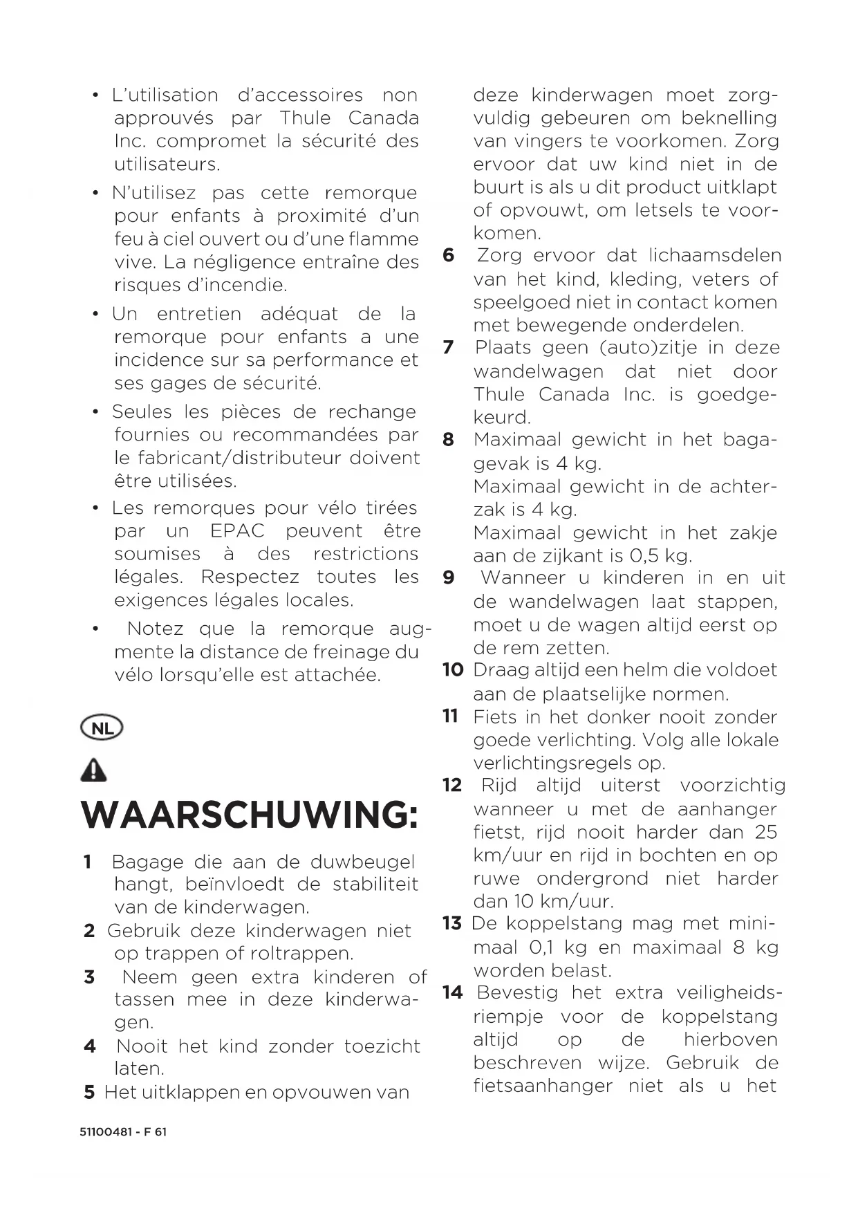 WAARSCHUWING: 1 Bagage die aan de duwbeugel hangt, beïnvloedt de stabiliteit van de kinderwagen. 2 Gebruik deze kinderwagen niet op trappen of roltrappen. 3 Neem geen extra kinderen of tassen mee in deze kinderwa- gen. 4 Nooit het kind zonder toezicht laten. 5 Het uitklappen en opvouwen van deze kinderwagen moet zorg- vuldig gebeuren om beknelling van vingers te voorkomen. Zorg ervoor dat uw kind niet in de buurt is als u dit product uitklapt of opvouwt, om letsels te voor- komen. 6 Zorg ervoor dat lichaamsdelen van het kind, kleding, veters of speelgoed niet in contact komen met bewegende onderdelen. 7 Plaats geen (auto)zitje in deze wandelwagen dat niet door Thule Canada Inc. is goedge- keurd. 8 Maximaal gewicht in het baga- gevak is 4 kg. Maximaal gewicht in de achter- zak is 4 kg. Maximaal gewicht in het zakje aan de zijkant is 0,5 kg. 9 Wanneer u kinderen in en uit de wandelwagen laat stappen, moet u de wagen altijd eerst op de rem zetten. 10 Draag altijd een helm die voldoet aan de plaatselijke normen.