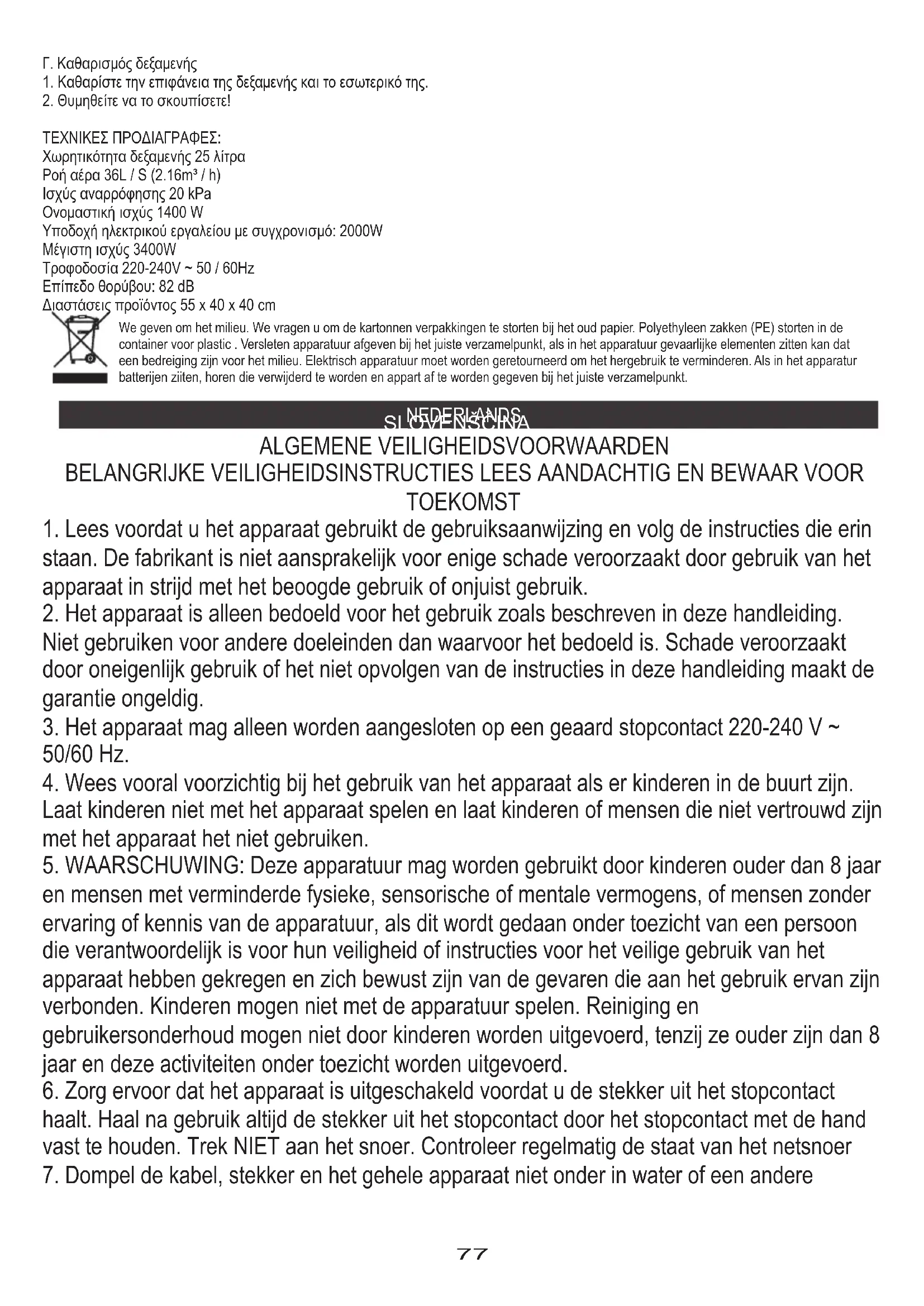 We geven om het milieu. We vragen u om de kartonnen verpakkingen te storten bij het oud papier. Polyethyleen zakken (PE) storten in de container voor plastic . Versleten apparatuur afgeven bij het juiste verzamelpunkt, als in het apparatuur gevaarlijke elementen zitten kan dat een bedreiging zijn voor het milieu. Elektrisch apparatuur moet worden geretourneerd om het hergebruik te verminderen. Als in het apparatur batterijen ziiten, horen die verwijderd te worden en appart af te worden gegeven bij het juiste verzamelpunkt. SLOVENŠČINA NEDERLANDS ALGEMENE VEILIGHEIDSVOORWAARDEN BELANGRIJKE VEILIGHEIDSINSTRUCTIES LEES AANDACHTIG EN BEWAAR VOOR TOEKOMST