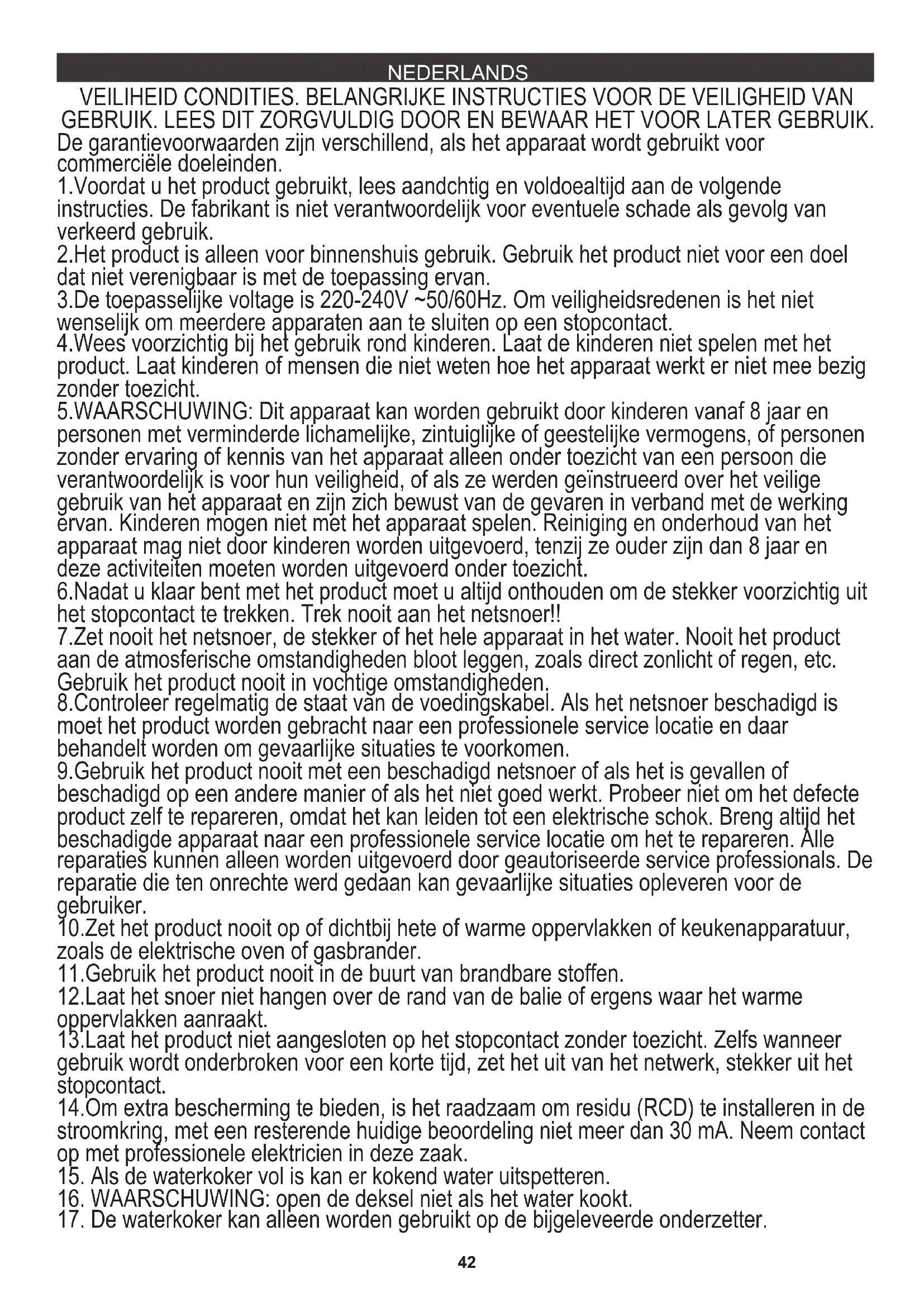 19. Dit apparaat is geschikt voor het koken van zuiver water voor huishoudelijk gebruik,