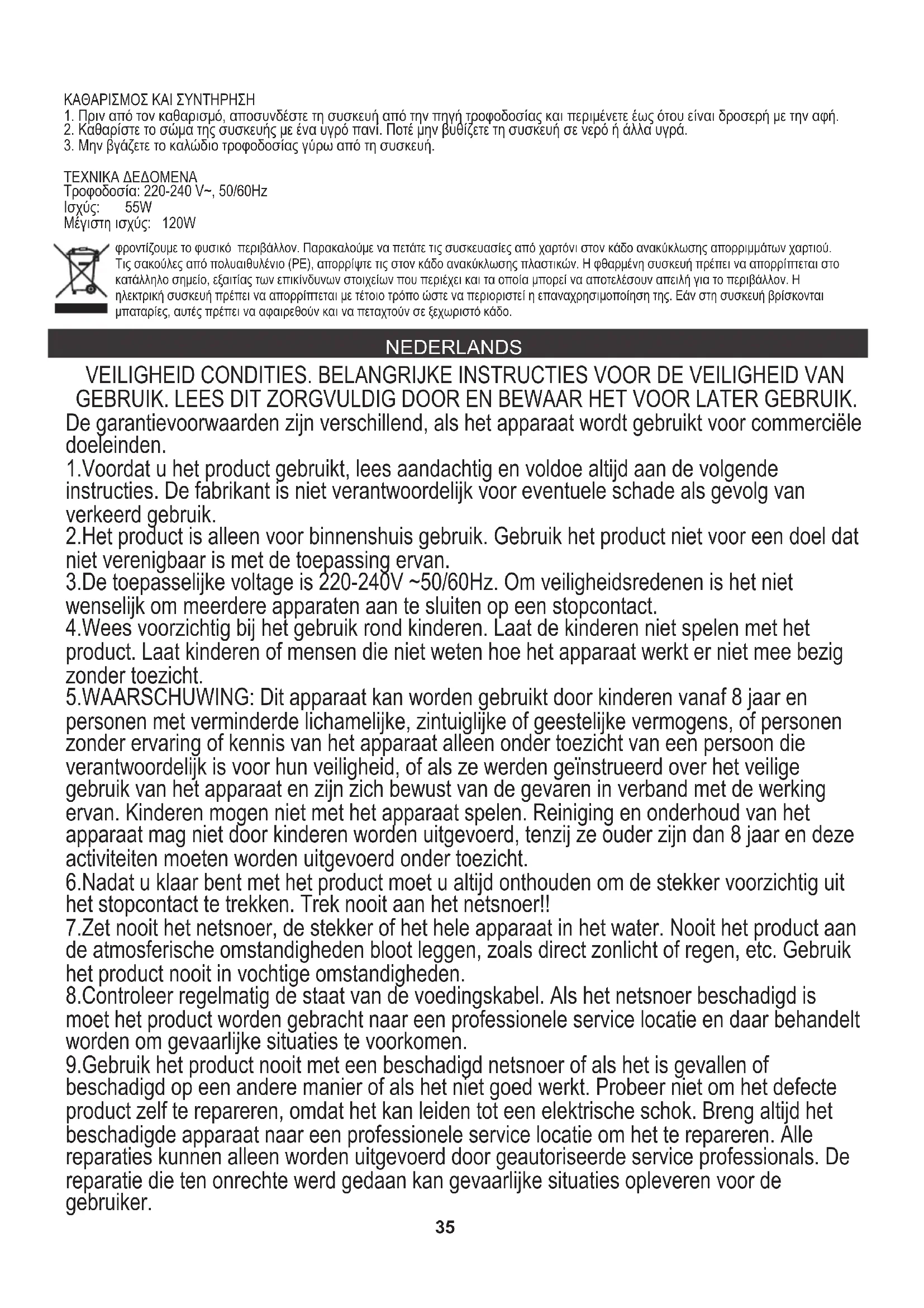 ΤΕΧΝΙΚΑ ΔΕΔΟΜΕΝΑ Τροφοδοσία: 220-240 V~, 50/60Hz Ισχύς: 55W Μέγιστη ισχύς: 120W φροντίζουμε το φυσικό περιβάλλον. Παρακαλούμε να πετάτε τις συσκευασίες από χαρτόνι στον κάδο ανακύκλωσης απορριμμάτων χαρτιού. Τις σακούλες από πολυαιθυλένιο (ΡΕ), απορρίψτε τις στον κάδο ανακύκλωσης πλαστικών. Η φθαρμένη συσκευή πρέπει να απορρίπτεται στο κατάλληλο σημείο, εξαιτίας των επικίνδυνων στοιχείων που περιέχει και τα οποία μπορεί να αποτελέσουν απειλή για το περιβάλλον. Η ηλεκτρική συσκευή πρέπει να απορρίπτεται με τέτοιο τρόπο ώστε να περιοριστεί η επαναχρησιμοποίηση της. Εάν στη συσκευή βρίσκονται μπαταρίες, αυτές πρέπει να αφαιρεθούν και να πεταχτούν σε ξεχωριστό κάδο. NEDERLANDS VEILIGHEID CONDITIES. BELANGRIJKE INSTRUCTIES VOOR DE VEILIGHEID VAN GEBRUIK. LEES DIT ZORGVULDIG DOOR EN BEWAAR HET VOOR LATER GEBRUIK. De garantievoorwaarden zijn verschillend, als het apparaat wordt gebruikt voor commerciële doeleinden. 1.Voordat u het product gebruikt, lees aandachtig en voldoe altijd aan de volgende instructies. De fabrikant is niet verantwoordelijk voor eventuele schade als gevolg van verkeerd gebruik. 2.Het product is alleen voor binnenshuis gebruik. Gebruik het product niet voor een doel dat niet verenigbaar is met de toepassing ervan. 3.De toepasselijke voltage is 220-240V ~50/60Hz. Om veiligheidsredenen is het niet wenselijk om meerdere apparaten aan te sluiten op een stopcontact. 4.Wees voorzichtig bij het gebruik rond kinderen. Laat de kinderen niet spelen met het product. Laat kinderen of mensen die niet weten hoe het apparaat werkt er niet mee bezig zonder toezicht. 5.WAARSCHUWING: Dit apparaat kan worden gebruikt door kinderen vanaf 8 jaar en personen met verminderde lichamelijke, zintuiglijke of geestelijke vermogens, of personen zonder ervaring of kennis van het apparaat alleen onder toezicht van een persoon die verantwoordelijk is voor hun veiligheid, of als ze werden geïnstrueerd over het veilige gebruik van het apparaat en zijn zich bewust van de gevaren in verband met de werking ervan. Kinderen mogen niet met het apparaat spelen. Reiniging en onderhoud van het apparaat mag niet door kinderen worden uitgevoerd, tenzij ze ouder zijn dan 8 jaar en deze activiteiten moeten worden uitgevoerd onder toezicht. 6.Nadat u klaar bent met het product moet u altijd onthouden om de stekker voorzichtig uit het stopcontact te trekken. Trek nooit aan het netsnoer!! 7.Zet nooit het netsnoer, de stekker of het hele apparaat in het water. Nooit het product aan de atmosferische omstandigheden bloot leggen, zoals direct zonlicht of regen, etc. Gebruik het product nooit in vochtige omstandigheden. 8.Controleer regelmatig de staat van de voedingskabel. Als het netsnoer beschadigd is moet het product worden gebracht naar een professionele service locatie en daar behandelt worden om gevaarlijke situaties te voorkomen. 9.Gebruik het product nooit met een beschadigd netsnoer of als het is gevallen of beschadigd op een andere manier of als het niet goed werkt. Probeer niet om het defecte product zelf te repareren, omdat het kan leiden tot een elektrische schok. Breng altijd het beschadigde apparaat naar een professionele service locatie om het te repareren. Alle reparaties kunnen alleen worden uitgevoerd door geautoriseerde service professionals. De reparatie die ten onrechte werd gedaan kan gevaarlijke situaties opleveren voor de gebruiker.36 10.Zet het product nooit op of dichtbij hete of warme oppervlakken of keukenapparatuur, zoals de elektrische oven of gasbrander. 11.Gebruik het product nooit in de buurt van brandbare stoffen. 12.Laat het snoer niet hangen over de rand van de balie of ergens waar het warme oppervlakken aanraakt. 13.Laat het product niet aangesloten op het stopcontact zonder toezicht. Zelfs wanneer gebruik wordt onderbroken voor een korte tijd, zet het uit van het netwerk, stekker uit het stopcontact. 14.Om extra bescherming te bieden, is het raadzaam om residu (RCD) te installeren in de stroomkring, met een resterende huidige beoordeling niet meer dan 30 mA. Neem contact op met professionele elektricien in deze zaak.