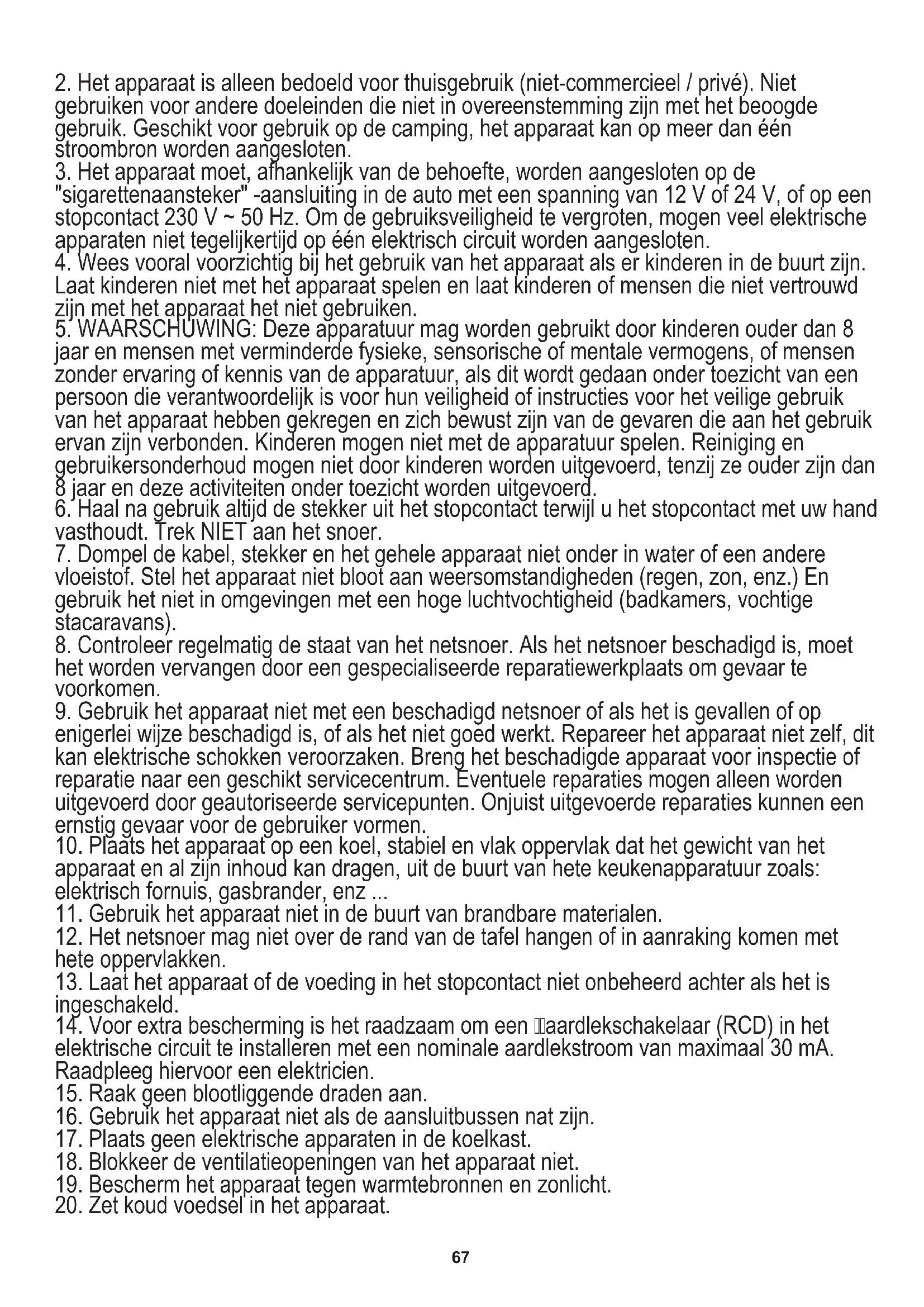 Koppel het apparaat altijd los voordat u begint met schoonmaken. Maak schoon met een zachte, droge doek. Gebruik geen chemische oplosmiddelen, deze kunnen het apparaat permanent beschadigen of vervormen. PROBLEEMOPLOSSEN Volg de onderstaande gids voor probleemoplossing om veelvoorkomende problemen op te lossen. Probleem I: Het apparaat functioneert helemaal niet en vertoont geen tekenen van stroom. Mogelijke oorzaak 1: Het apparaat krijgt geen stroom. Oplossing voor mogelijke oorzaak 1: Zorg ervoor dat het apparaat is aangesloten. Mogelijke oorzaak 2: onvoldoende stroom. Oplossing voor mogelijke oorzaak 2: Verplaats het apparaat naar een ander stopcontact. Controleer uw stroomonderbreker. (Raadpleeg het typeplaatje op de achterkant van het apparaat om de stroomsterkte te bepalen). Mogelijke oorzaak 4: gelijkstroomkabel Oplossing voor mogelijke oorzaak 4: Test het apparaat met een andere voeding, bijv. een ander voertuig met een bekende werkende gelijkstroomaansluiting. Mogelijke oorzaak 5: Losgekoppelde draden. Oplossing voor mogelijke oorzaak 5: Neem contact op met de klantenservice. Probleem II: Het apparaat maakt vreemde geluiden. Mogelijke oorzaak 1: De unit staat niet waterpas. Oplossing 1: verplaats het apparaat naar een vlak, horizontaal oppervlak. Probleem III: Het apparaat maakt een hard continu metaalachtig klop- of pingelgeluid. Mogelijke oorzaak 1: Het apparaat is mogelijk op zijn kant vervoerd. Oplossing 1: schakel het apparaat uit. Laat het apparaat minimaal 24 uur op een vlakke ondergrond staan en start het opnieuw. Mogelijke oorzaak 2: beschadigde compressor Oplossing 2: neem contact op met de klantenservice. Oplossing: neem contact op met een elektricien als de unit in een andere kamer of ander circuit werkt.70 We geven om het milieu. We vragen u om de kartonnen verpakkingen te storten bij het oud papier. Polyethyleen zakken (PE) storten in de container voor plastic . Versleten apparatuur afgeven bij het juiste verzamelpunkt, als in het apparatuur gevaarlijke elementen zitten kan dat een bedreiging zijn voor het milieu. Elektrisch apparatuur moet worden geretourneerd om het hergebruik te verminderen. Als in het apparatur batterijen ziiten, horen die verwijderd te worden en appart af te worden gegeven bij het juiste verzamelpunkt.