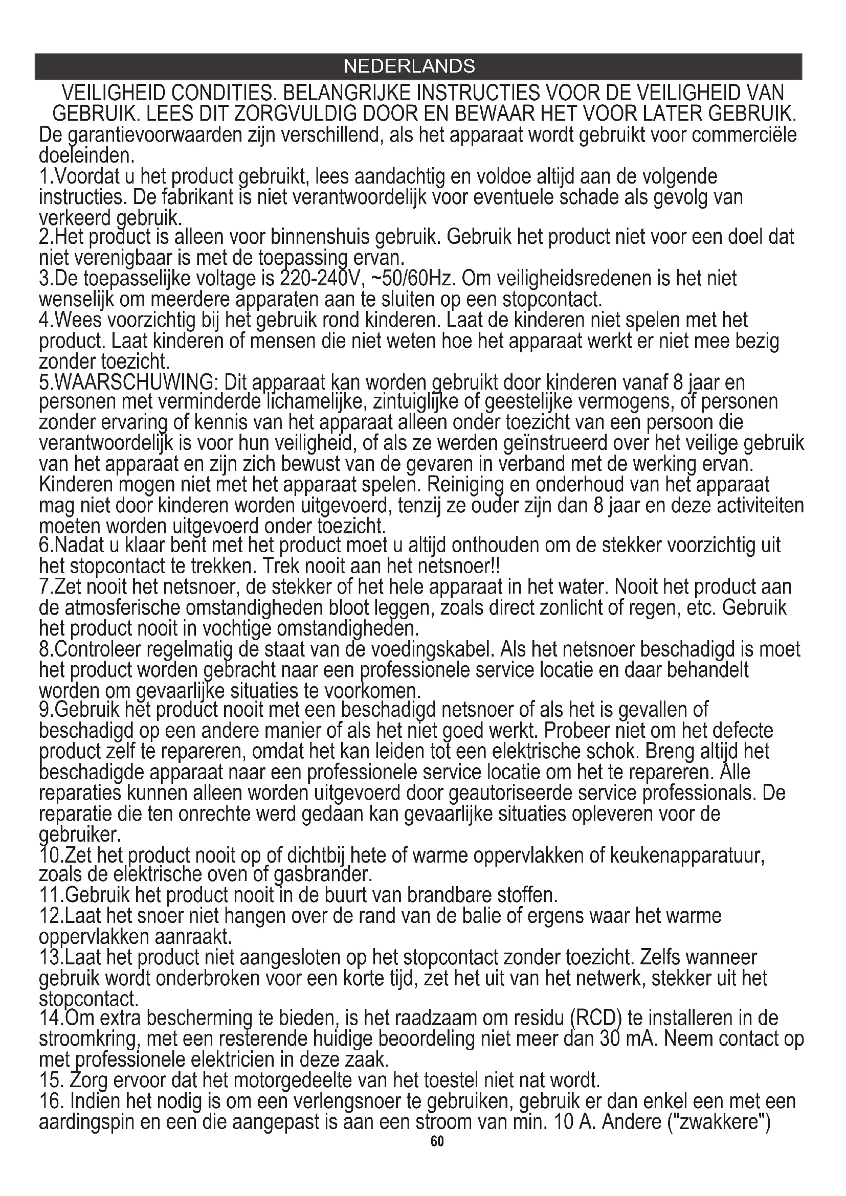 φροντίζουμε το φυσικό περιβάλλον. Παρακαλούμε να πετάτε τις συσκευασίες από χαρτόνι στον κάδο ανακύκλωσης απορριμμάτων χαρτιού. Τις σακούλες από πολυαιθυλένιο (ΡΕ), απορρίψτε τις στον κάδο ανακύκλωσης πλαστικών. Η φθαρμένη συσκευή πρέπει να απορρίπτεται στο κατάλληλο σημείο, εξαιτίας των επικίνδυνων στοιχείων που περιέχει και τα οποία μπορεί να αποτελέσουν απειλή για το περιβάλλον. Η ηλεκτρική συσκευή πρέπει να απορρίπτεται με τέτοιο τρόπο ώστε να περιοριστεί η επαναχρησιμοποίηση της. Εάν στη συσκευή βρίσκονται μπαταρίες, αυτές πρέπει να αφαιρεθούν και να πεταχτούν σε ξεχωριστό κάδο.3.De toepasselijke voltage is 220-240V, ~50/60Hz. Om veiligheidsredenen is het niet wenselijk om meerdere apparaten aan te sluiten op een stopcontact. VEILIGHEID CONDITIES. BELANGRIJKE INSTRUCTIES VOOR DE VEILIGHEID VAN GEBRUIK. LEES DIT ZORGVULDIG DOOR EN BEWAAR HET VOOR LATER GEBRUIK. De garantievoorwaarden zijn verschillend, als het apparaat wordt gebruikt voor commerciële doeleinden. 4.Wees voorzichtig bij het gebruik rond kinderen. Laat de kinderen niet spelen met het product. Laat kinderen of mensen die niet weten hoe het apparaat werkt er niet mee bezig zonder toezicht. 5.WAARSCHUWING: Dit apparaat kan worden gebruikt door kinderen vanaf 8 jaar en personen met verminderde lichamelijke, zintuiglijke of geestelijke vermogens, of personen zonder ervaring of kennis van het apparaat alleen onder toezicht van een persoon die verantwoordelijk is voor hun veiligheid, of als ze werden geïnstrueerd over het veilige gebruik van het apparaat en zijn zich bewust van de gevaren in verband met de werking ervan. Kinderen mogen niet met het apparaat spelen. Reiniging en onderhoud van het apparaat mag niet door kinderen worden uitgevoerd, tenzij ze ouder zijn dan 8 jaar en deze activiteiten moeten worden uitgevoerd onder toezicht. 6.Nadat u klaar bent met het product moet u altijd onthouden om de stekker voorzichtig uit het stopcontact te trekken. Trek nooit aan het netsnoer!! 1.Voordat u het product gebruikt, lees aandachtig en voldoe altijd aan de volgende instructies. De fabrikant is niet verantwoordelijk voor eventuele schade als gevolg van verkeerd gebruik. 2.Het product is alleen voor binnenshuis gebruik. Gebruik het product niet voor een doel dat niet verenigbaar is met de toepassing ervan. 13.Laat het product niet aangesloten op het stopcontact zonder toezicht. Zelfs wanneer gebruik wordt onderbroken voor een korte tijd, zet het uit van het netwerk, stekker uit het stopcontact.
