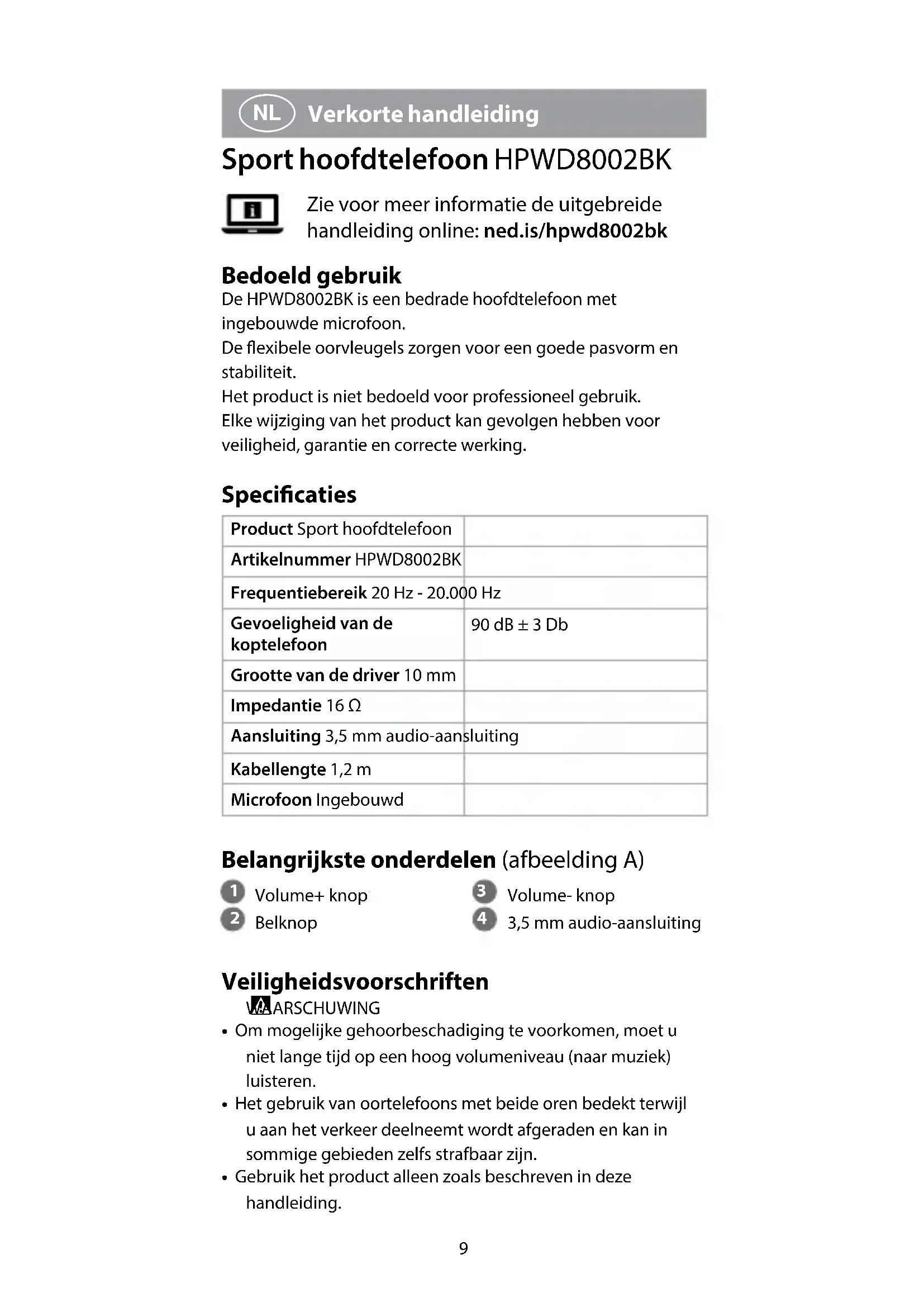 Verkorte handleiding Sport hoofdtelefoon HPWD8002BK Zie voor meer informatie de uitgebreide handleiding online: ned.is/hpwd8002bk Bedoeld gebruik De HPWD8002BK is een bedrade hoofdtelefoon met ingebouwde microfoon.De exibele oorvleugels zorgen voor een goede pasvorm en stabiliteit.Het product is niet bedoeld voor professioneel gebruik.Elke wijziging van het product kan gevolgen hebben voor veiligheid, garantie en correcte werking. Specicaties Product Sport hoofdtelefoonArtikelnummer HPWD8002BKFrequentiebereik 20 Hz - 20.000 HzGevoeligheid van de koptelefoon90 dB ± 3 DbGrootte van de driver 10 mmImpedantie 16 ΩAansluiting 3,5 mm audio-aansluitingKabellengte 1,2 mMicrofoon Ingebouwd Belangrijkste onderdelen (afbeelding A)