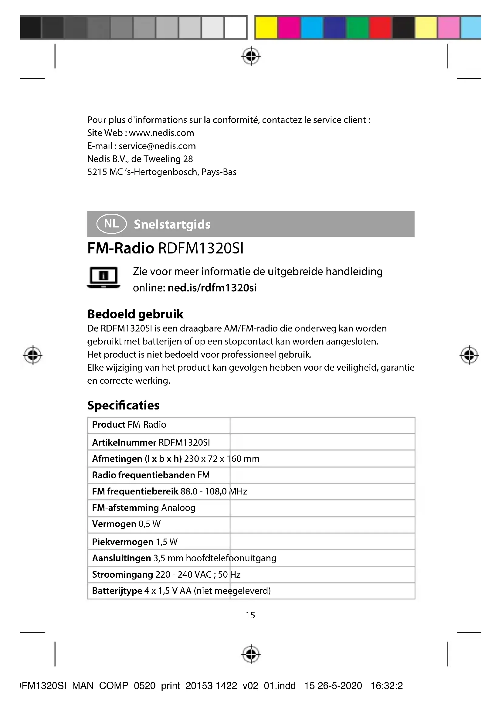 , geproduceerd in China, is getest conform alle relevante CE-normen en -voorschriften en dat alle tests met succes zijn doorstaan. Dit omvat, maar is niet beperkt tot de richtlijn RED 2014/53/EU. De volledige conformiteitsverklaring (en het blad met veiligheidsgegevens indien van toepassing) kan worden gevonden en gedownload via nedis.nl/rdfm1320si#support Voor andere informatie met betrekking tot de naleving neemt u contact op met de klantenservice: Web: www.nedis.nl E-mail: service@nedis.com Nedis B.V., de Tweeling 28 5215 MC ’s-Hertogenbosch, Nederland RDFM1320SI_MAN_COMP_0520_print_20153 1422_v02_01.indd 18 26-5-2020 16:32:2119