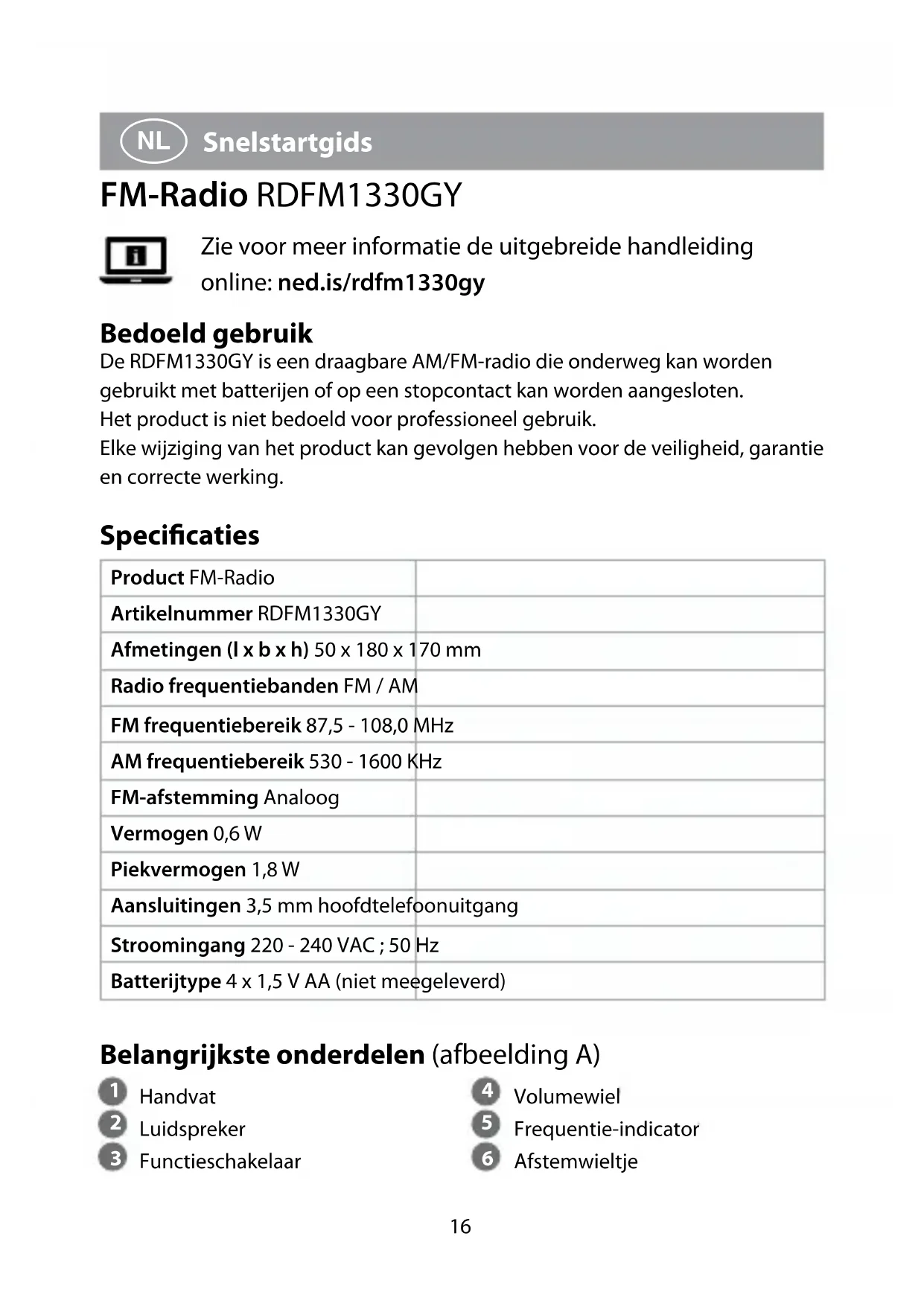 Snelstartgids FM-Radio RDFM1330GY Zie voor meer informatie de uitgebreide handleiding online: ned.is/rdfm1330gy Bedoeld gebruik De RDFM1330GY is een draagbare AM/FM-radio die onderweg kan worden gebruikt met batterijen of op een stopcontact kan worden aangesloten. Het product is niet bedoeld voor professioneel gebruik. Elke wijziging van het product kan gevolgen hebben voor de veiligheid, garantie en correcte werking. Specicaties Product FM-Radio Artikelnummer RDFM1330GY Afmetingen (l x b x h) 50 x 180 x 170 mm Radio frequentiebanden FM / AM FM frequentiebereik 87,5 - 108,0 MHz AM frequentiebereik 530 - 1600 KHz FM-afstemming Analoog Vermogen 0,6 W Piekvermogen 1,8 W Aansluitingen 3,5 mm hoofdtelefoonuitgang Stroomingang 220 - 240 VAC ; 50 Hz Batterijtype 4 x 1,5 V AA (niet meegeleverd) Belangrijkste onderdelen (afbeelding A)