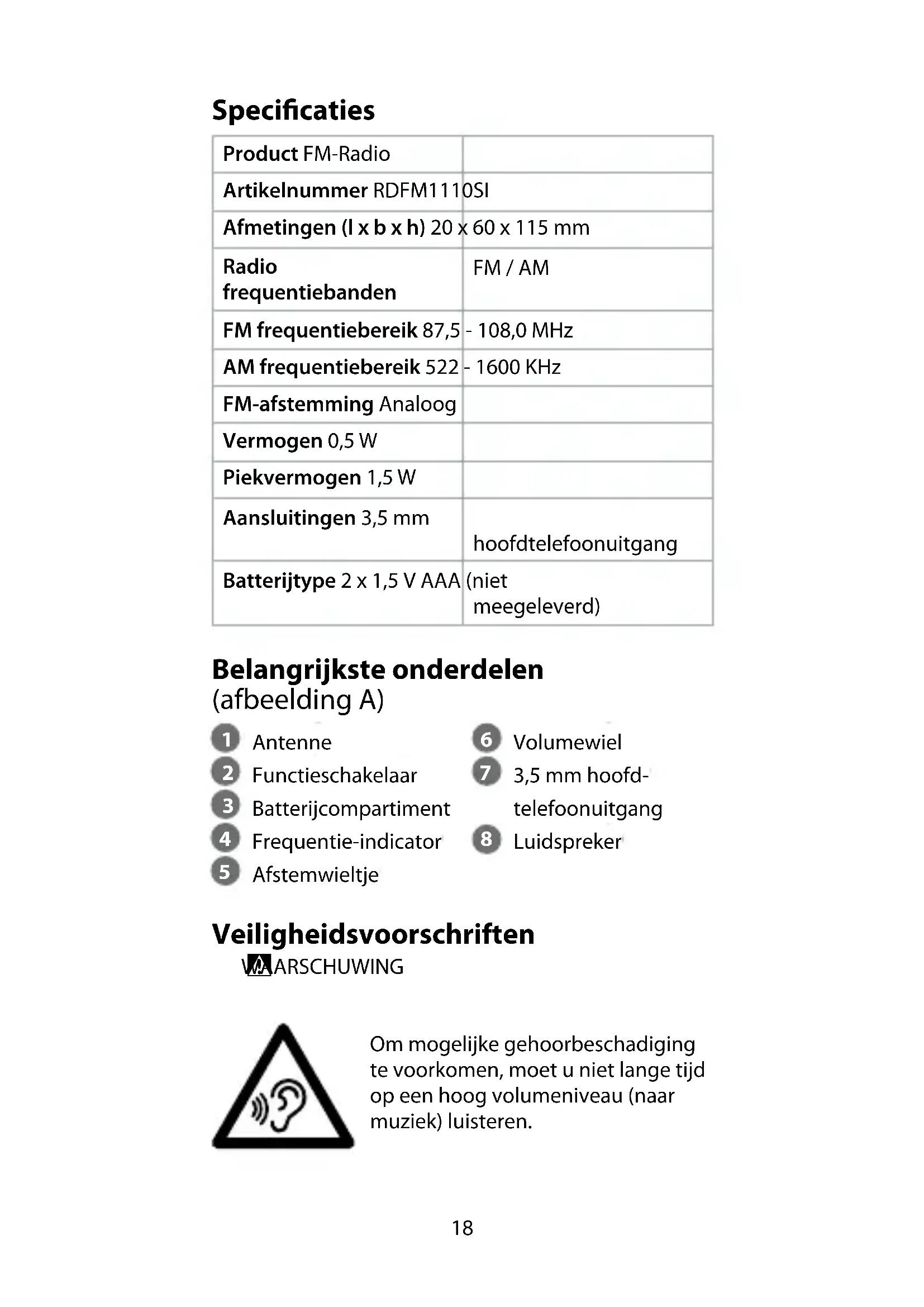 Snelstartgids FM-Radio RDFM1110SI Zie voor meer informatie de uitgebreide handleiding online: ned.is/rdfm1110si Bedoeld gebruik De RDFM1110SI is een draagbare AM/FM-radio die onderweg kan worden gebruikt met batterijen of op een stopcontact kan worden aangesloten. Het product is niet bedoeld voor professioneel gebruik. Elke wijziging van het product kan gevolgen hebben voor de veiligheid, garantie en correcte werking.18 Specicaties Product FM-Radio Artikelnummer RDFM1110SI Afmetingen (l x b x h) 20 x 60 x 115 mm Radio frequentiebanden FM / AM FM frequentiebereik 87,5 - 108,0 MHz AM frequentiebereik 522 - 1600 KHz FM-afstemming Analoog Vermogen 0,5 W Piekvermogen 1,5 W Aansluitingen 3,5 mm hoofdtelefoonuitgang Batterijtype 2 x 1,5 V AAA (niet meegeleverd) Belangrijkste onderdelen (afbeelding A)