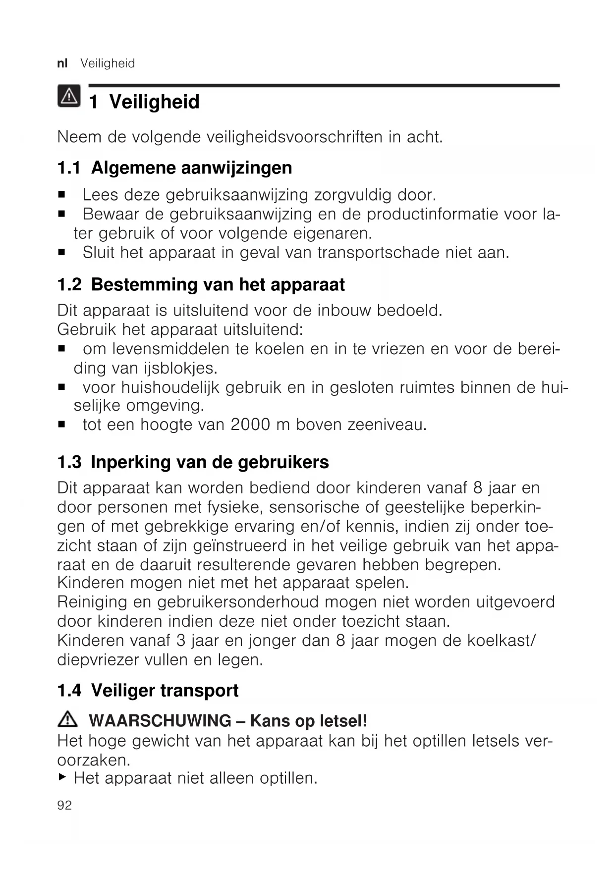 1 Veiligheid Neem de volgende veiligheidsvoorschriften in acht. 1.1 Algemene aanwijzingen ¡ Lees deze gebruiksaanwijzing zorgvuldig door. ¡ Bewaar de gebruiksaanwijzing en de productinformatie voor la- ter gebruik of voor volgende eigenaren. ¡ Sluit het apparaat in geval van transportschade niet aan. 1.2 Bestemming van het apparaat Dit apparaat is uitsluitend voor de inbouw bedoeld. Gebruik het apparaat uitsluitend: ¡ om levensmiddelen te koelen en in te vriezen en voor de berei- ding van ijsblokjes. ¡ voor huishoudelijk gebruik en in gesloten ruimtes binnen de hui- selijke omgeving. ¡ tot een hoogte van 2000m boven zeeniveau. 1.3 Inperking van de gebruikers Dit apparaat kan worden bediend door kinderen vanaf 8 jaar en door personen met fysieke, sensorische of geestelijke beperkin- gen of met gebrekkige ervaring en/of kennis, indien zij onder toe- zicht staan of zijn geïnstrueerd in het veilige gebruik van het appa- raat en de daaruit resulterende gevaren hebben begrepen. Kinderen mogen niet met het apparaat spelen. Reiniging en gebruikersonderhoud mogen niet worden uitgevoerd door kinderen indien deze niet onder toezicht staan. Kinderen vanaf 3 jaar en jonger dan 8 jaar mogen de koelkast/ diepvriezer vullen en legen. 1.4 Veiliger transport WAARSCHUWING‒Kans op letsel! Het hoge gewicht van het apparaat kan bij het optillen letsels ver- oorzaken.
