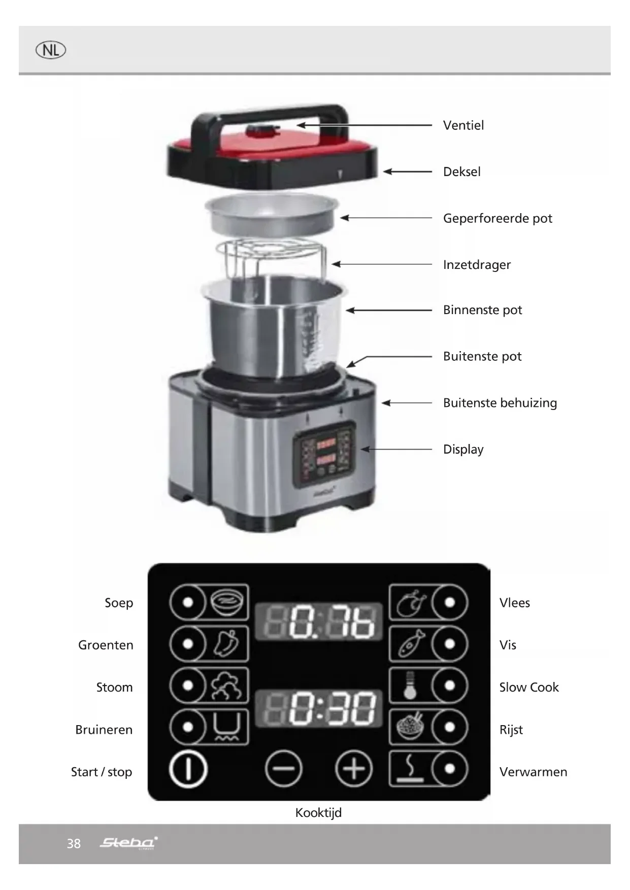 0,36 bar Stoven: Deksel opleggen Ventiel open Inzethouder geperforeerde pot “Stoven” indrukken