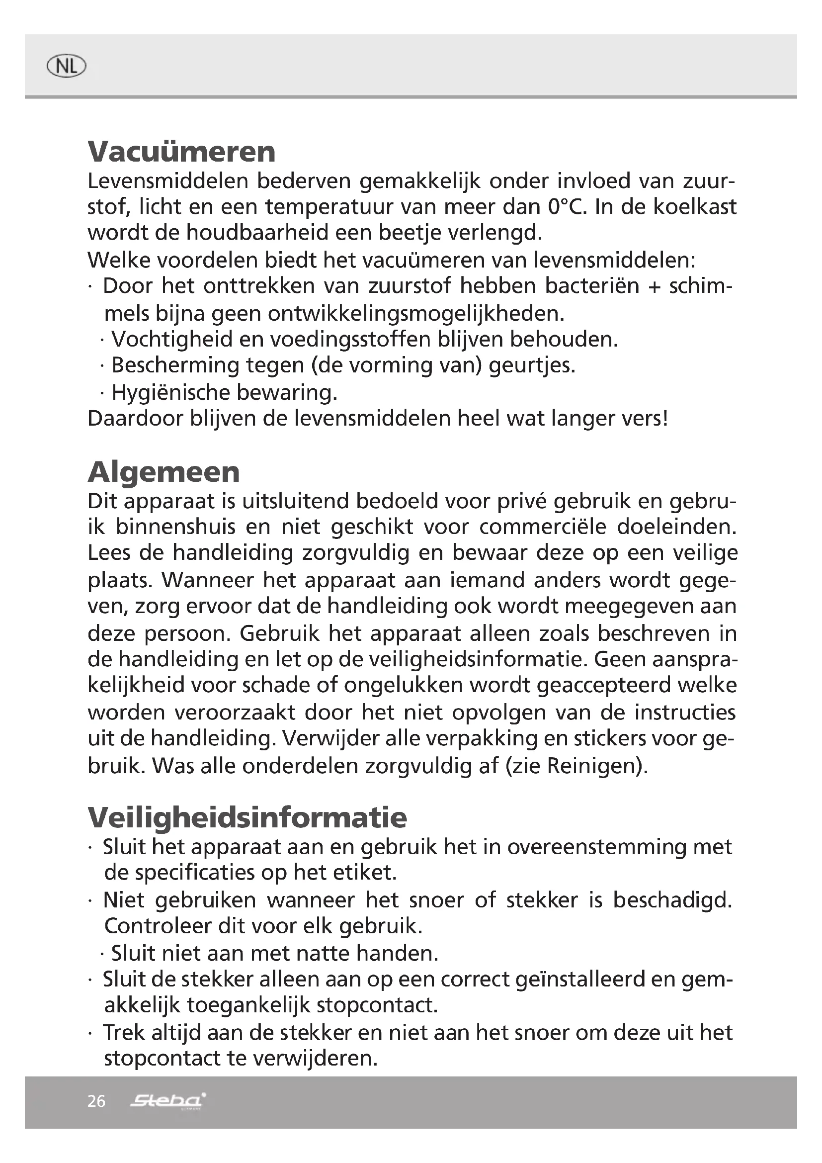 ∙ Faire une pause d‘une minute entre les soudages afin que l‘appareil puisse refroidir. ∙ Si l‘appareil est surchargé, la protection anti-surchauffe éteint l‘appareil. Dans ce cas, débrancher la fiche de contact et laisser refroidir pendant environ 20 minutes.24 ∙ Le scellage sous vide ne remplace pas la surgélation des aliments. Tuyau d’aspirateur et bouchon à vin ∙ Ne remplissez pas un récipient sous vide trop haut avec des aliments liquides. ∙ Mettre le tuyau d’aspiration sur la buse d’aspiration 4). ∙ Placez l’autre extrémité du tuyau sur le récipient à vide. ∙ Appuyez sur le bouton pour mettre en sous vide. L’appareil marche. ∙ L’appareil s’arrête automatiquement. ∙ Bouchon de vin : o Les bouteilles de vin ouvertes peuvent être refermées avec le bouchon de vin en éliminant l’air. o Pour ce faire, appuyez le bouchon de vin sur une bouteille de vin ouverte et scellez sous vide comme décrit ci-dessus. o Le bouchon de vin reste sur la bouteille. o Pour ouvrir à nouveau la bouteille, retirez à nouveau le bouchon de vin. Dépannage Cher client, Merci d’avoir acheté un produit STEBA. Le tableau ci-dessous donne une assistance à des problèmes qui peuvent survenir lors de l’utilisation de l’appareil. Pour beaucoup de problèmes, il y a une solution simple, parce que tout ne soit un dysfonctionne- ment apparaît, doit être sévère. S’il vous plaît passer par la liste ci-dessous avant de contactez le service à la clientèle. Problème Suggestion L’appareil ne marche pas ∙ Électricité est disponible ? ∙ Le couvercle est verrouillé à droit et à gauche ? ∙ Le sac est dans la chambre d’aspiration ? ∙ Le sac couvrit l’aspiration ? Air dans le sac ∙ Un sac inadapté est utilisé ? ∙ Le sac est humide ou sale dans la région de la soudure ? ∙ Est-ce un pli à la soudure ? ∙ Liston de souder est propre ?25 Evacuation correcte de ce produit: Mettre les appareils usagés immédiatement au rebut. Au sein de l‘UE, ce symbole indique que le produit ne doit pas être jeté avec les déchets ménagers. Les anciens appareils contiennent des matériaux de valeur recyclables qui doivent être valorisés afin d‘éviter toute atteinte à l‘environnement ou à la santé humaine due à une élimination incorrecte des déchets. Les anciens appareils doivent par conséquent être mis au rebut via des systèmes de collecte appropriés ou ramenés à cet effet au point de vente où ils ont été achetés. Les appareils seront alors confiés à un centre de recyclage des matériaux. Élimination de l‘emballage Ne pas jeter l‘emballage avec les déchets ménagers, mais avec les déchets recyclables. Jeter les emballages en papier, carton et carton ondulé aux points de collecte de vi- eux papiers. Les composants d‘emballage en plastique et les films doivent également être jetés dans les conteneurs prévus à cet effet. Exemples d‘identification des plastiques : PE pour le polyéthylène, code 02 pour le PEHD, 04 pour le PEBD, PP pour le polypropylène, PS pour le polystyrène. Service après-vente Si, contre toute attente, l‘appareil doit être confié au service après-vente, nous con- tacter aux coordonnées suivantes. En cas de garantie applicable, nous nous charge- ons de l‘enlèvement de l‘appareil. L‘appareil doit être correctement emballé pour le transport. Les paquets non affranchis ne pourront pas être pris en charge ! STEBA Elektrogeräte GmbH & Co KG Pointstr. 2, 96129 Strullendorf / Allemagne tél. service commercial : 09543 / 449-17 / -18, tél. S.A.V. : 09543 / 449-44, fax : 09543 / 449-19 e-mail : elektro@steba.com Internet : http://www.steba.com Attention ! Les appareils électriques doivent être réparés exclusivement par des élec- triciens qualifiés, les réparations non conformes pouvant entraîner des conséquences graves.26 Vacuümeren Levensmiddelen bederven gemakkelijk onder invloed van zuur- stof, licht en een temperatuur van meer dan 0°C. In de koelkast wordt de houdbaarheid een beetje verlengd. Welke voordelen biedt het vacuümeren van levensmiddelen: ∙ Door het onttrekken van zuurstof hebben bacteriën + schim- mels bijna geen ontwikkelingsmogelijkheden. ∙ Vochtigheid en voedingsstoffen blijven behouden. ∙ Bescherming tegen (de vorming van) geurtjes. ∙ Hygiënische bewaring. Daardoor blijven de levensmiddelen heel wat langer vers! Algemeen Dit apparaat is uitsluitend bedoeld voor privé gebruik en gebru- ik binnenshuis en niet geschikt voor commerciële doeleinden. Lees de handleiding zorgvuldig en bewaar deze op een veilige plaats. Wanneer het apparaat aan iemand anders wordt gege- ven, zorg ervoor dat de handleiding ook wordt meegegeven aan deze persoon. Gebruik het apparaat alleen zoals beschreven in de handleiding en let op de veiligheidsinformatie. Geen aanspra- kelijkheid voor schade of ongelukken wordt geaccepteerd welke worden veroorzaakt door het niet opvolgen van de instructies uit de handleiding. Verwijder alle verpakking en stickers voor ge- bruik. Was alle onderdelen zorgvuldig af (zie Reinigen). Veiligheidsinformatie ∙ Sluit het apparaat aan en gebruik het in overeenstemming met de specificaties op het etiket. ∙ Niet gebruiken wanneer het snoer of stekker is beschadigd. Controleer dit voor elk gebruik. ∙ Sluit niet aan met natte handen. ∙ Sluit de stekker alleen aan op een correct geïnstalleerd en gem- akkelijk toegankelijk stopcontact. ∙ Trek altijd aan de stekker en niet aan het snoer om deze uit het stopcontact te verwijderen.27 ∙ Haal de stekker na elk gebruik of in het geval van storing uit het stopcontact ∙ Trek niet aan het snoer. Trek het snoer niet over randen en buig het niet te veel. ∙ Houd het snoer uit de buurt van hete oppervlakken. ∙ Het apparaat kan worden gebruikt door kinderen van 8 jaar en ouder en door personen met beperkte fysieke, sensorische of mentale capaciteiten of gebrek aan ervaring/ kennis, op 