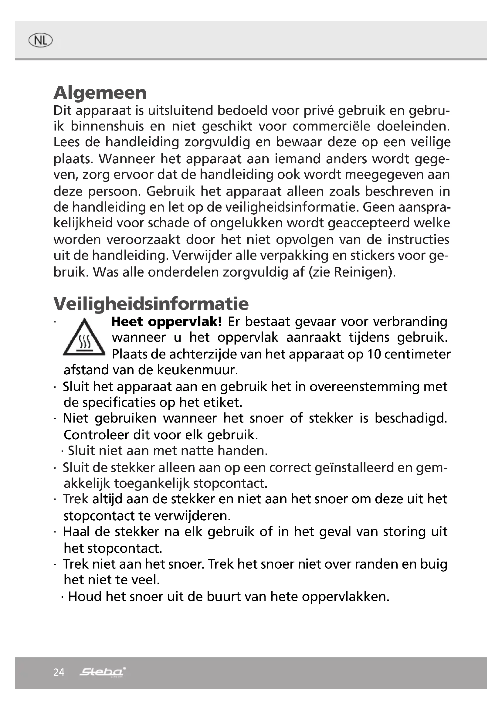 ∙ Lorsque les œufs sont cuits, un signal retentit. Éteignez l‘appareil. ∙ Enlevez légèrement le couvercle de l‘appareil pour que l‘eau de condensation puisse s’égoutter dans le bol de cuisson. ∙ Sortez le porte-œufs par les poignées et plonger dans l‘eau froide pour qu‘il ne durcisse pas.21 Garder au Chaud ∙ Si quelques œufs ne sont pas nécessaires, vous pouvez les garder au chaud dans l‘appareil. ∙ Mettez l’interrupteur à et fermez le couvercle. ∙ Après le garder au chaud, réglez le commutateur à « 0 » et débranchez la fiche du secteur. Œufs pochés ∙ Les œufs sont cuits sans coquille légèrement à la vapeur. ∙ Graissez légèrement le support à pocher avec beurre et mettez 1 œuf dans un moule. ∙ Versez 50 ml d‘eau (voir l’indication sur le gobelet gradué) dans le bol de cuisson et placez le support d’œufs. ∙ Placez le support à pocher sut le support à œufs et fermez le couvercle. ∙ Réglez le commutateur rotatif sur Cuisson I, le voyant s’allume. ∙ Lorsque les œufs sont cuits, un signal retentit. Éteignez l‘appareil et retirez délica- tement les œufs avec une petite cuillère. ∙ La consistance des œufs peut être réglée avec la quantité d’eau (plus dure: plus d’eau ; plus douce: moins d’eau).22 Evacuation correcte de ce produit: Mettre les appareils usagés immédiatement au rebut. Au sein de l‘UE, ce symbole indique que le produit ne doit pas être jeté avec les déchets ménagers. Les anciens appareils contiennent des matériaux de valeur recyclables qui doivent être valorisés afin d‘éviter toute atteinte à l‘environnement ou à la santé humaine due à une élimination incorrecte des déchets. Les anciens appareils doivent par conséquent être mis au rebut via des systèmes de collecte appropriés ou ramenés à cet effet au point de vente où ils ont été achetés. Les appareils seront alors confiés à un centre de recyclage des matériaux. Élimination de l‘emballage Ne pas jeter l‘emballage avec les déchets ménagers, mais avec les déchets recyclables. Jeter les emballages en papier, carton et carton ondulé aux points de collecte de vi- eux papiers. Les composants d‘emballage en plastique et les films doivent également être jetés dans les conteneurs prévus à cet effet. Exemples d‘identification des plastiques : PE pour le polyéthylène, code 02 pour le PEHD, 04 pour le PEBD, PP pour le polypropylène, PS pour le polystyrène. Service après-vente Si, contre toute attente, l‘appareil doit être confié au service après-vente, nous con- tacter aux coordonnées suivantes. En cas de garantie applicable, nous nous charge- ons de l‘enlèvement de l‘appareil. L‘appareil doit être correctement emballé pour le transport. Les paquets non affranchis ne pourront pas être pris en charge ! STEBA Elektrogeräte GmbH & Co KG Pointstr. 2, 96129 Strullendorf / Allemagne tél. service commercial : 09543 / 449-17 / -18, tél. S.A.V. : 09543 / 449-44, fax : 09543 / 449-19 e-mail : elektro@steba.com Internet : http://www.steba.com Attention ! Les appareils électriques doivent être réparés exclusivement par des élec- triciens qualifiés, les réparations non conformes pouvant entraîner des conséquences graves.2324 Algemeen Dit apparaat is uitsluitend bedoeld voor privé gebruik en gebru- ik binnenshuis en niet geschikt voor commerciële doeleinden. Lees de handleiding zorgvuldig en bewaar deze op een veilige plaats. Wanneer het apparaat aan iemand anders wordt gege- ven, zorg ervoor dat de handleiding ook wordt meegegeven aan deze persoon. Gebruik het apparaat alleen zoals beschreven in de handleiding en let op de veiligheidsinformatie. Geen aanspra- kelijkheid voor schade of ongelukken wordt geaccepteerd welke worden veroorzaakt door het niet opvolgen van de instructies uit de handleiding. Verwijder alle verpakking en stickers voor ge- bruik. Was alle onderdelen zorgvuldig af (zie Reinigen). Veiligheidsinformatie ∙ Heet oppervlak! Er bestaat gevaar voor verbranding wanneer u het oppervlak aanraakt tijdens gebruik. Plaats de achterzijde van het apparaat op 10 centimeter afstand van de keukenmuur. ∙ Sluit het apparaat aan en gebruik het in overeenstemming met de specificaties op het etiket. ∙ Niet gebruiken wanneer het snoer of stekker is beschadigd. Controleer dit voor elk gebruik. ∙ Sluit niet aan met natte handen. ∙ Sluit de stekker alleen aan op een correct geïnstalleerd en gem- akkelijk toegankelijk stopcontact. ∙ Trek altijd aan de stekker en niet aan het snoer om deze uit het stopcontact te verwijderen. ∙ Haal de stekker na elk gebruik of in het geval van storing uit het stopcontact. ∙ Trek niet aan het snoer. Trek het snoer niet over randen en buig het niet te veel. ∙ Houd het snoer uit de buurt van hete oppervlakken.25 ∙ Het apparaat kan worden gebruikt door kinderen van 8 jaar en ouder en door personen met beperkte fysieke, sensorische of mentale capaciteiten of gebrek aan ervaring/ kennis, op voorwaarde dat er toezicht gehouden wordt of in- structies hebben gekregen over veilig gebruik van het apparaat en bewust zijn van de gevaren die hierbij komen kijken. Kin- deren mogen de verpakking niet als speelgoed gebruiken. Rei- niging en gebruikersonderhoud mogen niet door kinderen worden uitgevoerd, tenzij ze 8 jaar of ouder zijn en onder toe- zicht staan. ∙ Kinderen onder de 8 jaar moeten uit de buurt van het apparaat en de stroomkabel worden gehouden. ∙ Kinderen moeten onder toezicht staan om ervoor te zorgen dat ze niet met het apparaat of verpakkingsmateriaal spelen (bij- voorbeeld plastic zakken) ∙ Het apparaat mag niet worden bediend met behulp van een externe timer of een afzonderlijk system op afstand. ∙ Laat het apparaat nooit onbeheerd achter tijdens gebruik. ∙ Laat het apparaat niet buiten of in een vochtige ruimte achter. ∙ Dompel het apparaat nooit in water. ∙ Laat een ruimte van ongeveer 10 cm rond het appara