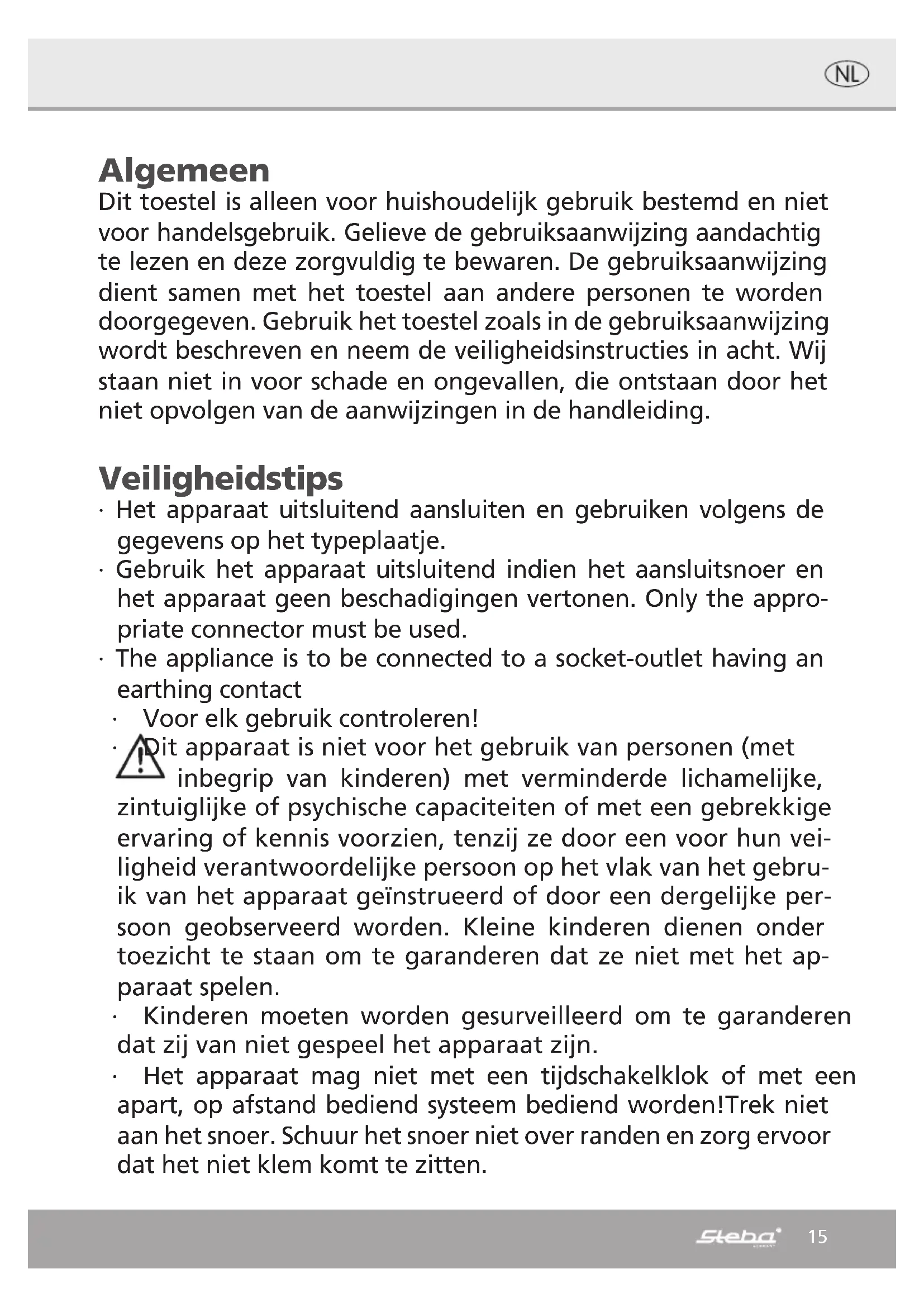 63 dB(A) Vitesse maximale de l‘air c 3,9 mètres/sec Norme de mesure de la valeur de service IEC 60879:1986(CORR.1992) Coordonnées de contact pour tout complé- ment d‘information Steba Elektrogeräte GmbH & Co.KG Pointstr. 2 96129 Strullendorf14 Evacuation correcte de ce produit: Mettre les appareils usagés immédiatement au rebut. Au sein de l‘UE, ce symbole indique que le produit ne doit pas être jeté avec les déchets ménagers. Les anciens appareils contiennent des matériaux de valeur recyclables qui doivent être valorisés afin d‘éviter toute atteinte à l‘environnement ou à la santé humaine due à une élimination incorrecte des déchets. Les anciens appareils doivent par conséquent être mis au rebut via des systèmes de collecte appropriés ou ramenés à cet effet au point de vente où ils ont été achetés. Les appareils seront alors confiés à un centre de recyclage des matériaux. Élimination de l‘emballage Ne pas jeter l‘emballage avec les déchets ménagers, mais avec les déchets recyclables. Jeter les emballages en papier, carton et carton ondulé aux points de collecte de vi- eux papiers. Les composants d‘emballage en plastique et les films doivent également être jetés dans les conteneurs prévus à cet effet. Exemples d‘identification des plastiques : PE pour le polyéthylène, code 02 pour le PEHD, 04 pour le PEBD, PP pour le polypropylène, PS pour le polystyrène. Service après-vente Si, contre toute attente, l‘appareil doit être confié au service après-vente, nous con- tacter aux coordonnées suivantes. En cas de garantie applicable, nous nous charge- ons de l‘enlèvement de l‘appareil. L‘appareil doit être correctement emballé pour le transport. Les paquets non affranchis ne pourront pas être pris en charge ! STEBA Elektrogeräte GmbH & Co KG Pointstr. 2, 96129 Strullendorf / Allemagne tél. service commercial : 09543 / 449-17 / -18, tél. S.A.V. : 09543 / 449-44, fax : 09543 / 449-19 e-mail : elektro@steba.com Internet : http://www.steba.com Attention ! Les appareils électriques doivent être réparés exclusivement par des élec- triciens qualifiés, les réparations non conformes pouvant entraîner des conséquences graves.15 Algemeen Dit toestel is alleen voor huishoudelijk gebruik bestemd en niet voor handelsgebruik. Gelieve de gebruiksaanwijzing aandachtig te lezen en deze zorgvuldig te bewaren. De gebruiksaanwijzing dient samen met het toestel aan andere personen te worden doorgegeven. Gebruik het toestel zoals in de gebruiksaanwijzing wordt beschreven en neem de veiligheidsinstructies in acht. Wij staan niet in voor schade en ongevallen, die ontstaan door het niet opvolgen van de aanwijzingen in de handleiding. Veiligheidstips ∙ Het apparaat uitsluitend aansluiten en gebruiken volgens de gegevens op het typeplaatje. ∙ Gebruik het apparaat uitsluitend indien het aansluitsnoer en het apparaat geen beschadigingen vertonen. Only the appro- priate connector must be used. ∙ The appliance is to be connected to a socket-outlet having an earthing contact ∙ Voor elk gebruik controleren! ∙ Dit apparaat is niet voor het gebruik van personen (met inbegrip van kinderen) met verminderde lichamelijke, zintuiglijke of psychische capaciteiten of met een gebrekkige ervaring of kennis voorzien, tenzij ze door een voor hun vei- ligheid verantwoordelijke persoon op het vlak van het gebru- ik van het apparaat geïnstrueerd of door een dergelijke per- soon geobserveerd worden. Kleine kinderen dienen onder toezicht te staan om te garanderen dat ze niet met het ap- paraat spelen. ∙ Kinderen moeten worden gesurveilleerd om te garanderen dat zij van niet gespeel het apparaat zijn. ∙ Het apparaat mag niet met een tijdschakelklok of met een apart, op afstand bediend systeem bediend worden!Trek niet aan het snoer. Schuur het snoer niet over randen en zorg ervoor dat het niet klem komt te zitten.16 ∙ Zet de schakelaar op „O” wanneer het apparaat niet gebruikt wordt ∙ Bewaar het apparaat niet buiten. ∙ Dompel het apparaat niet in water. ∙ Gebruik het apparaat nooit na verkeerd gebruik, bijvoorbeeld wanneer het apparaat is gevallen of op een andere manier is beschadigd. ∙ De fabrikant is niet verantwoordelijk voor de gevolgen van ver- keerd gebruik die door het niet respecteren van de gebruik- saanwijzing zijn veroorzaakt. ∙ Om gevaren te vermijden mogen reparaties aan het apparaat – bijv. het vervangen van een beschadigd aansluitsnoer – uitslu- itend worden uitgevoerd door de klantenservice. ∙ Blaas niet met het apparaat in vuur (bijvoorbeeld open haarden, kaarsen etc). Let erop dat de aanzuiging en uit- blaasopening niet afgedekt worden. Veiligheidsinstructies bij het gebruik van het apparaat: ∙ Apparaat uitsluitend op randaardestopcontact aansluiten ∙ Apparaat uitsluitend in de gemonteerde toestand gebruiken. ∙ Het netsnoer zodanig leggen, dat het uitgesloten is dat het tijdens de werking onopzettelijk aangeraakt of uitgetrokken wordt. ∙ Voordat het apparaat van de standplaats verwijderd wordt, stekker uit het stopcontact trekken. ∙ Na gebruik en telkens vóór reiniging netstekker uittrekken. Schoonmaak en onderhoud ∙ Trek de stekker altijd uit de wandcontactdoos vóór het schoon- maken. ∙ Dompel het apparaat nooit in water. ∙ Maak het apparaat schoon met een vochtige doek. ∙ Als de ventilatieroosters stoffig zijn, kan men met een stofzu- iger de roosters afzuigen17 Montage: Het apparaat tijdens de montage niet aansluiten Speld de buizen op de bo- gen en schroef deze met 4 schroeven vast. Werkplek: Belangrijk: Plaats het apparaat op een vlakke, stabiele ondergrond. Zet het apparaat niet direct vóór personen en dieren In het belang van uw gezondheid kiest u de correcte luchtsnelheid Als er zich aanzuigbare voorwerpen (bijvoorbeeld gordijnen) in de nabijheid bevin- den Werkwijze (werking): Het apparaat heeft 3 luchtsnelheden „O - 1 - 2 - 3“ en kan 90° gedraaid worden. Winter: d