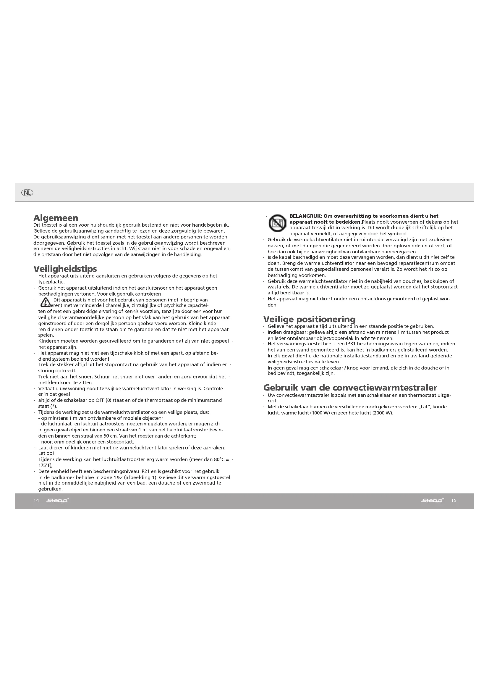 BELANGRIJK: Om oververhitting te voorkomen dient u het apparaat nooit te bedekken.Plaats nooit voorwerpen of dekens op het apparaat terwijl dit in werking is. Dit wordt duidelijk schriftelijk op het apparaat vermeldt, of aangegeven door het symbool Gebruik de warmeluchtventilator niet in ruimtes die verzadigd zijn met explosieve ∙ gassen, of met dampen die gegenereerd worden door oplosmiddelen of verf, of hoe dan ook bij de aanwezigheid van ontvlambare dampen/gassen. Is de kabel beschadigd en moet deze vervangen worden, dan dient u dit niet zelf te ∙ doen. Breng de warmeluchtventilator naar een bevoegd reparatiecentrum omdat de tussenkomst van gespecialiseerd personeel vereist is. Zo wordt het risico op beschadiging voorkomen. Gebruik deze warmeluchtventilator niet in de nabijheid van douches, badkuipen of ∙ wastafels. De warmeluchtventilator moet zo geplaatst worden dat het stopcontact altijd bereikbaar is. Het apparaat mag niet direct onder een contactdoos gemonteerd of geplast wor- ∙ den Veilige positionering Gelieve het apparaat altijd uitsluitend in een staande positie te gebruiken. ∙ Indien draagbaar: gelieve altijd een afstand van minstens 1 m tussen het product ∙ en ieder ontvlambaar object/oppervlak in acht te nemen. Het verwarmingstoestel heeft een IPX1 beschermingsniveau tegen water en, indien ∙ het aan een wand gemonteerd is, kan het in badkamers geïnstalleerd worden. In elk geval dient u de nationale installatiestandaard en de in uw land geldende veiligheidsinstructies na te leven. In geen geval mag een schakelaar / knop voor iemand, die zich in de douche of in ∙ bad bevindt, toegankelijk zijn. Gebruik van de convectiewarmtestraler Uw convectiewarmtestraler is zoals met een schakelaar en een thermostaat uitge- ∙ rust. Met de schakelaar kunnen de verschillende modi gekozen worden: „Uit“, koude ∙ lucht, warme lucht (1000 W) en zeer hete lucht (2000 W).16