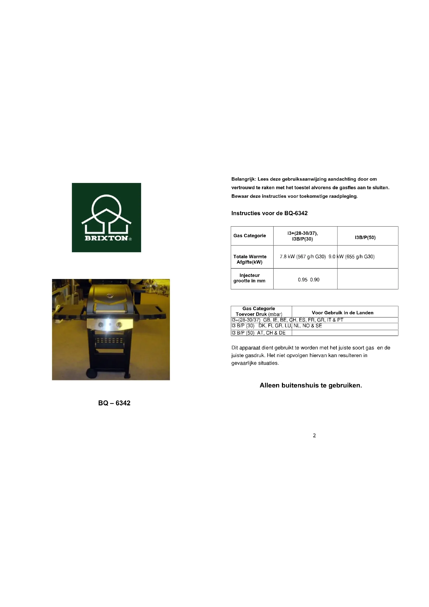 Belangrijk: Lees deze gebruiksaanwijzing aandachting door om vertrouwd te raken met het toestel alvorens de gasfles aan te sluiten. Bewaar deze instructies voor toekomstige raadpleging. Instructies voor de BQ-6342