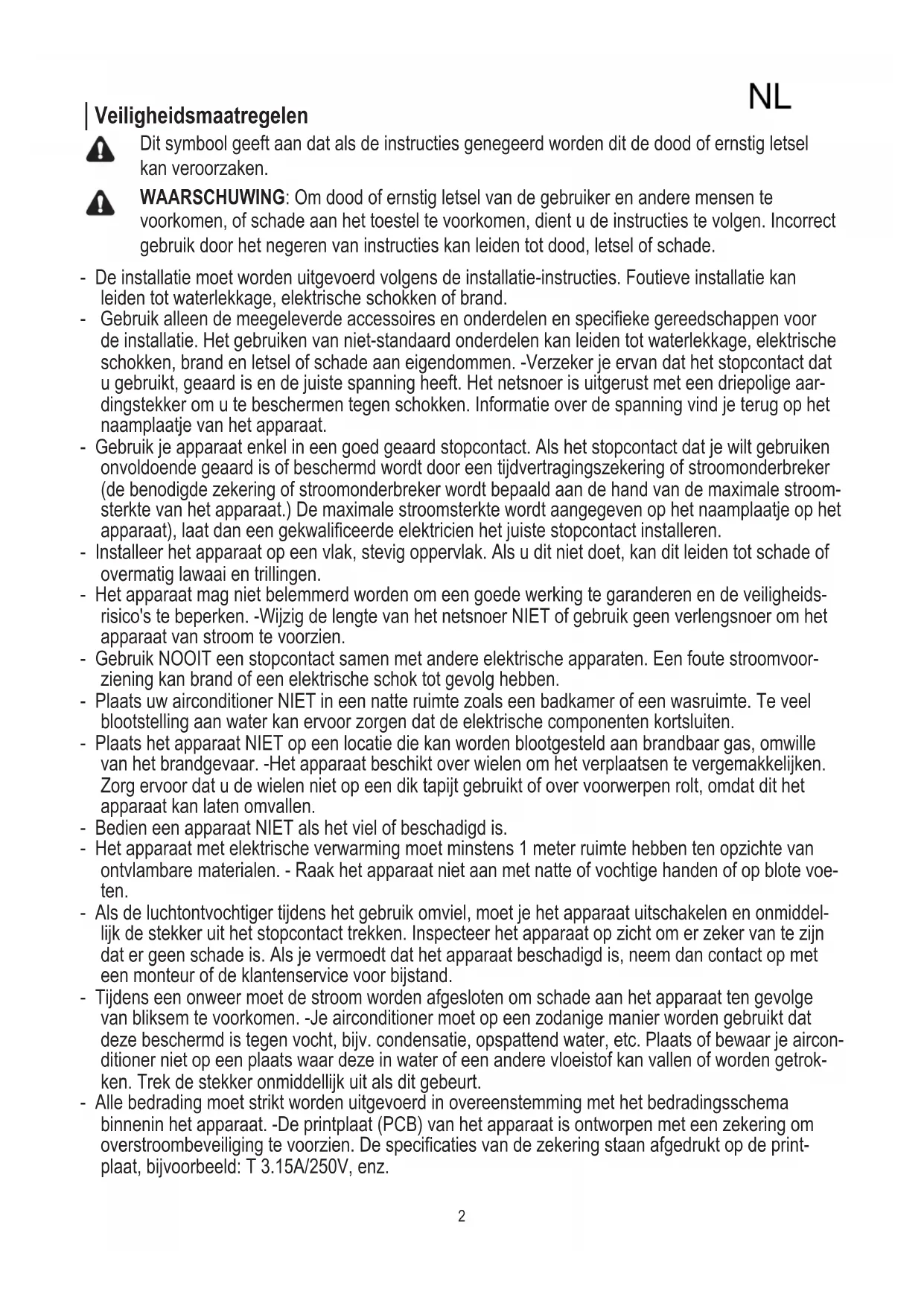 - Sociale Opmerking NL2 │Veiligheidsmaatregelen Dit symbool geeft aan dat als de instructies genegeerd worden dit de dood of ernstig letsel kan veroorzaken. WAARSCHUWING: Om dood of ernstig letsel van de gebruiker en andere mensen te voorkomen, of schade aan het toestel te voorkomen, dient u de instructies te volgen. Incorrect gebruik door het negeren van instructies kan leiden tot dood, letsel of schade. - De installatie moet worden uitgevoerd volgens de installatie-instructies. Foutieve installatie kan leiden tot waterlekkage, elektrische schokken of brand. - Gebruikalleendemeegeleverdeaccessoiresenonderdelenenspeciekegereedschappenvoor de installatie. Het gebruiken van niet-standaard onderdelen kan leiden tot waterlekkage, elektrische schokken, brand en letsel of schade aan eigendommen. -Verzeker je ervan dat het stopcontact dat u gebruikt, geaard is en de juiste spanning heeft. Het netsnoer is uitgerust met een driepolige aar- dingstekker om u te beschermen tegen schokken. Informatie over de spanning vind je terug op het naamplaatje van het apparaat. - Gebruik je apparaat enkel in een goed geaard stopcontact. Als het stopcontact dat je wilt gebruiken onvoldoende geaard is of beschermd wordt door een tijdvertragingszekering of stroomonderbreker (de benodigde zekering of stroomonderbreker wordt bepaald aan de hand van de maximale stroom- sterkte van het apparaat.) De maximale stroomsterkte wordt aangegeven op het naamplaatje op het apparaat),laatdaneengekwaliceerdeelektricienhetjuistestopcontactinstalleren. - Installeer het apparaat op een vlak, stevig oppervlak. Als u dit niet doet, kan dit leiden tot schade of overmatig lawaai en trillingen. - Het apparaat mag niet belemmerd worden om een goede werking te garanderen en de veiligheids- risico's te beperken. -Wijzig de lengte van het netsnoer NIET of gebruik geen verlengsnoer om het apparaat van stroom te voorzien. - Gebruik NOOIT een stopcontact samen met andere elektrische apparaten. Een foute stroomvoor- ziening kan brand of een elektrische schok tot gevolg hebben. - Plaats uw airconditioner NIET in een natte ruimte zoals een badkamer of een wasruimte. Te veel blootstelling aan water kan ervoor zorgen dat de elektrische componenten kortsluiten. - Plaats het apparaat NIET op een locatie die kan worden blootgesteld aan brandbaar gas, omwille van het brandgevaar. -Het apparaat beschikt over wielen om het verplaatsen te vergemakkelijken. Zorg ervoor dat u de wielen niet op een dik tapijt gebruikt of over voorwerpen rolt, omdat dit het apparaat kan laten omvallen. - Bedien een apparaat NIET als het viel of beschadigd is. - Het apparaat met elektrische verwarming moet minstens 1 meter ruimte hebben ten opzichte van ontvlambare materialen. - Raak het apparaat niet aan met natte of vochtige handen of op blote voe- ten. - Als de luchtontvochtiger tijdens het gebruik omviel, moet je het apparaat uitschakelen en onmiddel- lijk de stekker uit het stopcontact trekken. Inspecteer het apparaat op zicht om er zeker van te zijn dat er geen schade is. Als je vermoedt dat het apparaat beschadigd is, neem dan contact op met een monteur of de klantenservice voor bijstand. - Tijdens een onweer moet de stroom worden afgesloten om schade aan het apparaat ten gevolge van bliksem te voorkomen. -Je airconditioner moet op een zodanige manier worden gebruikt dat deze beschermd is tegen vocht, bijv. condensatie, opspattend water, etc. Plaats of bewaar je aircon- ditioner niet op een plaats waar deze in water of een andere vloeistof kan vallen of worden getrok- ken. Trek de stekker onmiddellijk uit als dit gebeurt. - Alle bedrading moet strikt worden uitgevoerd in overeenstemming met het bedradingsschema binnenin het apparaat. -De printplaat (PCB) van het apparaat is ontworpen met een zekering om overstroombeveiligingtevoorzien.Despecicatiesvandezekeringstaanafgedruktopdeprint- plaat, bijvoorbeeld: T 3.15A/250V, enz. NL3 │Voorzorgen Voorzorgen - Dit apparaat kan worden gebruikt door kinderen van 8 jaar en ouder en personen met verminderde fysieke, sensorische of mentale capaciteiten of gebrek aan ervaring en kennis als zij onder toezicht staan of instructies gekregen hebben over het gebruik van het apparaat op een veilige manier en de betrokken gevaren begrijpen. Kinderen mogen niet met het apparaat spelen. Reiniging en gebrui- kersonderhoud mag niet door kinderen worden gedaan als ze niet onder toezicht staan (van toepas- sing voor Europese landen) - Dit apparaat is niet bedoeld voor gebruik door personen (inclusief kinderen) met beperkte fysieke, sensorische of mentale capaciteiten of gebrek aan ervaring en kennis, tenzij ze onder toezicht staan of instructies gekregen hebben over het gebruik van het apparaat door een persoon die verantwoor- delijk is voor hun veiligheid. (van toepassing voor alle landen behalve Europese landen) - Kinderen moeten onder toezicht staan om er zeker van te zijn dat niet met het apparaat spelen. Kinderen moeten steeds onder toezicht staan in de buurt van het apparaat - Als het netsnoer beschadigd is, moet het worden vervangen door de fabrikant, zijn onderhoudsver- tegenwoordigerofpersonenmetvergelijkbarekwalicatiesomgevaartevoorkomen. - Voor het reinigen of ander onderhoud, moet het apparaat losgekoppeld worden van de stroomvoor- ziening. - Verwijder geen vaste deksels. Gebruik dit apparaat nooit als het niet goed werkt of als het viel of beschadigd is. - Leg het snoer niet onder een tapijt. Bedek het snoer niet met vloerkleden, -lopers of gelijkaardige vloerbekleding. Leid het snoer niet onder meubels of apparaten. Leg het snoer uit de buurt van het verkeersgebied en waar men er niet kan over struikelen. - Gebruik het apparaat niet als het een beschadigd snoer, stekker, zekering of stroomonderbreker heeft. Voer het apparaat af of retourneer het naar een erkend servicepunt voor nazicht en/of herstel- ling. - Om het risico op brand of elektrische schokken te verminderen mag je deze ventilator niet gebruiken met een snelheidsstuur