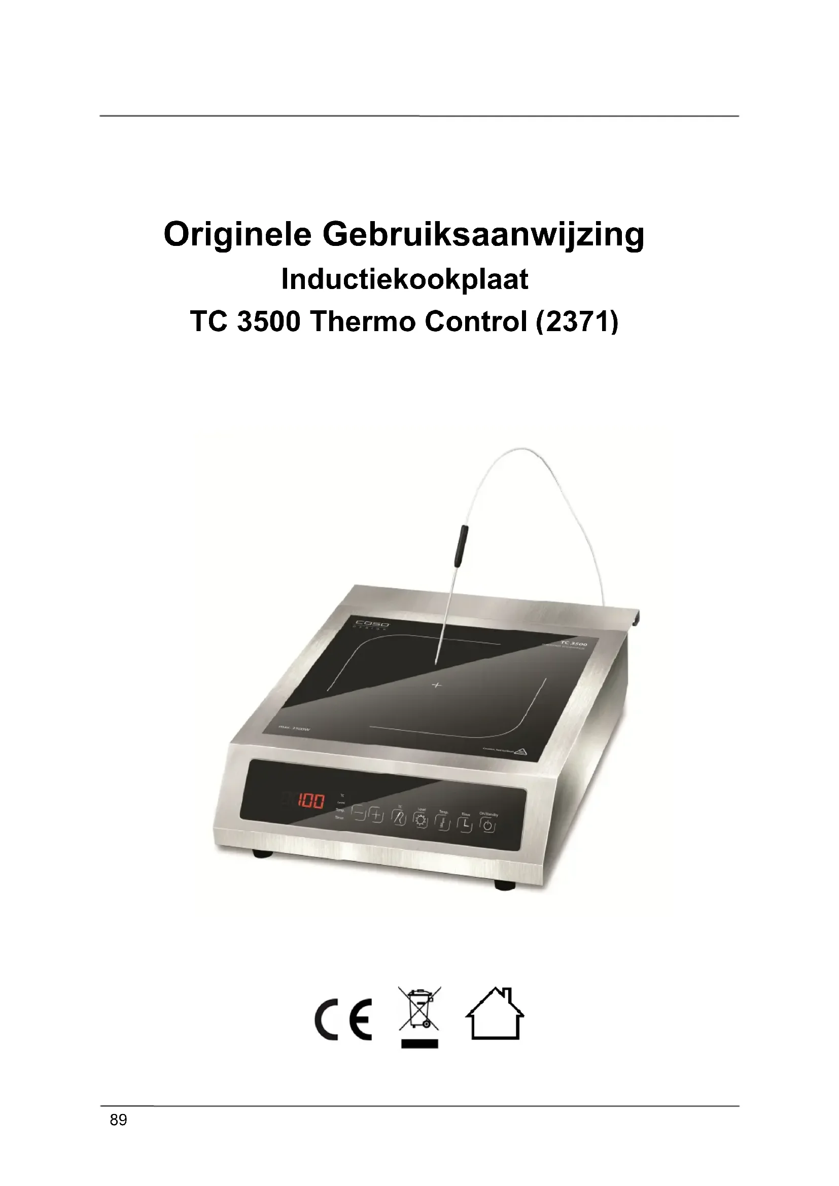 erhelpen Geen aanduiding Stekker er niet ingestopt Stekker erin steken Zekering niet ingeschakeld Zekering inschakelen TIP ► Als u met de bovengenoemde stappen het probleem niet kunt verhelpen, neem dan contact op met de klantendienst. 48 Afvoer van het oude apparaat Oude elektrische en elektronische apparaten bevatten vaak nog waardvolle materialen. Ze bevatten echter ook schadelijke stoffen, die voor hun functioneren en veiligheid noodzakelijk waren. In het huishoudelijk afval of bij verkeerde behandeling kunnen deze stoffen de menselijke gezondheid en het milieu schade aanbrengen. Zet uw oude apparaat daarom nooit bij het gewone huishoudelijk vuil. Tip ► Maak gebruik van de in uw woonplaats voorhanden zijnde inzamelplek voor teruggave en verwerking van oude elektrische en elektronische apparaten. Haal eventueel informatie bij uw gemeentehuis, de vuilnisophaaldienst of bij uw winkelier. ► Zorg ervoor dat uw oude apparaat tot het moment van transport op een kinderveilige plek wordt bewaard.107 49 Garantie Wij verlenen u op de Caso inductiekookplaat TC 3500 Thermo Control 1 jaar GARANTIE. Voor dit product geven we vanaf de dag van aankoop 12 maanden garantie op gebreken, die te herleiden zijn tot productie- of materiaalfouten. Garantieclaims volgens §439 ff. BGB-E blijven hiervan van kracht. Onder de garantie vallen niet de schaden die door onjuiste behandeling of ingebruikname ontstaan zijn, zoals gebreken die de functie of de waarde van het apparaat slechts gering beïnvloeden. Verder zijn aan slijtage onderhevige onderdelen, transportschade zo lang wij deze niet te verantwoorden hebben, als ook schaden, die door niet door ons verrichtte reparaties ontstaan zijn, uitgesloten van aanspraak op garantieclaim. Dit apparaat is vervaardigd voor bedrijfsdoeleinden en voorzien van een overeenkomstig vermogen. Bij rechtmatige reclamaties zullen wij het defecte apparaat naar ons bevinden repareren of tegen een apparaat vrij van gebreken omwisselen. Zichtbare defecten moeten binnen 14 dagen na levering aangetoond worden. Verdere claims zijn uitgesloten. Stelt u zich voor het indienen van een garantieclaim en het terugsturen van uw apparaat via onderstaand adres (altijd met bewijs van koop!) met ons in verbinding. 50 Technische gegevens Apparaat Inductiekookplaat Model TC 3500 Thermo Control (2371) Aansluitgegevens 220V-240V,50Hz/60Hz Vermogensopname 3500W Standby “volgens ErP niveau 2” Temperatuurbereik 60°C – 240 °C (internet thermometer) 40°C – 160 °C (externe thermometer) Afmetingen buitenkant (B/H/D) 35,5 x 11 x 46 cm Netto gewicht 5,5 kg108 Manual del usuario Placa de inducción TC 3500 Thermo Control (2371)109 51 Manual del usuario