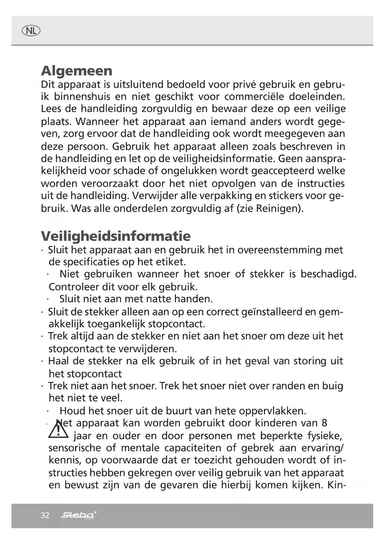Danger ! Attention ! Le couteau est très tranchant ! Risqué de blessure ! ∙ Allumez l’appareil et ajoutez les aliments à l’aide du poussoir. Nettoyage ∙ Débranchez l’appareil. ∙ Retirez la râpe multi et lavez soigneusement toutes les pièces à l’eau savonneuse. La râpe multi pour le hachoir à viande MG 3000 PRO avec la référence 99-47-00 est disponible chez Steba Service.31 Evacuation correcte de ce produit: Mettre les appareils usagés immédiatement au rebut. Au sein de l‘UE, ce symbole indique que le produit ne doit pas être jeté avec les déchets ménagers. Les anciens appareils contiennent des matériaux de valeur recyclables qui doivent être valorisés afin d‘éviter toute atteinte à l‘environnement ou à la santé humaine due à une élimination incorrecte des déchets. Les anciens appareils doivent par conséquent être mis au rebut via des systèmes de collecte appropriés ou ramenés à cet effet au point de vente où ils ont été achetés. Les appareils seront alors confiés à un centre de recyclage des matériaux. Élimination de l‘emballage Ne pas jeter l‘emballage avec les déchets ménagers, mais avec les déchets recyclables. Jeter les emballages en papier, carton et carton ondulé aux points de collecte de vi- eux papiers. Les composants d‘emballage en plastique et les films doivent également être jetés dans les conteneurs prévus à cet effet. Exemples d‘identification des plastiques : PE pour le polyéthylène, code 02 pour le PEHD, 04 pour le PEBD, PP pour le polypropylène, PS pour le polystyrène. Service après-vente Si, contre toute attente, l‘appareil doit être confié au service après-vente, nous con- tacter aux coordonnées suivantes. En cas de garantie applicable, nous nous charge- ons de l‘enlèvement de l‘appareil. L‘appareil doit être correctement emballé pour le transport. Les paquets non affranchis ne pourront pas être pris en charge ! STEBA Elektrogeräte GmbH & Co KG Pointstr. 2, 96129 Strullendorf / Allemagne tél. service commercial : 09543 / 449-17 / -18, tél. S.A.V. : 09543 / 449-44, fax : 09543 / 449-19 e-mail : elektro@steba.com Internet : http://www.steba.com Attention ! Les appareils électriques doivent être réparés exclusivement par des élec- triciens qualifiés, les réparations non conformes pouvant entraîner des conséquences graves.32 Algemeen Dit apparaat is uitsluitend bedoeld voor privé gebruik en gebru- ik binnenshuis en niet geschikt voor commerciële doeleinden. Lees de handleiding zorgvuldig en bewaar deze op een veilige plaats. Wanneer het apparaat aan iemand anders wordt gege- ven, zorg ervoor dat de handleiding ook wordt meegegeven aan deze persoon. Gebruik het apparaat alleen zoals beschreven in de handleiding en let op de veiligheidsinformatie. Geen aanspra- kelijkheid voor schade of ongelukken wordt geaccepteerd welke worden veroorzaakt door het niet opvolgen van de instructies uit de handleiding. Verwijder alle verpakking en stickers voor ge- bruik. Was alle onderdelen zorgvuldig af (zie Reinigen). Veiligheidsinformatie ∙ Sluit het apparaat aan en gebruik het in overeenstemming met de specificaties op het etiket. ∙ Niet gebruiken wanneer het snoer of stekker is beschadigd. Controleer dit voor elk gebruik. ∙ Sluit niet aan met natte handen. ∙ Sluit de stekker alleen aan op een correct geïnstalleerd en gem- akkelijk toegankelijk stopcontact. ∙ Trek altijd aan de stekker en niet aan het snoer om deze uit het stopcontact te verwijderen. ∙ Haal de stekker na elk gebruik of in het geval van storing uit het stopcontact ∙ Trek niet aan het snoer. Trek het snoer niet over randen en buig het niet te veel. ∙ Houd het snoer uit de buurt van hete oppervlakken. ∙ Het apparaat kan worden gebruikt door kinderen van 8 jaar en ouder en door personen met beperkte fysieke, sensorische of mentale capaciteiten of gebrek aan ervaring/ kennis, op voorwaarde dat er toezicht gehouden wordt of in- structies hebben gekregen over veilig gebruik van het apparaat en bewust zijn van de gevaren die hierbij komen kijken. Kin-33 deren mogen de verpakking niet als speelgoed gebruiken. Rei- niging en gebruikersonderhoud mogen niet door kinderen worden uitgevoerd, tenzij ze 8 jaar of ouder zijn en onder toe- zicht staan. ∙ Kinderen onder de 8 jaar moeten uit de buurt van het apparaat en de stroomkabel worden gehouden. ∙ Kinderen moeten onder toezicht staan om ervoor te zorgen dat ze niet met het apparaat of verpakkingsmateriaal spelen (bij- voorbeeld plastic zakken) ∙ Het apparaat mag niet worden bediend met behulp van een externe timer of een afzonderlijk system op afstand. ∙ Laat het apparaat nooit onbeheerd achter tijdens gebruik. ∙ Laat het apparaat niet buiten of in een vochtige ruimte achter. ∙ Dompel het apparaat nooit in water. ∙ Gebruik het apparaat nooit na een storing, bijvoorbeeld als het gevallen is of op een andere manier beschadigd is geraakt. ∙ De fabrikant is niet aansprakelijk voor de schade die ontstaat door gebruik van het apparaat op een andere manier dan be- schreven, of een fout in het gebruikt. ∙ Om letsel te voorkomen mogen reparaties zoals het vervangen van een beschadigd snoer alleen worden uitgevoerd door een reparatiedienst. Alleen originele onderdelen mogen worden gebruikt. ∙ Gebruik het apparaat alleen zoals beschreven is in deze hand- leiding. ∙ Dit apparaat is bedoeld om te gebruiken voor huishoudelijk setting, zoals: o personeelskeukens in winkels, kantoren en andere wer- komgevingen o door gasten in hotels, motels en andere type woonom- gevingen o bed & breakfast- achtige omgevingen. ∙ Voor het eerste gebruik: reinig alle delen zorgvuldig en laat deze drogen.34 ∙ Wanneer er een verlengkabel wordt gebruikt, moet deze een doorsnede van 1,5 mm² hebben. ∙ Als een GS-geteste 16 A multi-pin extensie wordt gebruikt, wordt deze met niet meer dan 3680 watt belast wegens brand- gevaar. ∙ Zorg ervoor dat kinderen niet met de