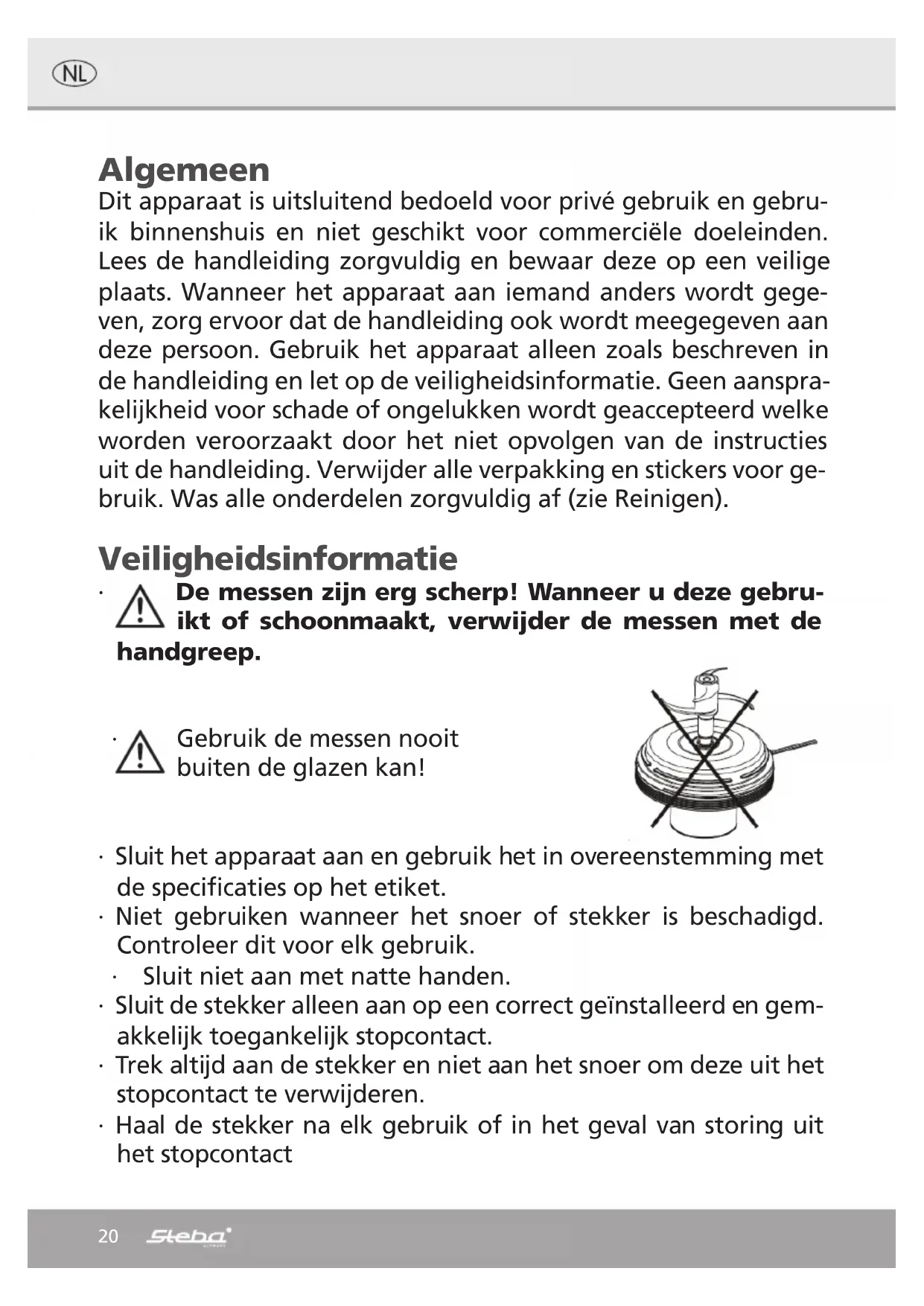 ∙ Leg de messenset op de messenhouder en vul het met voedesel. ∙ Plaats het deksel en het motorgedeelte erop. Kies het gewenste snelheidsniveau. ∙ Koppel het apparaat los voordat u het opent.25 Bescherming van de motor ∙ Gebruik het apparaat niet zonder voedsel. ∙ Laat het apparaat niet langer dan 15 tot 20 seconden draaien. ∙ Zorg voor een korte pauze van ca. 20 seconden tussen de werkstappen. ∙ Als de motor overbelast is, wordt de motorbeveiliging geactiveerd. Wacht onge- veer 30 minuten en start het apparaat opnieuw op. Correcte afvalverwijdering van dit product Versleten apparaten onmiddellijk onbruikbaar maken. Binnen de Europese Unie duidt dit symbool erop dat dit product niet samen met huishoudelijk afval verwijderd mag worden. Oude apparaten bevatten waardevolle, recycleerbare materialen, die aan recycling onderworpen moe- ten worden om het milieu c.q. de menselijke gezondheid niet door een onge- controleerde afvalverwijdering te schaden. Gelieve oude apparaten daarom via ge- schikte inzamelsystemen te verwijderen of het apparaat met het oog op de afvalverwijdering terug naar de afzender (waar u het product gekocht hebt) te zen- den. De afzender zal dan het apparaat aan een stoffelijke recycling onderwerpen. Evacuatie van de verpakking Verpakkingsmateriaal niet gewoon wegwerpen, maar aan recycling onderwerpen. Verpakkingen van papier, karton en gegolfd karton in verzamelcentra voor oud pa- pier afgeven. Onderdelen van kunststofverpakkingen en folie dienen eveneens in de daarvoor bestemde verzamelbakken gedeponeerd te worden. In de voorbeelden voor de kunststofbenaming staat: PE voor poly- ethyleen, het kencijfer 02 voor PE-HD, 04 voor PE-LD, PP voor poly- propyleen, PS voor polystyreen. Klantenserviceafdeling: Indien uw apparaat tegen de verwachting in dan toch al eens de klantenserviceaf- deling nodig heeft, gelieve u dan tot onderstaand adres te richten. Wij zullen dan in geval van garantie voor de afhaling zorgen. Het apparaat moet transporteerbaar verpakt zijn. Ongefrankeerde pakjes kunnen niet aanvaard worden! STEBA Elektrogeräte GmbH & Co KG Pointstr. 2, 96129 Strullendorf / Germany Verkopen-Tel.: 09543 / 449-17 / -18, Service-Tel.: 09543 / 449-44, Fax: 09543 / 449-19 e-Mail: elektro@steba.com Internet: http://www.steba.com Opgelet! Elektrische apparaten mogen uitsluitend door vakkundig geschoolde elek- triciens gerepareerd worden, omdat er door ondeskundige reparaties aanzienlijke gevolgschade kan ontstaan.26 Generelt Dette apparat er kun egnet til privat brug i husholdning og in- dendørs. Læs brugsanvisningen grundigt og gem den omhygge- ligt. Hvis apparatet gives videre til andre personer, skal brugsan- visningen følge med. Benyt apparatet som beskrevet og overhold sikkerhedsinstruktionerne. Producenten påtager sig intet ansvar for skader og ulykker, som skyldes manglende overholdelse af sikkerhedsinstruktionerne. Fjern al plastik m.m. og alle klistermærker. Vask grundigt alle dele (se rengøring) Sikkerhedsinstruktioner ∙ Knivende er meget skarpe! Ved rengøring efter brug, løftes knivene af ved brug af håndtaget.