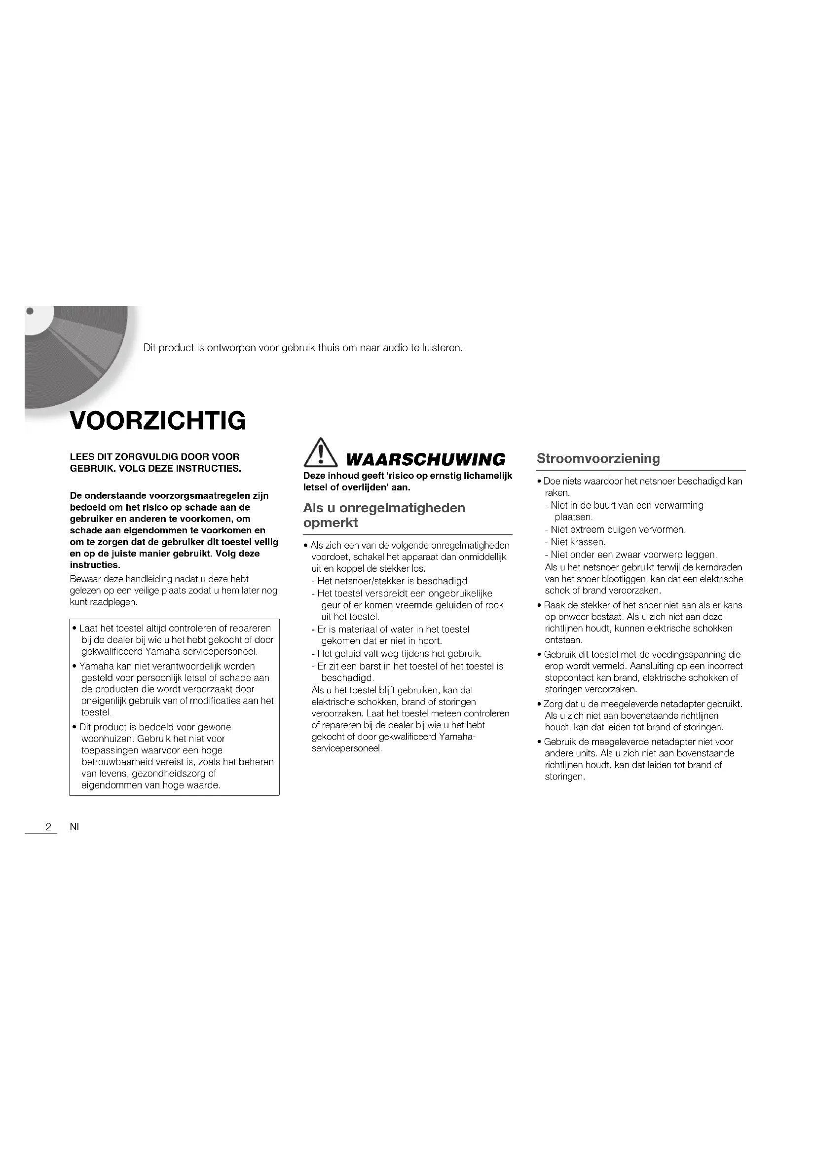 Dit product is ontworpen voor gebruik thuis om naar audio te luisteren. VOORZICHTIG