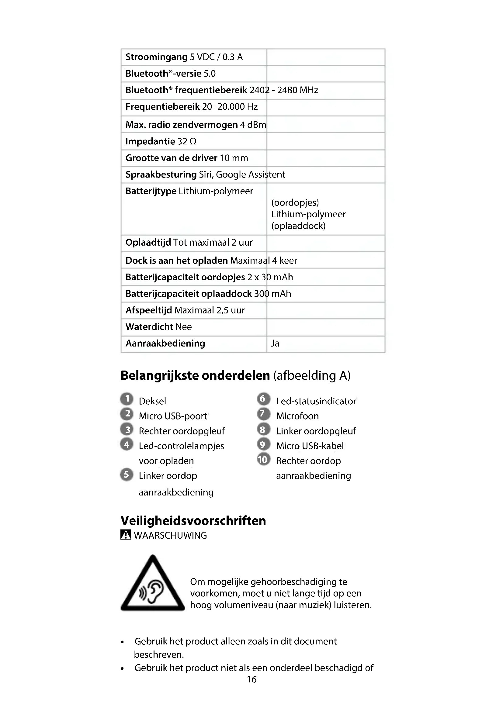 WAARSCHUWING Om mogelijke gehoorbeschadiging te voorkomen, moet u niet lange tijd op een hoog volumeniveau (naar muziek) luisteren.