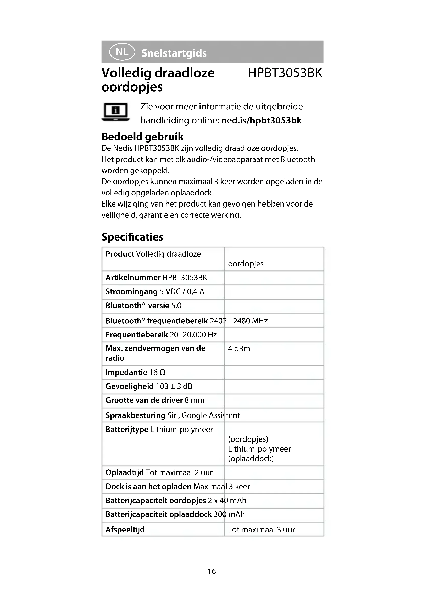 Snelstartgids Volledig draadloze oordopjes HPBT3053BK Zie voor meer informatie de uitgebreide handleiding online: ned.is/hpbt3053bk Bedoeld gebruik De Nedis HPBT3053BK zijn volledig draadloze oordopjes. Het product kan met elk audio-/videoapparaat met Bluetooth worden gekoppeld. De oordopjes kunnen maximaal 3 keer worden opgeladen in de volledig opgeladen oplaaddock. Elke wijziging van het product kan gevolgen hebben voor de veiligheid, garantie en correcte werking. Specicaties Product Volledig draadloze oordopjes Artikelnummer HPBT3053BK Stroomingang 5 VDC / 0,4 A Bluetooth®-versie 5.0 Bluetooth® frequentiebereik 2402 - 2480 MHz Frequentiebereik 20- 20.000 Hz Max. zendvermogen van de radio 4 dBm Impedantie 16 Ω Gevoeligheid 103 ± 3 dB Grootte van de driver 8 mm Spraakbesturing Siri, Google Assistent Batterijtype Lithium-polymeer (oordopjes) Lithium-polymeer (oplaaddock) Oplaadtijd Tot maximaal 2 uur Dock is aan het opladen Maximaal 3 keer Batterijcapaciteit oordopjes 2 x 40 mAh Batterijcapaciteit oplaaddock 300 mAh Afspeeltijd Tot maximaal 3 uur17 Waterdicht Nee Aanraakbediening Ja Belangrijkste onderdelen (afbeelding A)