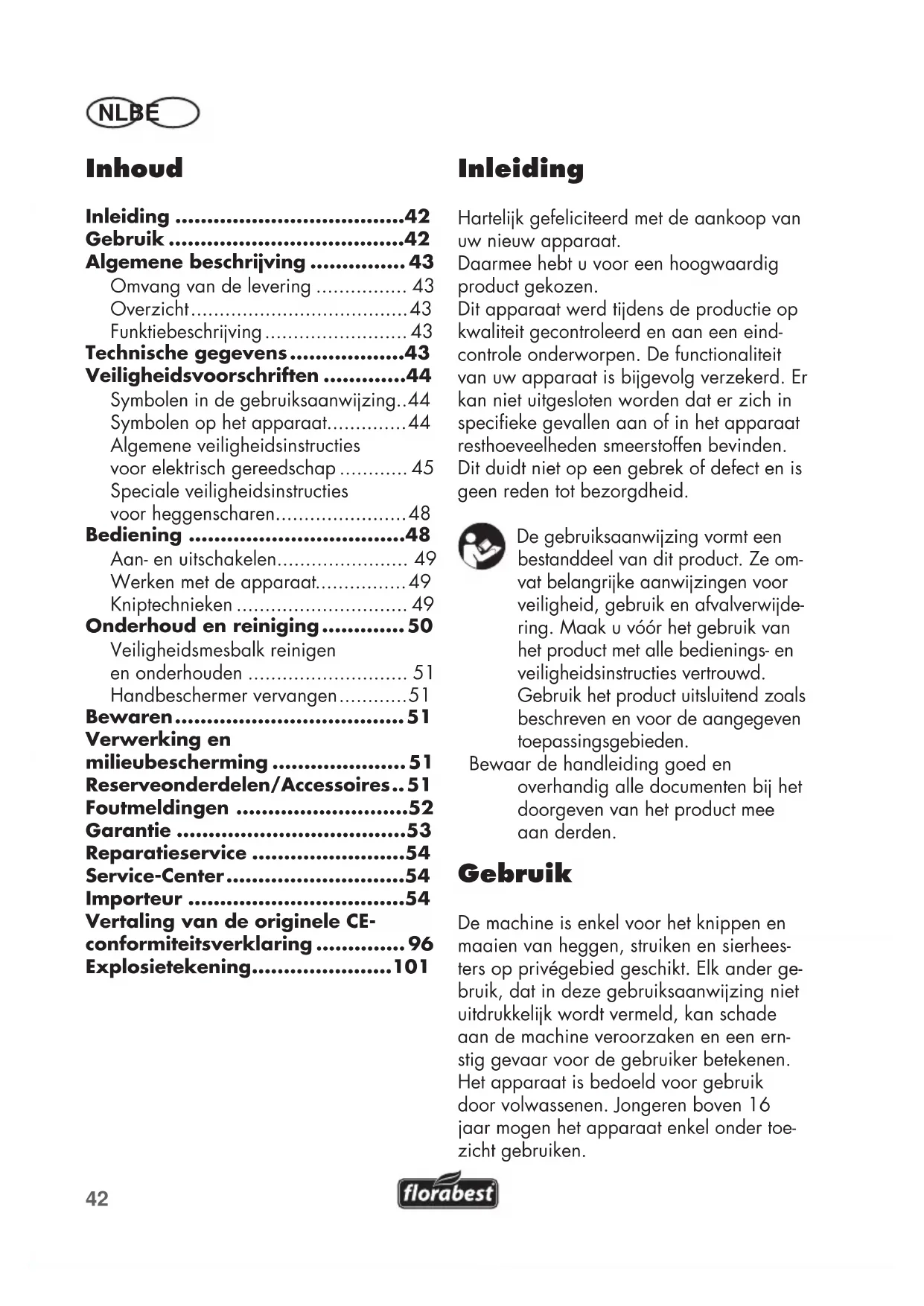 Inleiding Hartelk gefeliciteerd met de aankoop van uw nieuw apparaat. Daarmee hebt u voor een hoogwaardig product gekozen. Dit apparaat werd tdens de productie op kwaliteit gecontroleerd en aan een eind- controle onderworpen. De functionaliteit van uw apparaat is bgevolg verzekerd. Er kan niet uitgesloten worden dat er zich in specieke gevallen aan of in het apparaat resthoeveelheden smeerstoffen bevinden. Dit duidt niet op een gebrek of defect en is geen reden tot bezorgdheid. De gebruiksaanwzing vormt een bestanddeel van dit product. Ze om- vat belangrke aanwzingen voor veiligheid, gebruik en afvalverwde- ring. Maak u vóór het gebruik van het product met alle bedienings- en veiligheidsinstructies vertrouwd. Gebruik het product uitsluitend zoals beschreven en voor de aangegeven toepassingsgebieden. Bewaar de handleiding goed en overhandig alle documenten b het doorgeven van het product mee aan derden. Gebruik De machine is enkel voor het knippen en maaien van heggen, struiken en sierhees- ters op privégebied geschikt. Elk ander ge- bruik, dat in deze gebruiksaanwzing niet uitdrukkelk wordt vermeld, kan schade aan de machine veroorzaken en een ern- stig gevaar voor de gebruiker betekenen. Het apparaat is bedoeld voor gebruik door volwassenen. Jongeren boven 16 jaar mogen het apparaat enkel onder toe- zicht gebruiken. Vertaling van de originele CE- conformiteitsverklaring