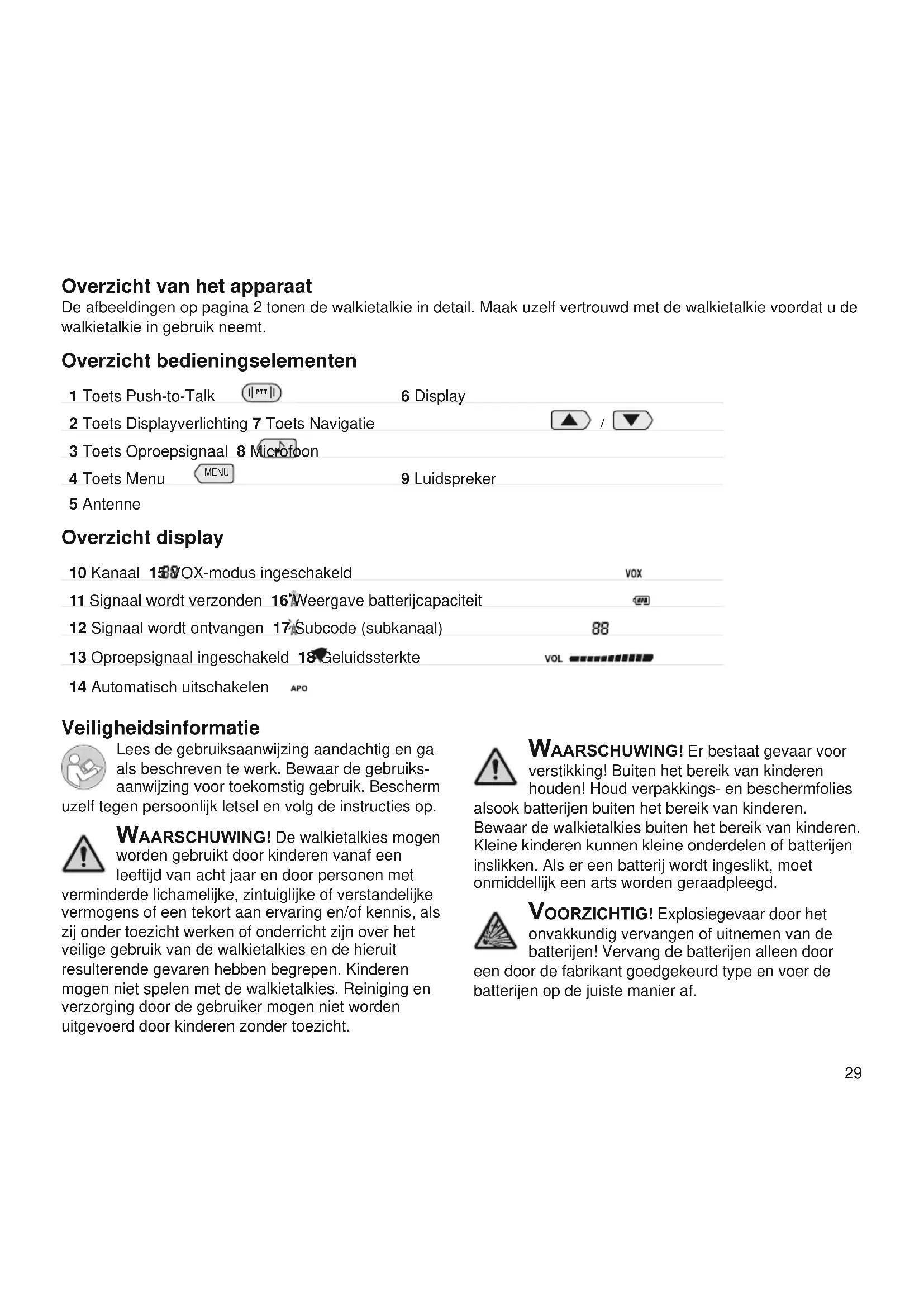 3 Toets Oproepsignaal 8 Microfoon 4 Toets Menu MENU 9 Luidspreker 5 Antenne Overzicht display 10 Kanaal 15 VOX-modus ingeschakeld 11 Signaal wordt verzonden 16 Weergave batterijcapaciteit 12 Signaal wordt ontvangen 17 Subcode (subkanaal) 13 Oproepsignaal ingeschakeld 18 Geluidssterkte 14 Automatisch uitschakelen Veiligheidsinformatie Lees de gebruiksaanwijzing aandachtig en ga als beschreven te werk Bewaar de gebruiks- aanwijzing voor toekomstig gebruik Bescherm uzelf tegen persoonlijk letsel en volg de instructies op WaarschuWing! De walkietalkies mogen worden gebruikt door kinderen vanaf een leeftijd van acht jaar en door personen met verminderde lichamelijke, zintuiglijke of verstandelijke vermogens of een tekort aan ervaring en/of kennis, als zij onder toezicht werken of onderricht zijn over het veilige gebruik van de walkietalkies en de hieruit resulterende gevaren hebben begrepen Kinderen mogen niet spelen met de walkietalkies Reiniging en verzorging door de gebruiker mogen niet worden uitgevoerd door kinderen zonder toezicht WaarschuWing! Er bestaat gevaar voor verstikking! Buiten het bereik van kinderen houden! Houd verpakkings- en beschermfolies alsook batterijen buiten het bereik van kinderen Bewaar de walkietalkies buiten het bereik van kinderen Kleine kinderen kunnen kleine onderdelen of batterijen inslikken Als er een batterij wordt ingeslikt, moet onmiddellijk een arts worden geraadpleegd Voorzichtig! Explosiegevaar door het onvakkundig vervangen of uitnemen van de batterijen! Vervang de batterijen alleen door een door de fabrikant goedgekeurd type en voer de batterijen op de juiste manier af30 Voorzichtig! De spraak wordt weergege- ven via de luidspreker Houd de walkietalkie bij het ontvangen van spraak op ongeveer 30 cm afstand Zo voorkomt u eventuele gehoorschade Belangrijk! Gebruik de walkietalkies niet in verboden of explosiegevaarlijke omgevingen! Volg de plaatselijke voorschriften op! Belangrijk! Bescherm uw walkietalkies tegen natheid, stof, vloeistoffen, chemicaliën, dampen, hitte en direct zonlicht Uw walkietal- kies zijn niet waterdicht, houd de apparaten droog Belangrijk! De walkietalkies bevatten geen onderdelen die moeten worden gerepa- reerd of vervangen door de gebruiker Repara- ties mogen uitsluitend worden uitgevoerd door gekwaliceerd personeel – neem hiervoor contact op met onze serviceafdeling Belangrijk! Gebruik het apparaat nooit in als zodanig gemarkeerde veiligheidszones en in gebieden die zijn afgesloten voor de particuliere radiocommunicatie Nood- en hulpdiensten kunnen niet worden opgeroepen met dit apparaat Belangrijk! Let op de lokale voorschriften mbt het gebruik van radioapparatuur, voordat u uw walkietalkie gebruikt Inhoud van de verpakking Controleer de inhoud van de verpakking van uw walkie- talkies, voordat u uw walkietalkies in gebruik neemt Als er iets ontbreekt of beschadigd is, neem contact op met onze service-afdeling 2x walkietalkie PMR 1208 2x riemclip Gebruiksaanwijzing Beoogd gebruik De walkietalkies zijn geschikt voor het communiceren met andere walkietalkies volgens dezelfde standaard (446 MHz PMR-net) Elk ander gebruik is niet toege- staan Eigenmachtige wijzigingen of ombouw zijn niet toegestaan Open het toestel in geen geval zelf en probeer het niet zelf te repareren Batterijen plaatsen Voordat u uw walkietalkie kunt gebruiken, moet u ge- schikte batterijen in uw walkietalkie plaatsen Gebruik alleen batterijen die voldoen aan de specicaties in de Technische gegevens Batterijen worden niet bijgeleverd 1 Neem de afdekking van het bat- terijvak af Gebruik daarvoor de uitsparing aan de onderkant van de afdekking van het batterijvak 2 Plaats drie geschikte batterijen in het batterijvak Let op de juiste polariteit 3 Zet de afdekking van het batterij- vak weer erop De afdekking van het batterijvak klikt hoorbaar vast Walkietalkie inschakelen 1 Druk op de toets MENU en houd hem ongeveer 3 seconden ingedrukt De walkietalkie wordt inge- schakeld, het display toont het geselecteerde kanaal 01 – 01, het volume en de huidige batterijcapaciteit Wanneer u nog slechts één streepje ziet, is de batterij bijna leeg Vervang de batterijen tijdig Walkietalkie uitschakelen 1 Druk de toets MENU in en houd hem ongeveer drie seconden ingedrukt De walkietalkie wordt uitge- schakeld, het display gaat uit31 Walkietalkie bedienen Als u via de walkietalkies wilt communiceren, moeten de walkietalkies ingeschakeld en op hetzelfde kanaal ingesteld zijn Voor een succesvolle verbinding moeten de walkietalkies zich bevinden binnen het ontvangstbe- reik De elementen die zijn geselecteerd in het menu, knip- peren als u de betreffende instelling aanpast Signaal verzenden en ontvangen 1 Druk de toets PTT in en houd hem ingedrukt Op het display verschijnt De walkietalkie bevindt zich in de zendmodus 2 Houd de walkietalkie vlak voor uw mond en spreek in de microfoon Alle walkietalkies die zich binnen het bereik bevinden en op hetzelfde kanaal ingesteld zijn, ontvangen uw bericht Op het display verschijnt