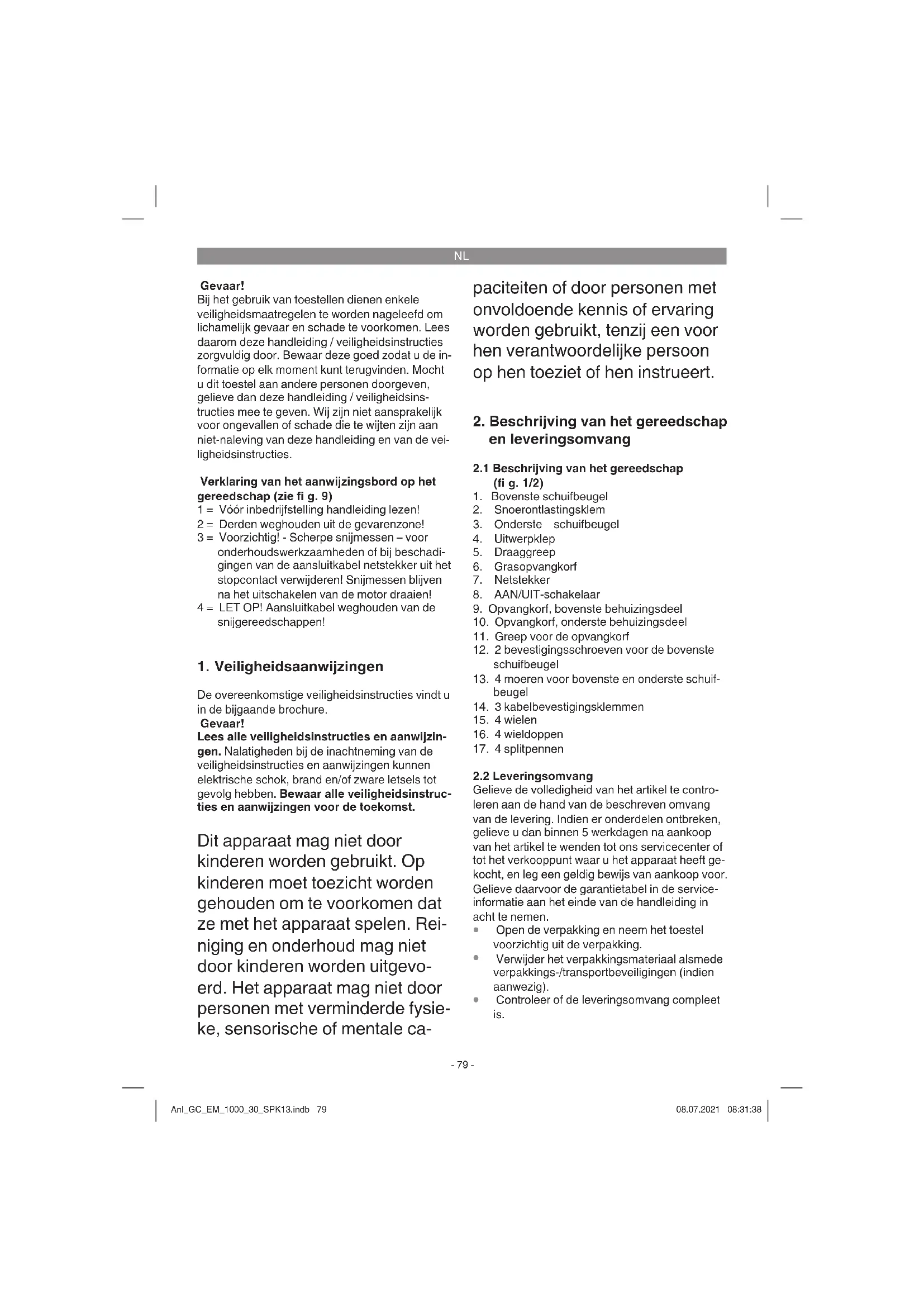 Sluit de aansluitkabel van het toestel aan op de netstekker (fi g. 1, pos. 7) en borg de aansluitkabel d.m.v. de kabeltrekontlastingsklem (fi g. 7). Beves- tigingsmiddelen (kabelhouder) voor de aanslu- itkabel van het toestel moeten verplicht worden gebruikt. Voorzichtig! Om het onbedoeld inschakelen te voorkomen is de grasmaaier voorzien van een beveiliging (fi g. 7, pos. 1), die moet worden ingedrukt voordat de schakelbeugel (fi g. 7, pos. 2) kan worden inge- drukt. Zodra u de schakelbeugel loslaat, wordt de grasmaaier uitgeschakeld. Voer deze procedure meermaals uit om er zeker van te zijn dat uw toestel correct werkt. Voordat u een herstelling of onderhoudswerkzaamheid op het toestel verricht dient u er zich van te vergewissen dat het mes niet draait en het toestel gescheiden is van het net. Waarschuwing! Open de uitwerpklep nooit als de grasopvanginrichting leeg wordt ge- maakt en de motor nog draait. Het roterende mes kan letsels veroorzaken. Maak de uitwerpklep of de grasopvangzak steeds zorgvuldig vast. Als u die wilt verwijderen, moet u voordien verplicht de motor stopzetten. De door de geleidestangen gegeven veiligheid- safstand tussen meskooi en gebruiker dient steeds in acht te worden genomen. Tijdens het maaien en veranderen van rijrichting op bermen en hellingen dient u bijzonder voorzichtig te werk te gaan. Let op een veilige stand, draag scho- enen met slipvaste zolen en een lange broek. Maai steeds dwars over de helling. Op hellingen van meer dan 15° mag om veilig- heidsredenen het gras niet met de maaier worden afgereden. Wees bijzonder voorzichtig bij het achteruit bewe- gen en trekken van de maaier. Struikelgevaar Instructies voor het correct maaien Voor het gras afrijden is een overlappende werk- wijze aan te bevelen. Maai enkel met een scherp en intact mes zodat de grashalmen niet uitrafelen en het gazon niet geel wordt. Om een keurig maaipatroon te bereiken leidt u de maaier in zo recht mogelijke banen. De banen moeten elkaar steeds overlappen met enkele centimeters, zodat er geen stroken blijven staan. Hoe vaak moet worden afgereden hangt in prin- cipe ervan af hoe snel het gras groeit. In de hoof- dgroeiperiode (mei – juni) twee keer per week, anders eenmaal per week. De maaihoogte moet tussen 4 en 6 cm liggen en het gras moet 4 tot 5 cm groeien voordat u het opnieuw afrijdt. Mocht het gras ooit wat langer worden, maak dan ach- teraf niet de fout het gras direct in één keer op de normale hoogte terug te snijden. Dit schaadt het gazon. Snij dan nooit meer dan de helft van de grashoogte terug. De onderkant van het koetswerk van de maaier schoon houden en afgezet gras zeker verwijde- ren. Afgezet materiaal bemoeilijkt het starten, doet afbreuk aan de maaikwaliteit en belemmert het uitwerpen van het gras. Anl_GC_EM_1000_30_SPK13.indb 82Anl_GC_EM_1000_30_SPK13.indb 82 08.07.2021 08:31:3808.07.2021 08:31:38NL