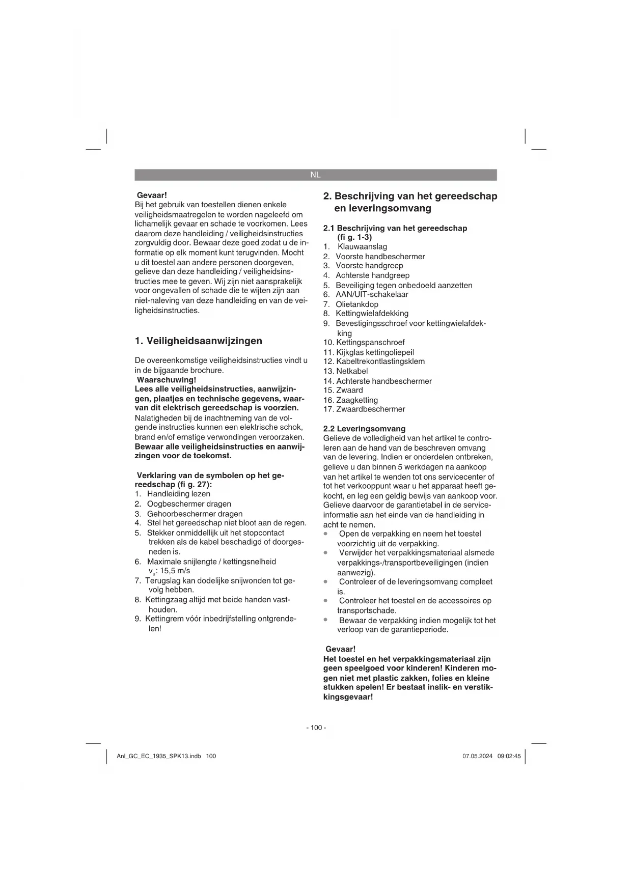 zetten. Gevaar! Gebruik de zaag niet als de veiligheid- sinrichtingen niet naar behoren werken. Probeer geen beschermende voorzieningen die belangrijk zijn voor de veiligheid zelf te herstellen, maar wendt u zich tot onze service of tot een overeen- komstig gekwalifi ceerde werkplaats. Handbeschermer De voorste handbeschermer (gelijktijdig ket- tingrem) (fi g. 1, pos. 2) en de achterste handbe- schermer (fi g. 2, pos. 14) beschermen uw vingers tegen letsel door contact met de zaagketting indien die door overbelasting breekt. Anl_GC_EC_1935_SPK13.indb 103Anl_GC_EC_1935_SPK13.indb 103 07.05.2024 09:02:4507.05.2024 09:02:45NL