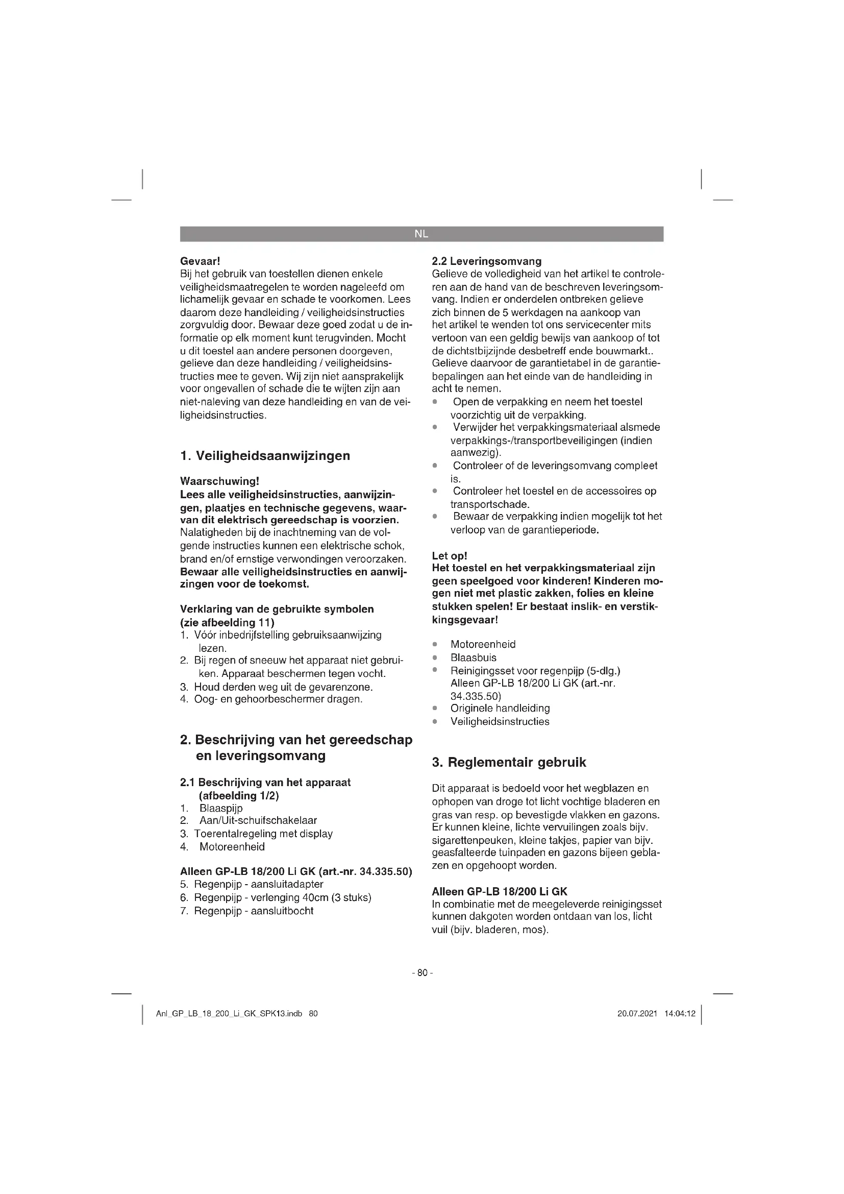 Dit apparaat is bedoeld voor het wegblazen en ophopen van droge tot licht vochtige bladeren en gras van resp. op bevestigde vlakken en gazons. Er kunnen kleine, lichte vervuilingen zoals bijv. sigarettenpeuken, kleine takjes, papier van bijv. geasfalteerde tuinpaden en gazons bijeen gebla- zen en opgehoopt worden. Alleen GP-LB 18/200 Li GK In combinatie met de meegeleverde reinigingsset kunnen dakgoten worden ontdaan van los, licht vuil (bijv. bladeren, mos). Anl_GP_LB_18_200_Li_GK_SPK13.indb 80Anl_GP_LB_18_200_Li_GK_SPK13.indb 80 20.07.2021 14:04:1220.07.2021 14:04:12NL