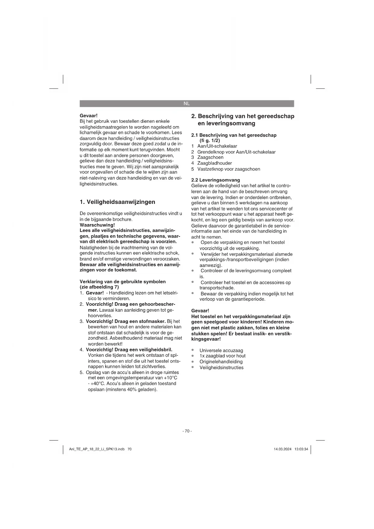 uit hand-arm-trillingen indien het toestel lang zonder onderbreking wordt gebruikt of niet naar behoren wordt gehanteerd en onder- houden. Anl_TE_AP_18_22_Li_SPK13.indb 71Anl_TE_AP_18_22_Li_SPK13.indb 71 14.03.2024 13:03:3414.03.2024 13:03:34NL