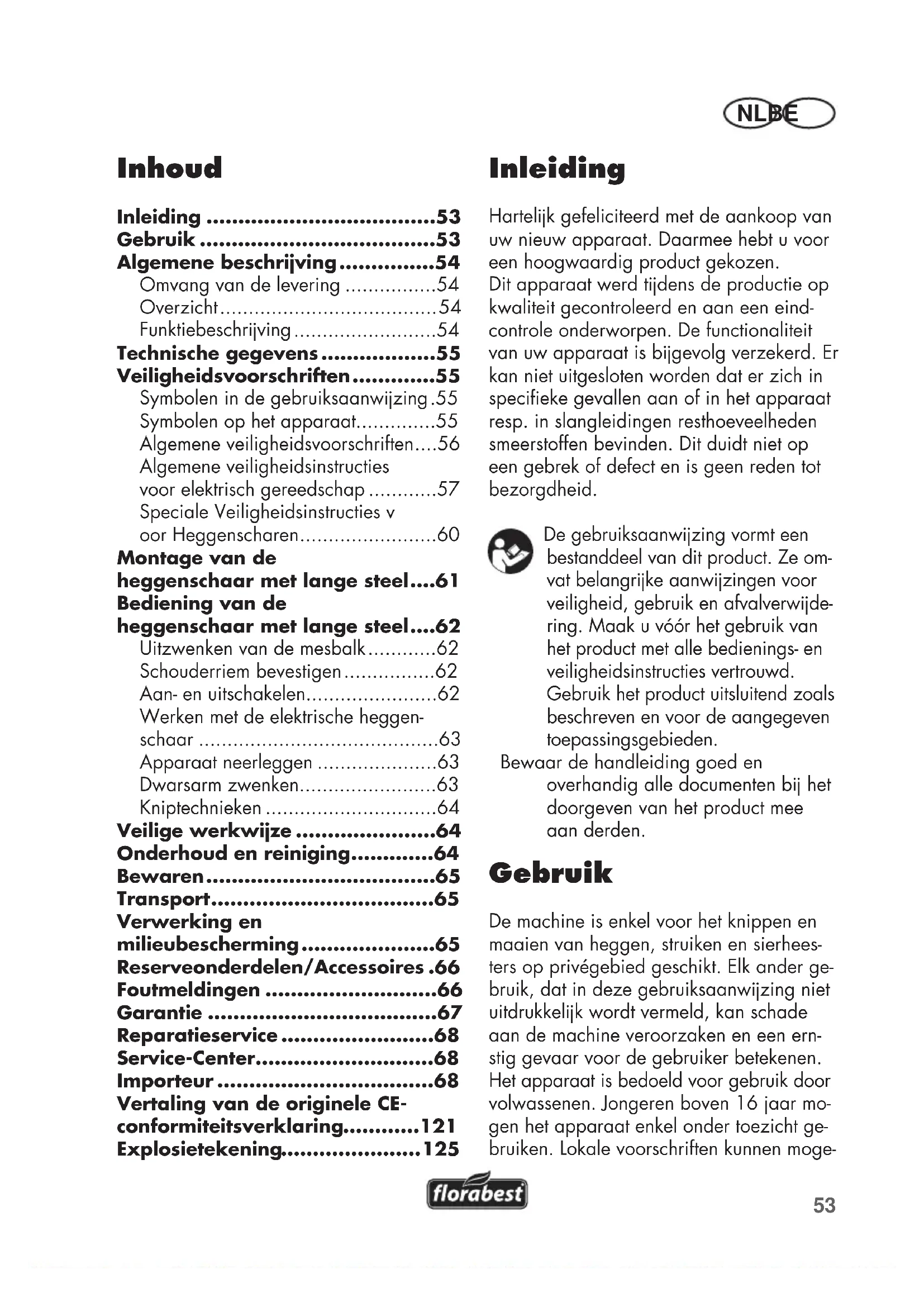 NL BE lijk een leeftijdsbeperking voor gebruikers vastleggen. Gebruik de heggenschaar niet als het regent of als de heg nat is.De gebruiker is voor ongevallen of schade aan derden aansprakelk.De producent is niet verantwoordelk voor beschadigingen, die door onrechtmatig gebruik of verkeerde bediening worden veroorzaakt. Gebruik de machine niet als het mes stomp is. Stark versiete mes-balk kann schade aan de machine veroorzaken. Mesbalk regelmatig laten slpen. Algemene beschrving De afbeeldingen kunt u vinden op de voorste uitklappagina.Omvang van de levering- Heggenschaar met lange steel (driedelig)- Maaibescherming- Schouderriem- Ronde handgreep- Veiligheidsbril- Montagemateriaal- GebruiksaanwijzingOverzicht