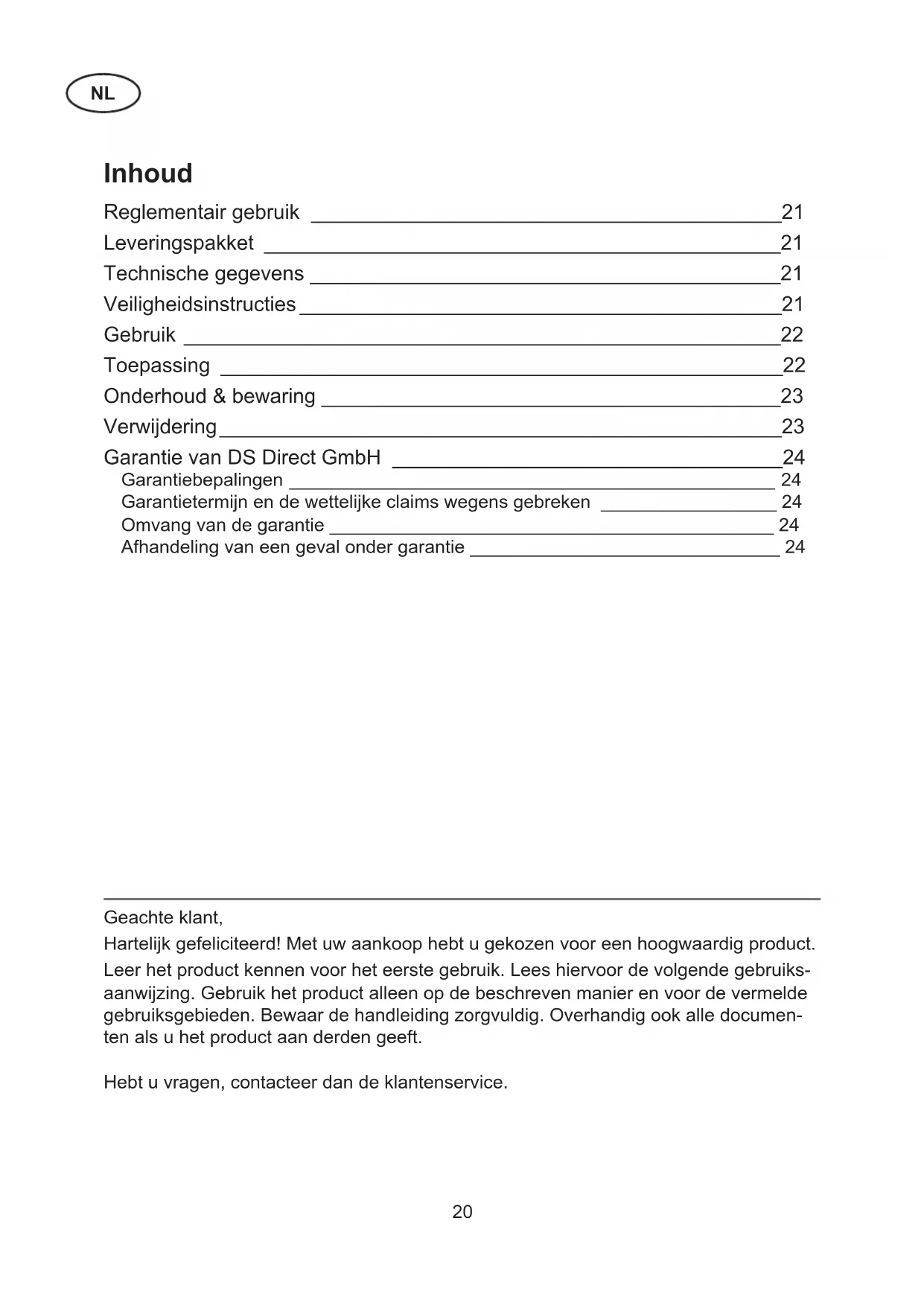 Inhoud Reglementair gebruik _________________________________________21 Leveringspakket _____________________________________________21 Technische gegevens _________________________________________21 Veiligheidsinstructies __________________________________________21 Gebruik ____________________________________________________22 Toepassing _________________________________________________22 Onderhoud & bewaring ________________________________________23 Verwijdering _________________________________________________23 Garantie van DS Direct GmbH __________________________________24 Garantiebepalingen _______________________________________________ 24 Garantietermijn en de wettelijke claims wegens gebreken _________________ 24 Omvang van de garantie ___________________________________________ 24 Afhandeling van een geval onder garantie ______________________________ 2421 Reglementair gebruik ❐ Het product is geschikt om planten buitenshuis water te geven, gebruik het niet bin- nenshuis. ❐ Het product is alleen bestemd voor een gebruik aan een waterkraan buiten. ❐ Het product is niet geschikt voor de irrigatie met heet water. ❐ Het product is niet geschikt als drinkwaterdispenser. Het product is een tuinartikel dat in open lucht wordt gebruikt en bewaard. De slang kan blootgesteld worden aan omstandigheden, die schadelijk zijn voor de mens, zoals: – schimmel en bacteriën – meststoffen – dierlijk afval – insecten – staand water – andere schadelijke stoffen ❐ Het product is geen speelgoed! Houd kinderen en dieren weg van het product. Laat kinderen en dieren niet bij het product als er geen toezicht is. Het is niet geschikt voor kinderen en dieren. ❐ Het product is bestemd voor particulier gebruik. Gebruik het product alleen volgens de beschrijvingen in de handleiding. Elk ander gebruik geldt als onreglementair. Leveringspakket