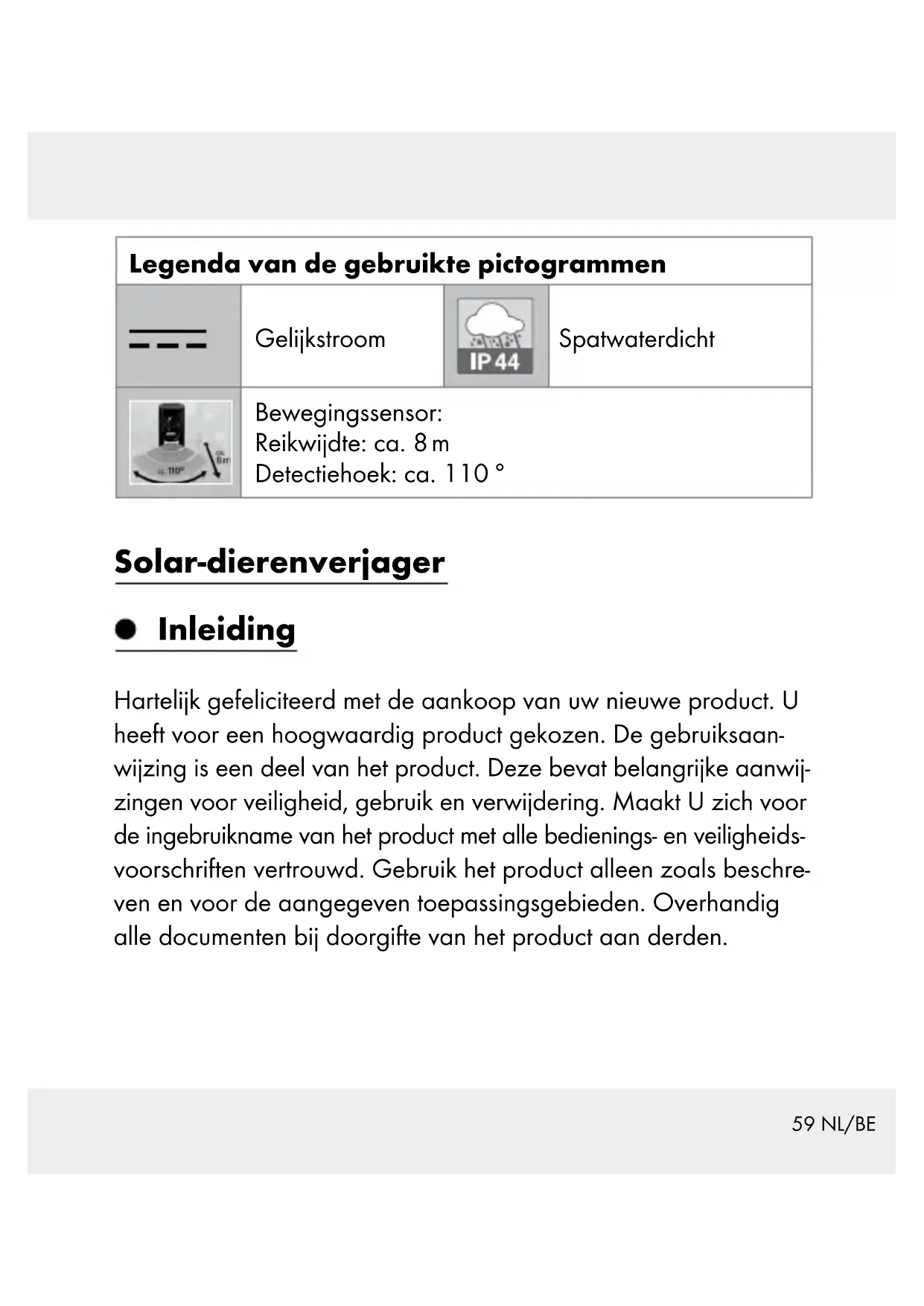 Plug62 NL/BE Omvang van de levering 1 solar-dierenverjager 1 USB-laadkabel 1 grondpen (tweedelig) 3 accu‘s (AA, Ni-MH, elk 800 mAh) 1 plug (Ø 6 mm) 1 bevestigingsschroef (3,8 x 30 mm) 1 gebruiksaanwijzing Technische gegevens Bedrijfsspanning: 3,6 V Accu‘s: 3 x Ni-MH-accu / AA / 1,2 V / 800 mAh Beschermingsniveau: III / Beschermingsgraad: IP44 (spatwaterdicht) Signaalfrequenties: ca. 13,5 kHz–23,5 kHz DC-laadbus: 5 V , max. 500 mA Polariteit van de gelijkstroom- stroomaansluiting: Bewegingsmelder: Reikwijdte: ca. 8 m Registratiehoek: ca. 110 °63 NL/BE Veiligheidsinstructies Maak u voor de eerste ingebruikname van het product vertrouwd met alle bedienings- en veiligheidsvoorschriften! Geef alle docu- menten mee wanneer u het product aan derden geeft! Dit product kan door kinderen vanaf 8 alsmede door personen met verminderde fysieke, sensorische of mentale vaardigheden of een gebrek aan ervaring en kennis worden gebruikt, als zij onder toezicht staan of ge- instrueerd werden met betrekking tot het veilige gebruik van het product en zij de hieruit voortvloeiende gevaren begrij- pen. Kinderen mogen niet met het product spelen. Reiniging en onderhoud mag niet door kinderen zonder toezicht worden uitgevoerd. Neen het product niet in gebruik als u een beschadiging heeft geconstateerd. Let erop dat het zonnepaneel niet verontreinigd of in de winter door sneeuw en ijs bedekt is. Dit vermindert de prestaties van het zonnepaneel. Plaats geen voorwerpen op het product! Houd het product bij open vuur vandaan!64 NL/BE Indien het product vreemde geluiden maakt, indien er sprake is van rookontwikkeling of als er vergelijkbare storingen optreden, dient u de ingebouwde batterijen direct te verwijderen en / of de verbinding met de USB-laadkabel te verbreken. Gebruik het product uitsluitend buiten de gehoorafstand van mensen. Het product genereert frequenties die ook door smmi