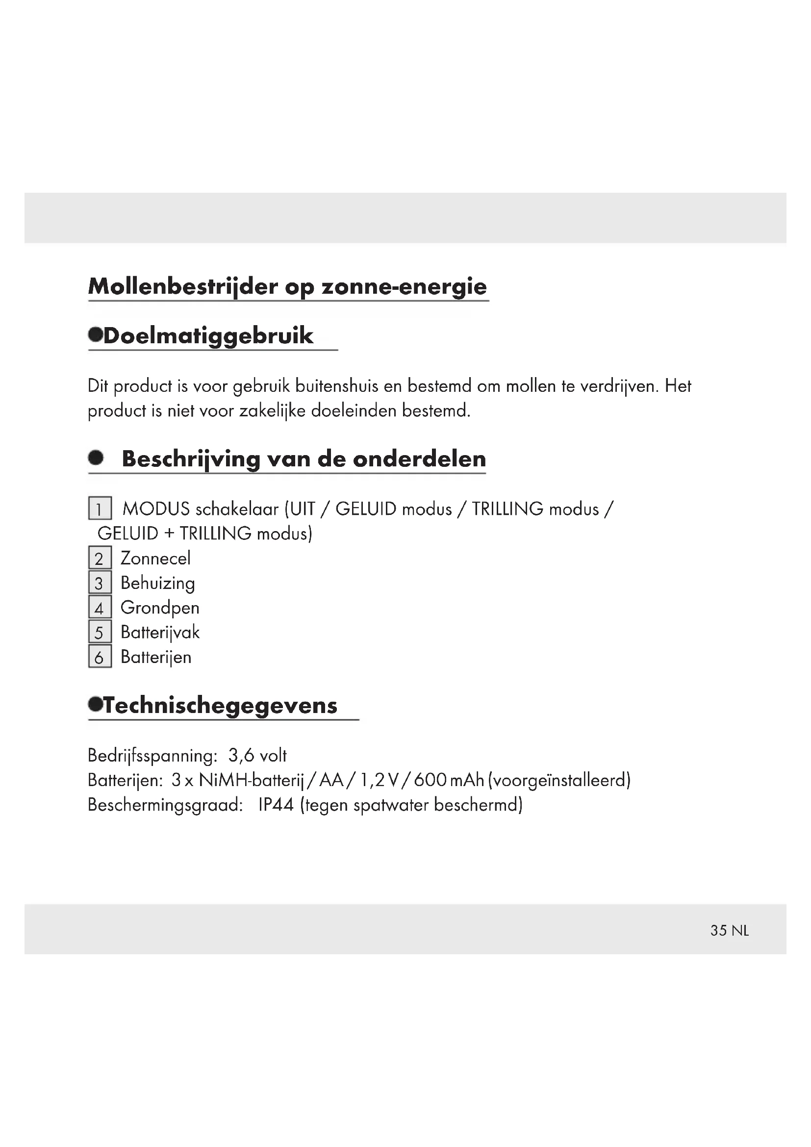 Batterijen Technische gegevens Bedrijfsspanning: 3,6 volt Batterijen: 3 x NiMH-batterij / AA / 1,2 V / 600 mAh (voorgeïnstalleerd) Beschermingsgraad: IP44 (tegen spatwater beschermd)36 NL Veiligheidsinstructies