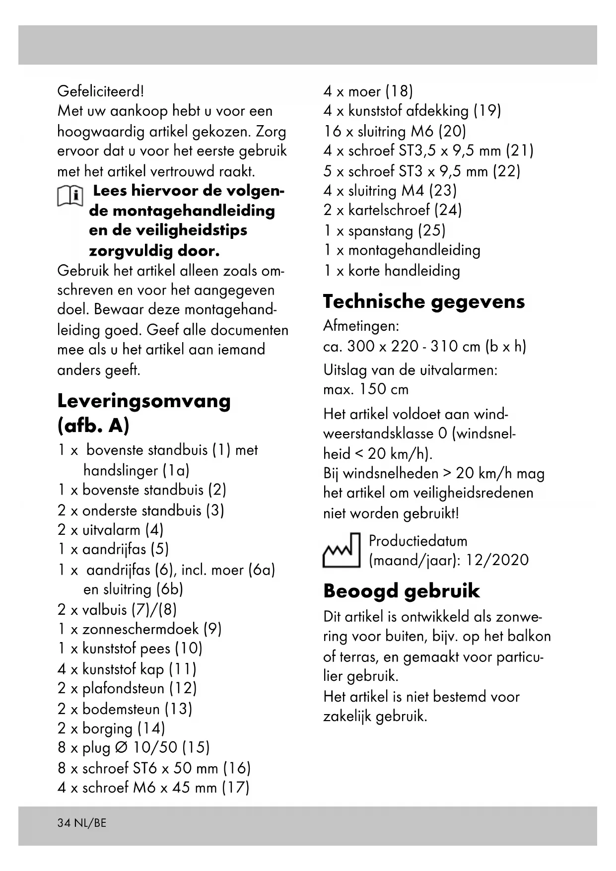 - Zet het artikel vast bij extreme weersomstandigheden, zoals har- de wind. Berg het artikel op in een beschutte ruimte. Belangrijke informatie voor de montage WAARSCHUWING! Wij raden voor een optimale bevestiging van het artikel aan, de bodem- en pla- fondsteunen vast te schroeven, in het bijzonder op balkons of niet gelijk- vloers gelegen montageplaatsen. Als u het artikel niet aan bodem en plafond vastschroeft, vervalt elke aansprakelijkheid van de fabrikant. WAARSCHUWING! Voordat u aan de montage van het artikel begint, meet u de hoogte tussen bodem en plafond op. WAARSCHUWING! De montage van het artikel moet vanwege de grootte door ten minste twee perso- nen worden uitgevoerd. WAARSCHUWING! Omdat er met gereedschap/machines moet worden gewerkt, is ambachtelijke kennis onontbeerlijk. Geschikt montageoppervlak Voor de plafondmontage is een betonnen plafond of een dragende houten balkconstructie geschikt. Voor de bodemmontage is een betonfundering of zijn betonplaten van min. 50 x 50 x 5 cm (l x b x d) geschikt. Aanwijzing: als u het artikel aan een houten balkconstructie beves- tigt, moet u het artikel goed eraan vastschroeven, omdat hout onder invloed van de temperatuur en vocht van vorm verandert. Informeer in een vakhandel welke montagemate- rialen geschikt zijn. Aanwijzing: andere montageon- dergronden moeten door een ge- specialiseerd bedrijf op draagkracht en vastheid worden gecontroleerd. NL/BE37 Geschikt montagemateriaal Voordat het artikel wordt gemon- teerd, moet worden bepaald welk montagemateriaal vereist is. Als het montageoppervlak draag- krachtig is, moet het hierbij pas- sende montagemateriaal voor de bevestiging worden uitgekozen. Bevestigingsmateriaal: