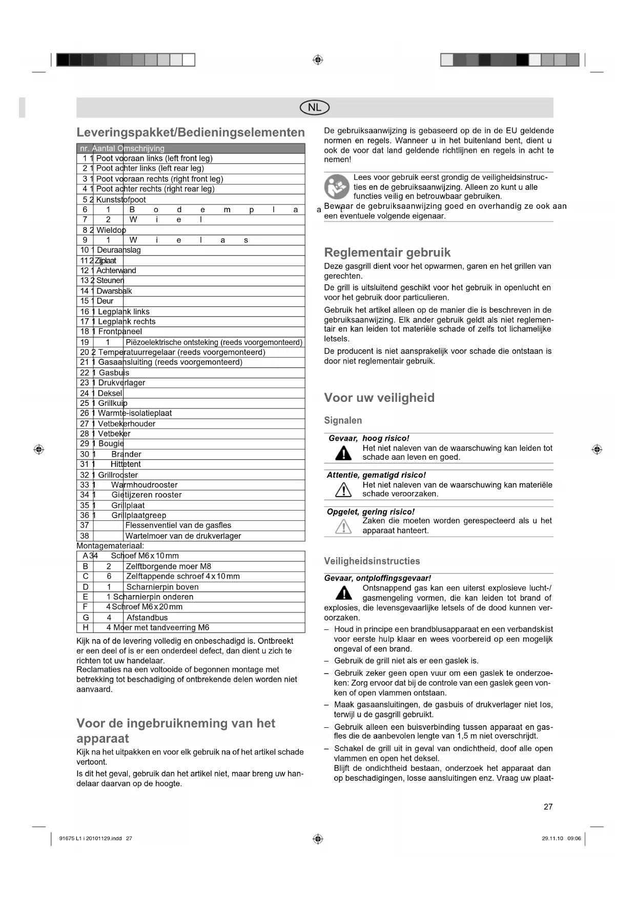 Piëzoelektrische ontsteking (reeds voorgemonteerd) 20 2 Temperatuurregelaar (reeds voorgemonteerd) 21 1 Gasaansluiting (reeds voorgemonteerd) 22 1 Gasbuis 23 1 Drukverlager 24 1 Deksel 25 1 Grillkuip 26 1 Warmte-isolatieplaat 27 1 Vetbekerhouder 28 1 Vetbeker 29 1 Bougie 30 1 Brander 31 1 Hittetent 32 1 Grillrooster 33 1 Warmhoudrooster 34 1 Gietijzeren rooster 35 1 Grillplaat 36 1 Grillplaatgreep 37 Flessenventiel van de gasfles 38 Wartelmoer van de drukverlager Montagemateriaal: A 34 Schoef M6 x 10 mm B 2 Zelftborgende moer M8 C 6 Zelftappende schroef 4 x 10 mm D 1 Scharnierpin boven E 1 Scharnierpin onderen F 4 Schroef M6 x 20 mm G4Afstandbus H 4 Moer met tandveerring M6 Kijk na of de levering volledig en onbeschadigd is. Ontbreekt er een deel of is er een onderdeel defect, dan dient u zich te richten tot uw handelaar. Reclamaties na een voltooide of begonnen montage met betrekking tot beschadiging of ontbrekende delen worden niet aanvaard. Voor de ingebruikneming van het apparaat Kijk na het uitpakken en voor elk gebruik na of het artikel schade vertoont. Is dit het geval, gebruik dan het artikel niet, maar breng uw han- delaar daarvan op de hoogte. De gebruiksaanwijzing is gebaseerd op de in de EU geldende normen en regels. Wanneer u in het buitenland bent, dient u ook de voor dat land geldende richtlijnen en regels in acht te nemen! Lees voor gebruik eerst grondig de veilig heids instruc- ties en de ge bruiks aanwijzing. Alleen zo kunt u alle func ties vei lig en be trouw baar gebrui ken. Bewaar de gebruiksaanwijzing goed en overhandig ze ook aan een eventuele volgende eigenaar. Reglementair gebruik Deze gasgrill dient voor het opwarmen, garen en het grillen van gerechten. De grill is uitsluitend geschikt voor het gebruik in openlucht en voor het gebruik door particulieren. Gebruik het artikel alleen op de manier die is beschreven in de gebruiksaanwijzing. Elk ander gebruik geldt als niet reglemen- tair en kan leiden tot materiële schade of zelfs tot lichamelijke letsels. De producent is niet aansprakelijk voor schade die ontstaan is door niet reglementair gebruik. Voor uw veiligheid Signalen Gevaar, hoog ri si co! Het niet naleven van de waar schuwing kan leiden tot scha de aan leven en go ed. Attentie, gematigd ri si co! Het niet naleven van de waarschuwing kan materiële scha de ver oor za ken. Opgelet, gering risico! Zaken die moeten worden gerespecteerd als u het apparaat hanteert. Veiligheidsinstructies Gevaar, ontploffingsgevaar! Ontsnappend gas kan een uiterst explosieve lucht-/ gasmengeling vormen, die kan leiden tot brand of explosies, die levensgevaarlijke letsels of de dood kunnen ver- oorzaken. – Houd in principe een brandblusapparaat en een verbandskist voor eerste hulp klaar en wees voorbereid op een mogelijk ongeval of een brand. – Gebruik de grill niet als er een gaslek is. – Gebruik zeker geen open vuur om een gaslek te onderzoe- ken: Zorg ervoor dat bij de controle van een gaslek geen von- ken of open vlammen ontstaan. – Maak gasaansluitingen, de gasbuis of drukverlager niet los, terwijl u de gasgrill gebruikt. – Gebruik alleen een buisverbinding tussen apparaat en gas- fles die de aanbevolen lengte van 1,5 m niet overschrijdt. – Schakel de grill uit in geval van ondichtheid, doof alle open vlammen en open het deksel. Blijft de ondichtheid bestaan, onderzoek het apparaat dan op beschadigingen, losse aansluitingen enz. Vraag uw plaat- 91675 L1 i 20101129.indd 27 91675 L1 i 20101129.indd 27