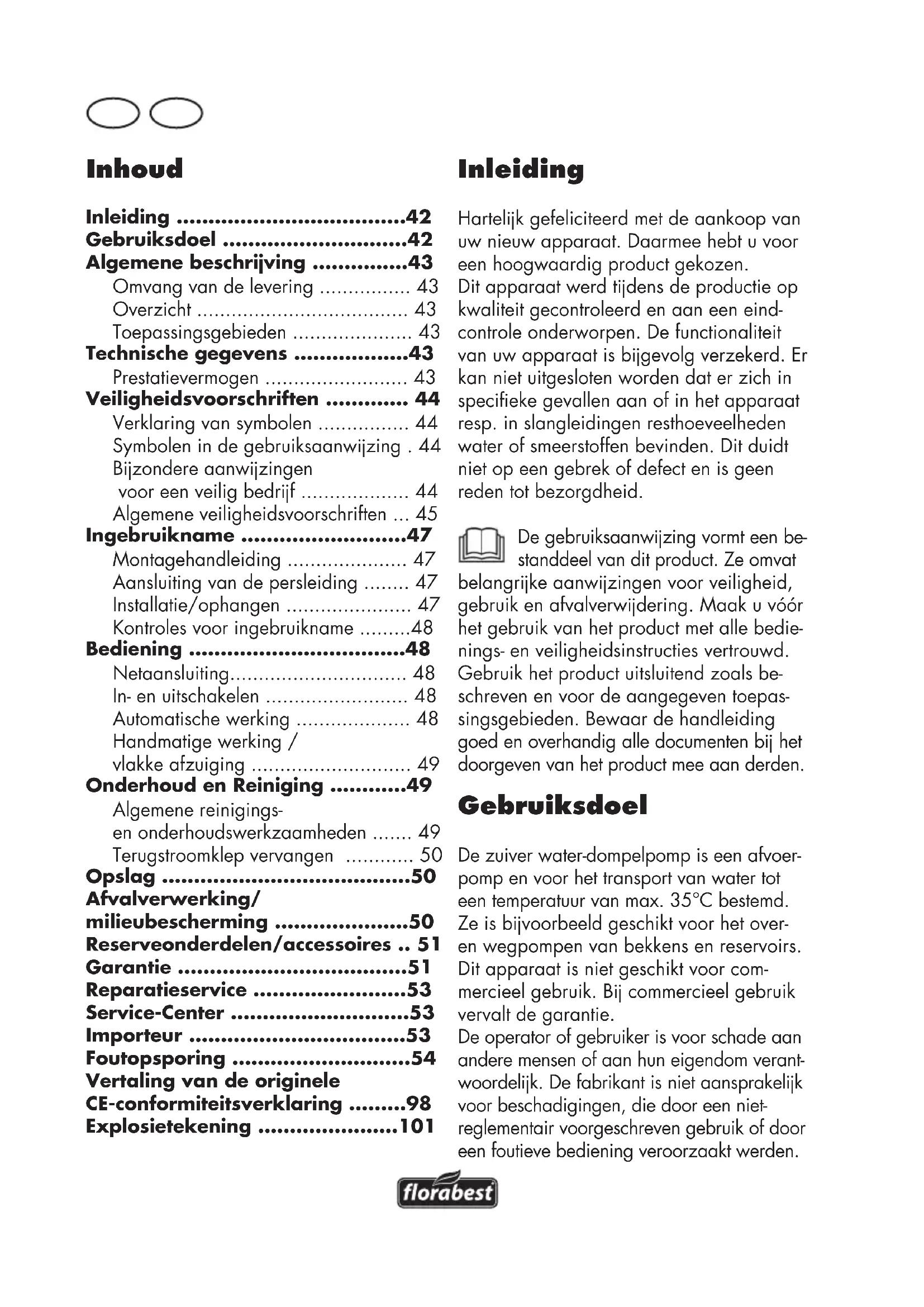 monté ou défectueux Contrôler la position du clapet de non-retour et éventuellement le rempla- cer (voir «Entretien et nettoyage») clapet de non-retour ( 10) réduit la puissance de pompage Retirer le clapet de non-retour de l’adaptateur ( 11) (voir «Mise en service») La pompe s’arrête après un bref temps de marche la protection du moteur stoppe la pompe à cause de salissures trop importantes débrancher et nettoyer la pompe et la fosse température de l‘eau trop éle- vée, la protection du moteur stoppe respecter la température maximale de 35° C!4 2 N L B E Inleiding Hartelk gefeliciteerd met de aankoop van uw nieuw apparaat. Daarmee hebt u voor een hoogwaardig product gekozen. Dit apparaat werd tdens de productie op kwaliteit gecontroleerd en aan een eind- controle onderworpen. De functionaliteit van uw apparaat is bgevolg verzekerd. Er kan niet uitgesloten worden dat er zich in specieke gevallen aan of in het apparaat resp. in slangleidingen resthoeveelheden water of smeerstoffen bevinden. Dit duidt niet op een gebrek of defect en is geen reden tot bezorgdheid. De gebruiksaanwzing vormt een be- standdeel van dit product. Ze omvat belangrke aanwzingen voor veiligheid, gebruik en afvalverwdering. Maak u vóór het gebruik van het product met alle bedie- nings- en veiligheidsinstructies vertrouwd. Gebruik het product uitsluitend zoals be- schreven en voor de aangegeven toepas- singsgebieden. Bewaar de handleiding goed en overhandig alle documenten b het doorgeven van het product mee aan derden. Gebruiksdoel De zuiver water-dompelpomp is een afvoer- pomp en voor het transport van water tot een temperatuur van max. 35°C bestemd. Ze is bvoorbeeld geschikt voor het over- en wegpompen van bekkens en reservoirs. Dit apparaat is niet geschikt voor com- mercieel gebruik. B commercieel gebruik vervalt de garantie. De operator of gebruiker is voor schade aan andere mensen of aan hun eigendom verant- woordelk. De fabrikant is niet aansprakelk voor beschadigingen, die door een niet- reglementair voorgeschreven gebruik of door een foutieve bediening veroorzaakt werden. Inhoud Inleiding ....................................42 Gebruiksdoel .............................42 Algemene beschrving ...............43 Omvang van de levering ................ 43 Overzicht ..................................... 43 Toepassingsgebieden ..................... 43 Technische gegevens ..................43 Prestatievermogen ......................... 43 Veiligheidsvoorschriften ............. 44 Verklaring van symbolen ................ 44 Symbolen in de gebruiksaanwzing . 44 Bzondere aanwzingen voor een veilig bedrf ................... 44 Algemene veiligheidsvoorschriften ... 45 Ingebruikname ..........................47 Montagehandleiding ..................... 47 Aansluiting van de persleiding ........ 47 Installatie/ophangen ...................... 47 Kontroles voor ingebruikname .........48 Bediening ..................................48 Netaansluiting............................... 48 In- en uitschakelen ......................... 48 Automatische werking .................... 48 Handmatige werking / vlakke afzuiging ............................ 49 Onderhoud en Reiniging ............49 Algemene reinigings- en onderhoudswerkzaamheden ....... 49 Terugstroomklep vervangen ............ 50 Opslag .......................................50 Afvalverwerking/ milieubescherming .....................50 Reserveonderdelen/accessoires .. 51 Garantie ....................................51 Reparatieservice ........................53 Service-Center ............................53 Importeur ..................................53 Foutopsporing ............................54 Vertaling van de originele CE-conformiteitsverklaring .........98 Explosietekening ......................1014 3 B EN L Technische gegevens Zuiver water-dompelpomp ....... FTP 400 E4 Netspanning (U) .............. 230 V~, 50 Hz Prestatievermogen (P) ....................400 W Hoeveelheid water max. (Qmax) ............................ ca. 10000 l/h Bereikbare hoogte max. (Hmax) ..........7 m Zo diep mogelke ligging ..................7 m Watertemperatuur max. (Tmax) ........35° C Aansluiting slang .......... ½“, ¾“, 1“, 1 ½“ (13mm,19mm, 25mm, 38mm) Aansluiting voor kraanstuk met interne schroefdraad aan de haakse adapter .... G 1 ½“ (44,9 mm) aan de slangadapter ..... G 1“ (33,3 mm) Vreemde voorwerpen max. ......... Ø 5 mm Lengte netsnoer ...............................10 m Gewicht (incl. alle onderdelen) .....3,66 kg Beschermingsniveau .............................. I Beschermingsklasse ..........................IPX8 Prestatievermogen