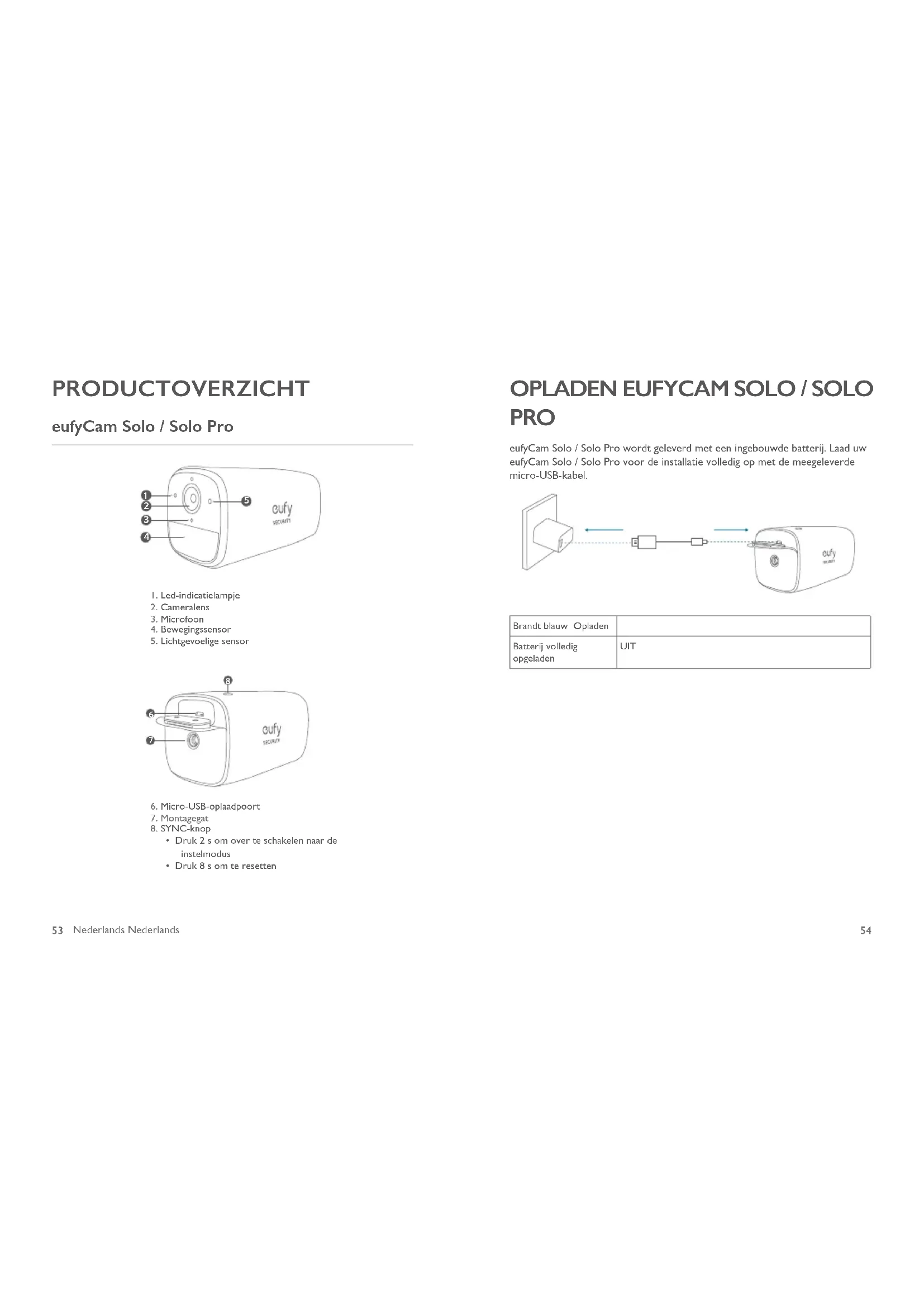 PRO eufyCam Solo / Solo Pro wordt geleverd met een ingebouwde batterij. Laad uw eufyCam Solo / Solo Pro voor de installatie volledig op met de meegeleverde micro-USB-kabel. Brandt blauw Opladen Batterij volledig opgeladen UIT55 Nederlands Nederlands