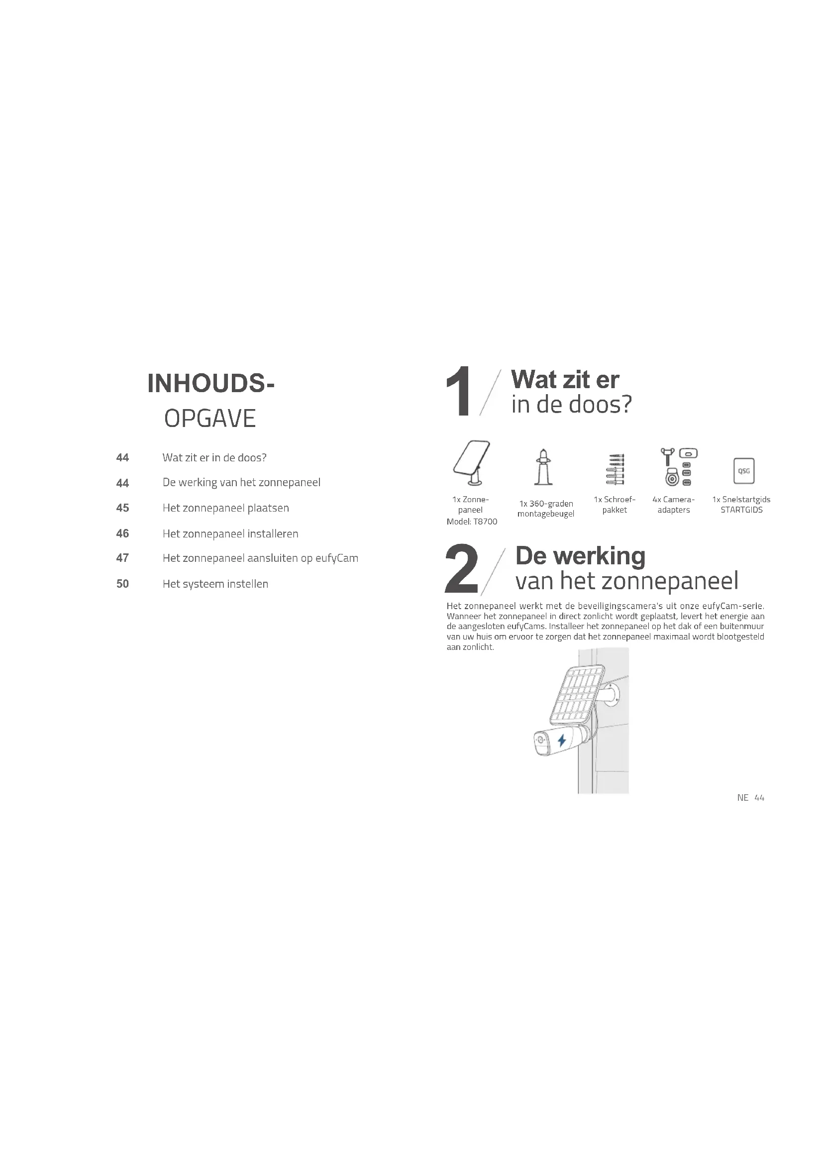 1x Zonne- paneelModel: T87001x 360-graden montagebeugel Het zonnepaneel werkt met de beveiligingscamera's uit onze eufyCam-serie. Wanneer het zonnepaneel in direct zonlicht wordt geplaatst, levert het energie aan de aangesloten eufyCams. Installeer het zonnepaneel op het dak of een buitenmuur van uw huis om ervoor te zorgen dat het zonnepaneel maximaal wordt blootgesteld aan zonlicht. 1x Schroef- pakket4x Camera-adapters1x SnelstartgidsSTARTGIDS45 NE NE 46 Houd bij het plaatsen van het zonnepaneel rekening met de volgende factoren. Deze factoren kunnen het rendement van het zonnepaneel beïnvloeden: