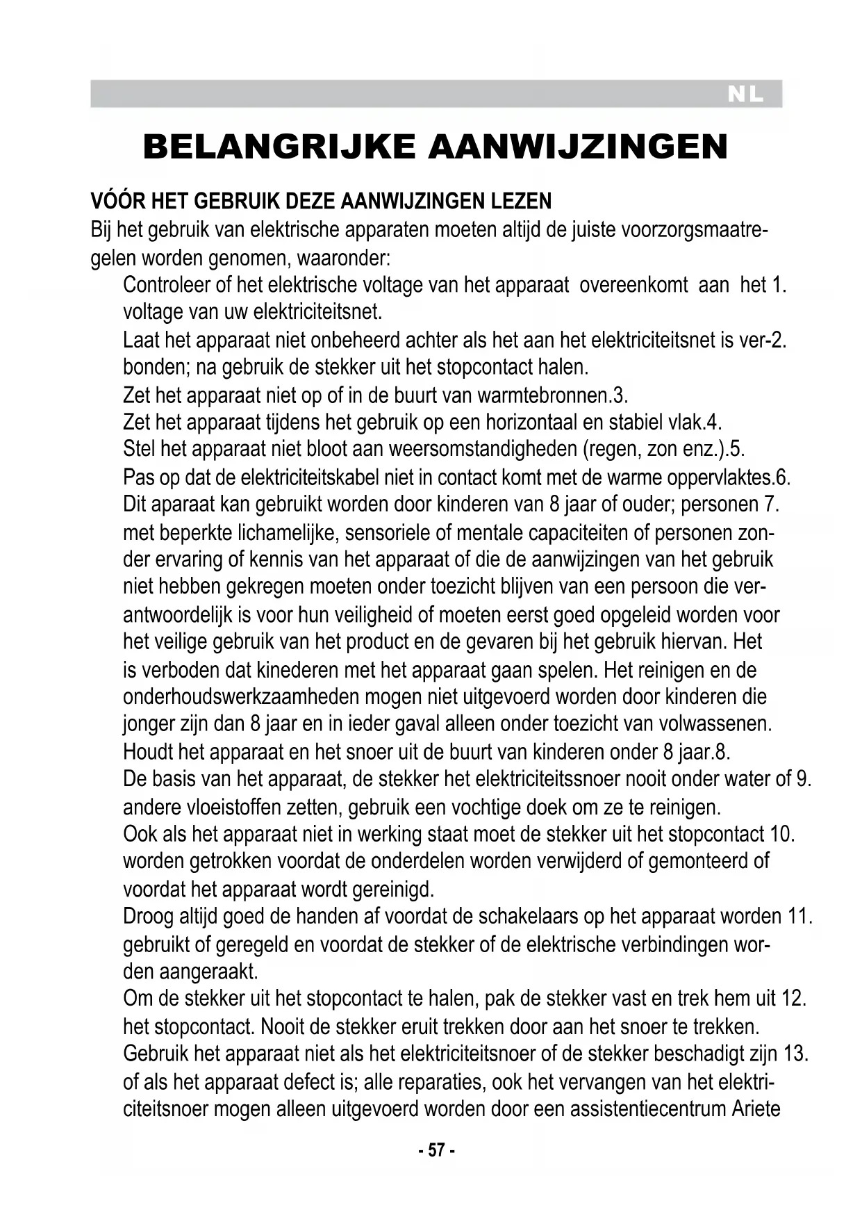 BELANGRIJKE AANWIJZINGEN VÓÓR HET GEBRUIK DEZE AANWIJZINGEN LEZEN Bij het gebruik van elektrische apparaten moeten altijd de juiste voorzorgsmaatre- gelen worden genomen, waaronder: Controleer of het elektrische voltage van het apparaat overeenkomt aan het 1. voltage van uw elektriciteitsnet. Laat het apparaat niet onbeheerd achter als het aan het elektriciteitsnet is ver-2. bonden; na gebruik de stekker uit het stopcontact halen. Zet het apparaat niet op of in de buurt van warmtebronnen.3. Zet het apparaat tijdens het gebruik op een horizontaal en stabiel vlak.4. Stel het apparaat niet bloot aan weersomstandigheden (regen, zon enz.).5. Pas op dat de elektriciteitskabel niet in contact komt met de warme oppervlaktes.6. Dit aparaat kan gebruikt worden door kinderen van 8 jaar of ouder; personen 7. met beperkte lichamelijke, sensoriele of mentale capaciteiten of personen zon- der ervaring of kennis van het apparaat of die de aanwijzingen van het gebruik niet hebben gekregen moeten onder toezicht blijven van een persoon die ver- antwoordelijk is voor hun veiligheid of moeten eerst goed opgeleid worden voor het veilige gebruik van het product en de gevaren bij het gebruik hiervan. Het is verboden dat kinederen met het apparaat gaan spelen. Het reinigen en de onderhoudswerkzaamheden mogen niet uitgevoerd worden door kinderen die jonger zijn dan 8 jaar en in ieder gaval alleen onder toezicht van volwassenen. Houdt het apparaat en het snoer uit de buurt van kinderen onder 8 jaar.8. De basis van het apparaat, de stekker het elektriciteitssnoer nooit onder water of 9. andere vloeistoffen zetten, gebruik een vochtige doek om ze te reinigen. Ook als het apparaat niet in werking staat moet de stekker uit het stopcontact 10. worden getrokken voordat de onderdelen worden verwijderd of gemonteerd of voordat het apparaat wordt gereinigd. Droog altijd goed de handen af voordat de schakelaars op het apparaat worden 11. gebruikt of geregeld en voordat de stekker of de elektrische verbindingen wor- den aangeraakt. Om de stekker uit het stopcontact te halen, pak de stekker vast en trek hem uit 12. het stopcontact. Nooit de stekker eruit trekken door aan het snoer te trekken. Gebruik het apparaat niet als het elektriciteitsnoer of de stekker beschadigt zijn 13. of als het apparaat defect is; alle reparaties, ook het vervangen van het elektri- citeitsnoer mogen alleen uitgevoerd worden door een assistentiecentrum ArieteNL