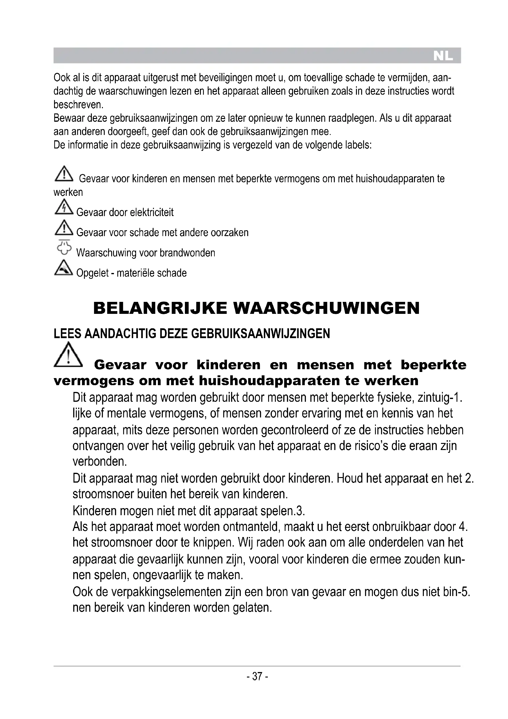 Ook al is dit apparaat uitgerust met beveiligingen moet u, om toevallige schade te vermijden, aan- dachtig de waarschuwingen lezen en het apparaat alleen gebruiken zoals in deze instructies wordt beschreven. Bewaar deze gebruiksaanwijzingen om ze later opnieuw te kunnen raadplegen. Als u dit apparaat aan anderen doorgeeft, geef dan ook de gebruiksaanwijzingen mee. De informatie in deze gebruiksaanwijzing is vergezeld van de volgende labels: Gevaar voor kinderen en mensen met beperkte vermogens om met huishoudapparaten te werken Gevaar door elektriciteit Gevaar voor schade met andere oorzaken Waarschuwing voor brandwonden Opgelet - materiële schade BELANGRIJKE WAARSCHUWINGEN lEEs AANDACHtIG DEzE GEBRuIKsAANWIJzINGEN Gevaar voor kinderen en mensen met beperkte vermogens om met huishoudapparaten te werken Dit apparaat mag worden gebruikt door mensen met beperkte fysieke, zintuig-1. lijke of mentale vermogens, of mensen zonder ervaring met en kennis van het apparaat, mits deze personen worden gecontroleerd of ze de instructies hebben ontvangen over het veilig gebruik van het apparaat en de risico’s die eraan zijn verbonden. Dit apparaat mag niet worden gebruikt door kinderen. Houd het apparaat en het 2. stroomsnoer buiten het bereik van kinderen. Kinderen mogen niet met dit apparaat spelen.3. Als het apparaat moet worden ontmanteld, maakt u het eerst onbruikbaar door 4. het stroomsnoer door te knippen. Wij raden ook aan om alle onderdelen van het apparaat die gevaarlijk kunnen zijn, vooral voor kinderen die ermee zouden kun- nen spelen, ongevaarlijk te maken. Ook de verpakkingselementen zijn een bron van gevaar en mogen dus niet bin-5. nen bereik van kinderen worden gelaten.NL