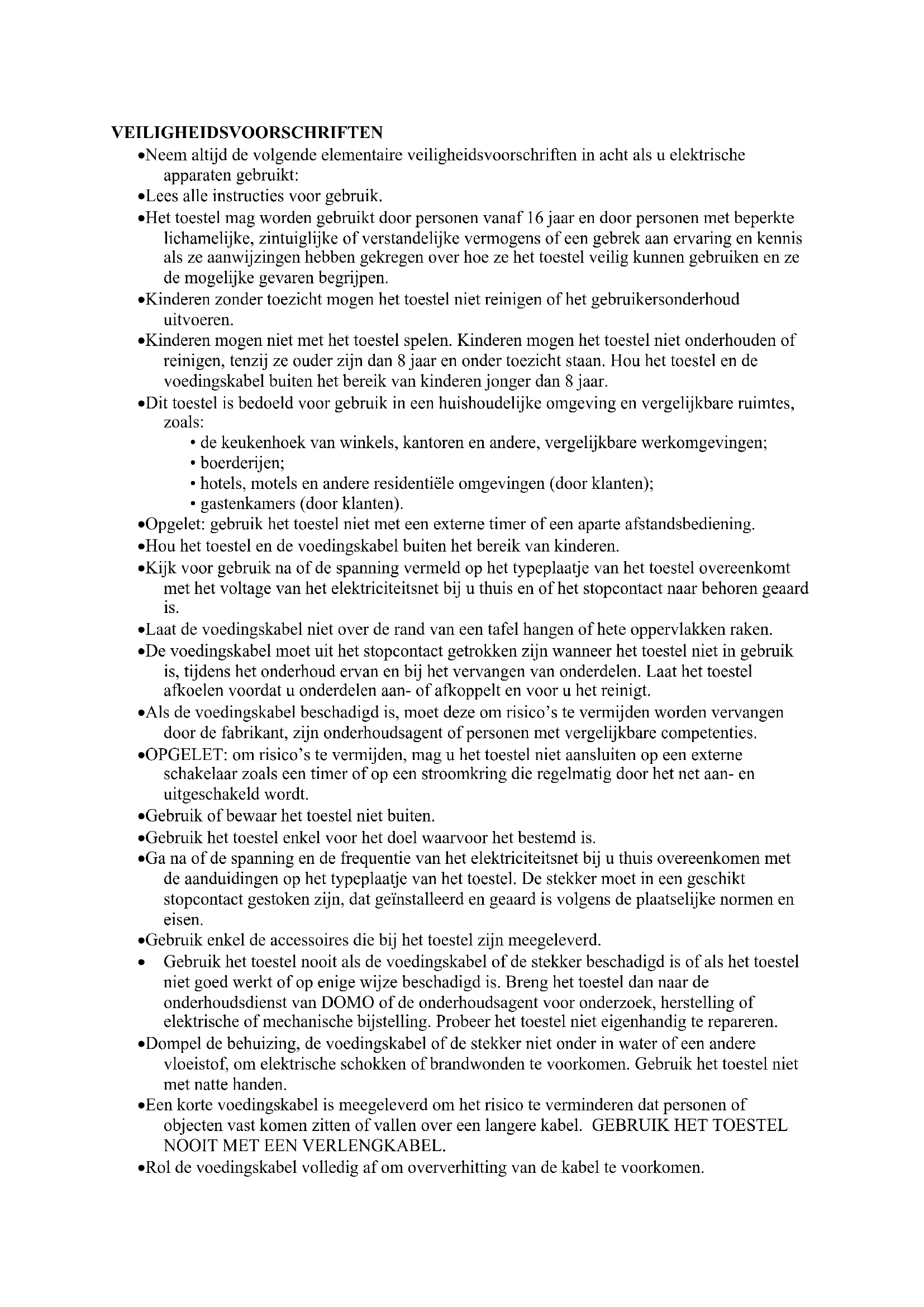 - gastenkamers (door klanten). Opgelet: gebruik het toestel niet met een externe timer of een aparte afstandsbediening. Hou het toestel en de voedingskabel buiten het bereik van kinderen. Kijk voor gebruik na of de spanning vermeld op het typeplaatje van het toestel overeenkomt met het voltage van het elektriciteitsnet bij u thuis en of het stopcontact naar behoren geaard is. Laat de voedingskabel niet over de rand van een tafel hangen of hete oppervlakken raken. De voedingskabel moet uit het stopcontact getrokken zijn wanneer het toestel niet in gebruik is, tijdens het onderhoud ervan en bij het vervangen van onderdelen. Laat het toestel afkoelen voordat u onderdelen aan- of afkoppelt en voor u het reinigt. Als de voedingskabel beschadigd is, moet deze om risico’s te vermijden worden vervangen door de fabrikant, zijn onderhoudsagent of personen met vergelijkbare competenties. OPGELET: om risico’s te vermijden, mag u het toestel niet aansluiten op een externe schakelaar zoals een timer of op een stroomkring die regelmatig door het net aan- en uitgeschakeld wordt. Gebruik of bewaar het toestel niet buiten. Gebruik het toestel enkel voor het doel waarvoor het bestemd is. Ga na of de spanning en de frequentie van het elektriciteitsnet bij u thuis overeenkomen met de aanduidingen op het typeplaatje van het toestel. De stekker moet in een geschikt stopcontact gestoken zijn, dat geïnstalleerd en geaard is volgens de plaatselijke normen en eisen. Gebruik enkel de accessoires die bij het toestel zijn meegeleverd. Gebruik het toestel nooit als de voedingskabel of de stekker beschadigd is of als het toestel niet goed werkt of op enige wijze beschadigd is. Breng het toestel dan naar de onderhoudsdienst van DOMO of de onderhoudsagent voor onderzoek, herstelling of elektrische of mechanische bijstelling. Probeer het toestel niet eigenhandig te repareren. Dompel de behuizing, de voedingskabel of de stekker niet onder in water of een andere vloeistof, om elektrische schokken of brandwonden te voorkomen. Gebruik het toestel niet met natte handen. Een korte voedingskabel is meegeleverd om het risico te verminderen dat personen of objecten vast komen zitten of vallen over een langere kabel. GEBRUIK HET TOESTEL NOOIT MET EEN VERLENGKABEL. Rol de voedingskabel volledig af om oververhitting van de kabel te voorkomen. Laat de voedingskabel niet over de rand van een toog hangen of hete oppervlakken raken. Laat de voedingskabel niet onder of rond het toestel hangen. Gebruik het toestel niet zonder ingrediënten.
