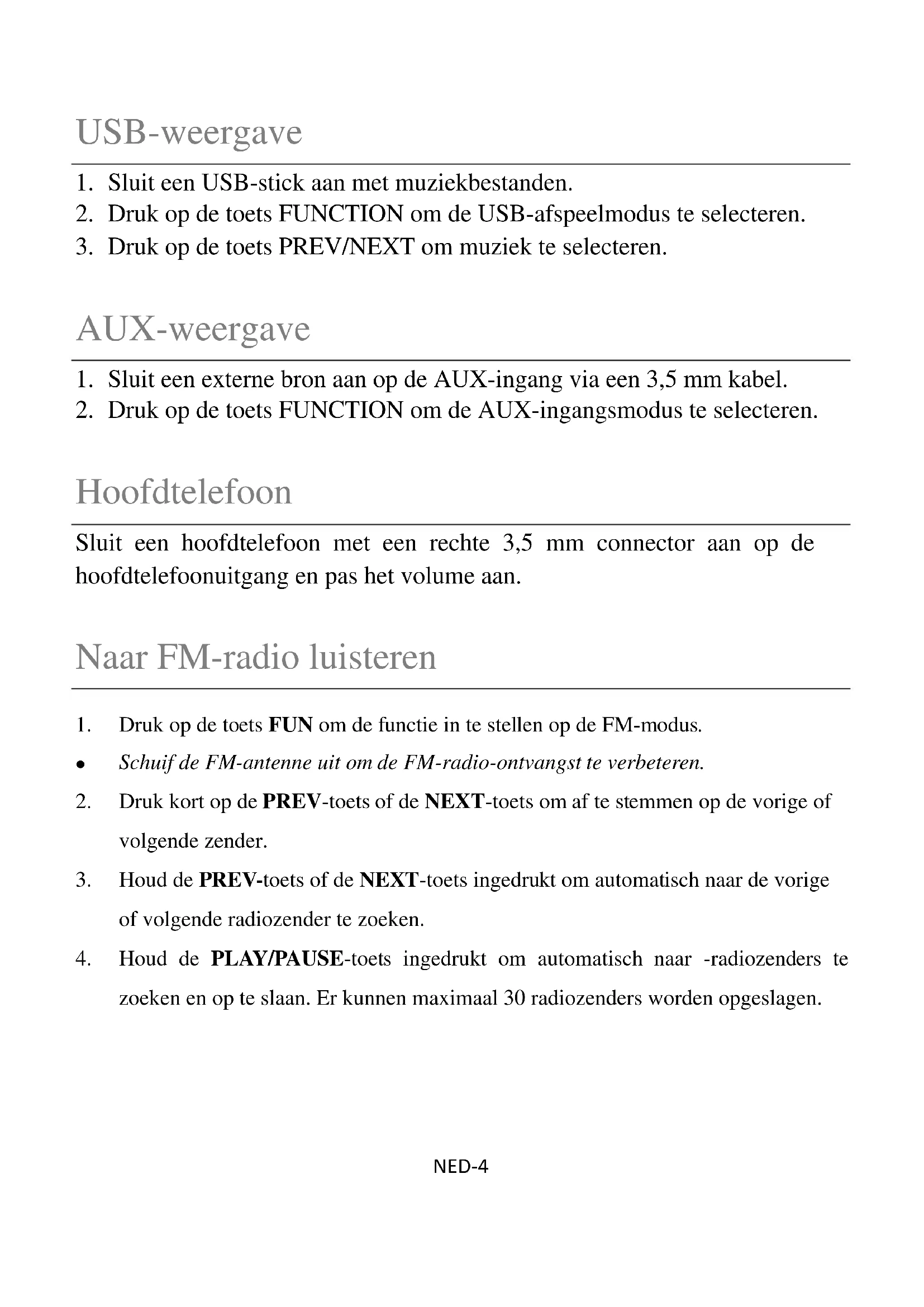de werking van het apparaat kan verstoren. NED-1AC-voeding Steek de stekker van de verwijderbare voedingskabel in een standaard stopcontact (100-240 V~ 50/60 Hz). Batterijvoeding Vereist 4 C-batterijen, niet inbegrepen.