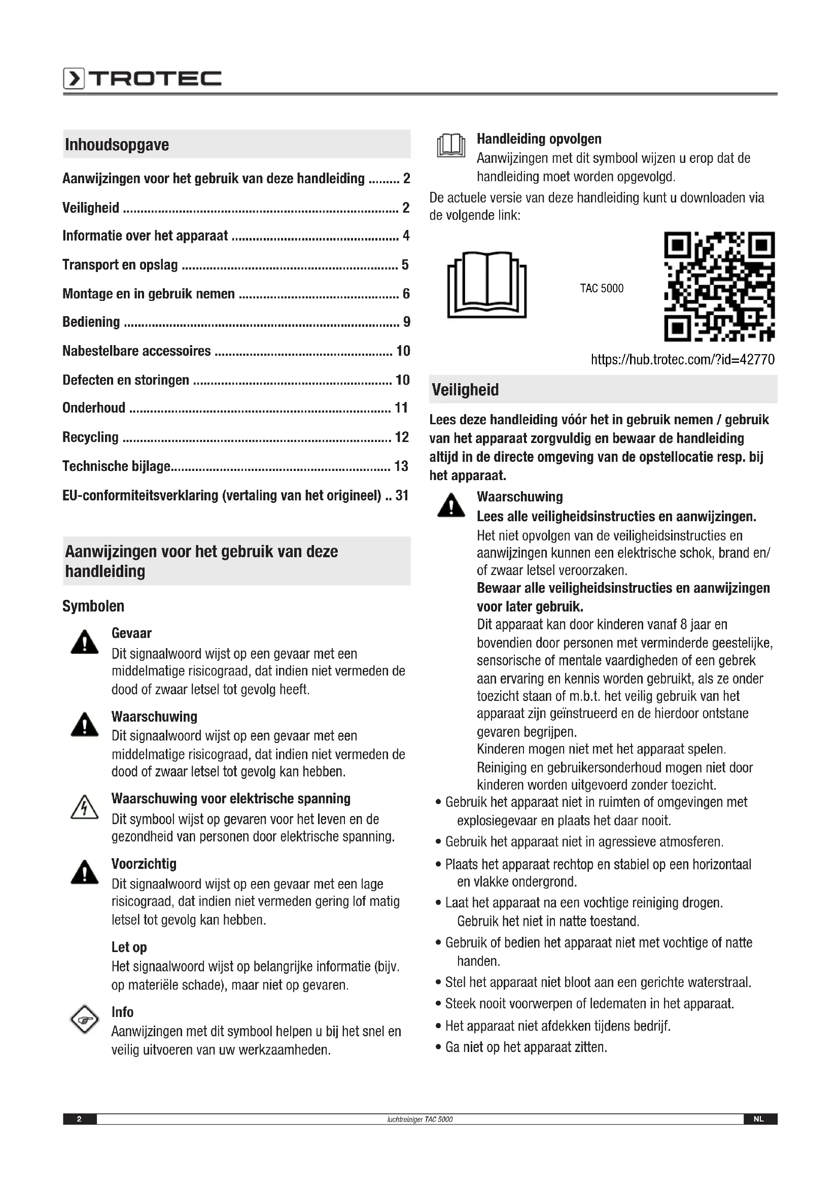 - EU-conformiteitsverklaring (vertaling van het origineel) Aanwijzingen voor het gebruik van deze handleiding Symbolen Gevaar Dit signaalwoord wijst op een gevaar met een middelmatige risicograad, dat indien niet vermeden de dood of zwaar letsel tot gevolg heeft. Waarschuwing Dit signaalwoord wijst op een gevaar met een middelmatige risicograad, dat indien niet vermeden de dood of zwaar letsel tot gevolg kan hebben. Waarschuwing voor elektrische spanning Dit symbool wijst op gevaren voor het leven en de gezondheid van personen door elektrische spanning. Voorzichtig Dit signaalwoord wijst op een gevaar met een lage risicograad, dat indien niet vermeden gering lof matig letsel tot gevolg kan hebben. Let op Het signaalwoord wijst op belangrijke informatie (bijv. op materiële schade), maar niet op gevaren. Info Aanwijzingen met dit symbool helpen u bij het snel en veilig uitvoeren van uw werkzaamheden. Handleiding opvolgen Aanwijzingen met dit symbool wijzen u erop dat de handleiding moet worden opgevolgd. De actuele versie van deze handleiding kunt u downloaden via de volgende link: TAC 5000 https://hub.trotec.com/?id=42770 Veiligheid Lees deze handleiding vóór het in gebruik nemen / gebruik van het apparaat zorgvuldig en bewaar de handleiding altijd in de directe omgeving van de opstellocatie resp. bij het apparaat. Waarschuwing Lees alle veiligheidsinstructies en aanwijzingen. Het niet opvolgen van de veiligheidsinstructies en aanwijzingen kunnen een elektrische schok, brand en/ of zwaar letsel veroorzaken. Bewaar alle veiligheidsinstructies en aanwijzingen voor later gebruik. Dit apparaat kan door kinderen vanaf 8 jaar en bovendien door personen met verminderde geestelijke, sensorische of mentale vaardigheden of een gebrek aan ervaring en kennis worden gebruikt, als ze onder toezicht staan of m.b.t. het veilig gebruik van het apparaat zijn geïnstrueerd en de hierdoor ontstane gevaren begrijpen. Kinderen mogen niet met het apparaat spelen. Reiniging en gebruikersonderhoud mogen niet door kinderen worden uitgevoerd zonder toezicht. p. 31