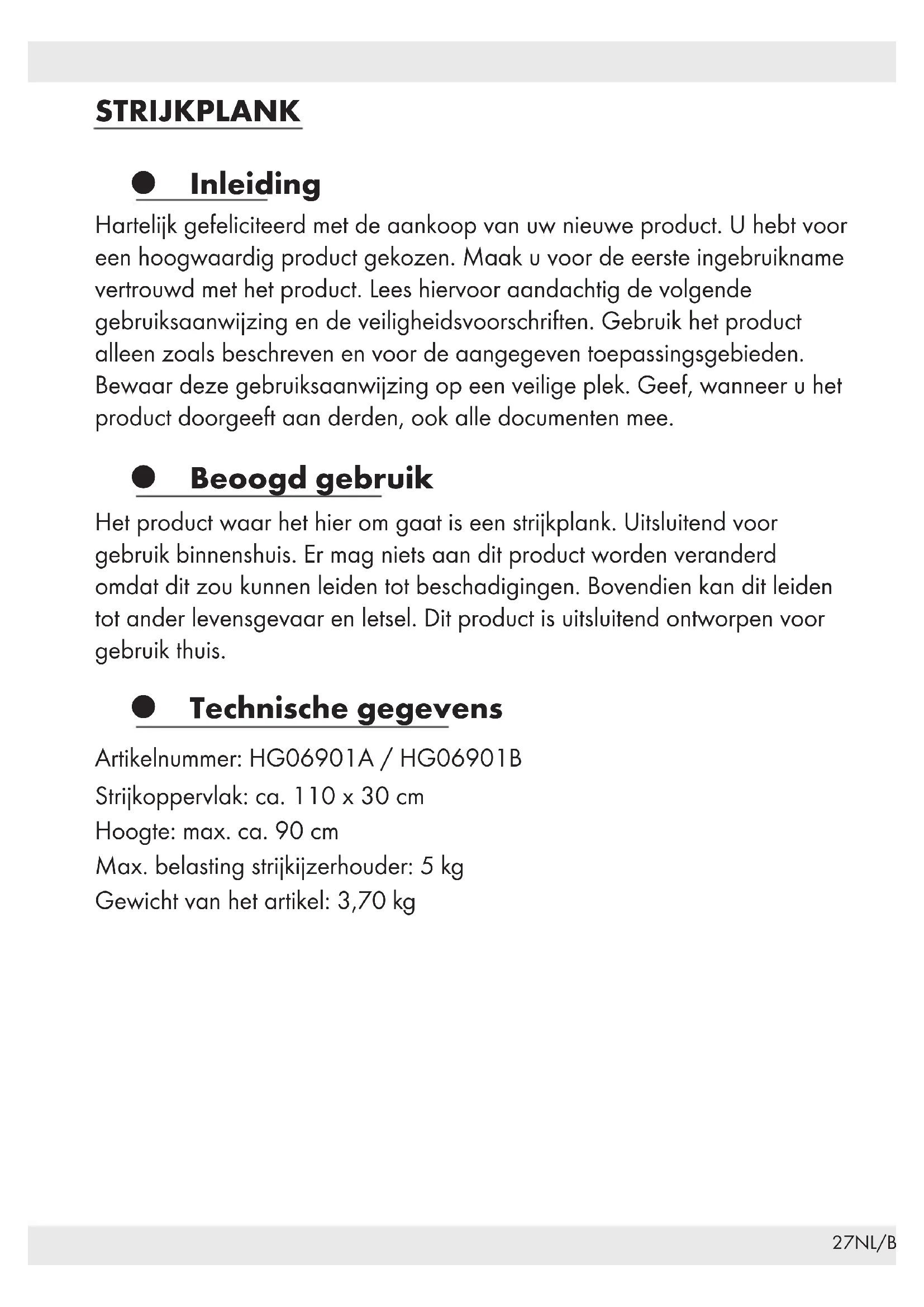 ONGEVALLEN VOOR (KLEINE) KINDEREN! Laat kinderen nooit zonder toezicht alleen met het verpakkingsmateriaal en het product. Er bestaat verstikkingsgevaar door het verpakkingsmateriaal en levensgevaar door verwurging. Kinderen onderschatten gevaren vaak. Houd kinderen steeds uit de buurt van het product. Dit product is geen speelgoed. Let op uw handen en vingers als u de strijkplank open- of dichtklapt. Probeer nooit het product zelf te repareren. Laat het strijkijzer nooit langdurig op de strijkplank staan. Ga niet op de strijkplank zitten en leun er ook niet tegenaan. Gevaar door heet water of stoom die van de ijzer van de strijkplank kan afdruppelen. De strijkijzerhouder kan bij langdurig gebruik heet worden. Houd de hand aan de al gegeven tips om brandwonden te vermijden. Houd het apparaat uit de buurt van water of andere vloeistoffen. De strijkijzerhouder is alleen bestemd voor het tijdelijk wegzetten van het strijkijzer. Belast het niet te zwaar. Gebruik Tip: Verwijder alle verpakkingsmaterialen van het product. Strijkplank neerzetten Pak de dichtgeklapte strijkplank met het strijkoppervlak naar boven vast en duw met de andere hand op de handhendel. Het frame opent zich tot de maximale stand (zie. Afb.A). Zorg ervoor dat het apparaat op een vlakke ondergrond staat en volkomen vergrendeld is.29NL/BE Hoogte strijkplank instellen Om de hoogte van de strijkplank in te stellen houdt u deze met beide handen vast. Druk op de handhendel om de vergrendeling te ontsluiten. Stel de gewenste hoogte in en laat de handhendel los zodat het frame weer vastklikt (zie Afb.B). Strijkplank dichtklappen Om de strijkplank dicht te klappen drukt u op de handhendel en duwt u tegelijkertijd het strijkoppervlak naar beneden zodat de poten samenklappen. Haak de veiligheidsslot vast aan de klinkbouten (zie Afb.C). Schoonmaken en onderhoud Maak het product schoon met een enigszins vochtig, pluisvrij doekje. Afvoer De verpakking bestaat uit milieuvriendelijke grondstoffen die u via de plaatselijke recyclingcontainers kunt afvoeren. Informatie over de mogelijkheden om het uitgediende product na gebruik te verwijderen, verstrekt uw gemeentelijke overheid.30 NL/BE Garantie Het product wordt volgens strenge kwaliteitsrichtlijnen zorgvuldig geproduceerd en voor levering grondig getest. In geval van schade aan het product kunt u rechtmatig beroep doen op de verkoper van het product. Deze wettelijke rechten worden door onze hierna vermelde garantie niet beperkt. Op dit product verlenen wij 3 jaar garantie vanaf aankoopdatum. De garantieperiode start op de dag van aankoop. Bewaar de originele kassabon alstublieft. Dit document is nodig als bewijs voor aankoop. Wanneer binnen 3 jaar na de aankoopdatum van dit product een materiaal- of productiefout optreedt, dan wordt het product door ons – naar onze keuze – gratis voor u gerepareerd of vervangen. Deze garantie komt te vervallen als het product beschadigd wordt, niet correct gebruikt of onderhouden wordt. De garantie geldt voor materiaal- en productiefouten. Deze garantie is niet van toepassing op productonderdelen, die onderhevig zijn aan normale slijtage en hierdoor als aan slijtage onderhevige onderdelen gelden (bijv. batterijen) of voor beschadigingen aan breekbare onderdelen, zoals bijv. schakelaars, accu’s of dergelijke onderdelen, die gemaakt zijn van glas. Afwikkeling in geval van garantie Om een snelle afhandeling van uw reclamatie te waarborgen dient u de volgende instructies in acht te nemen: Houd bij alle vragen alstublieft de kassabon en het artikelnummer (bijv. IAN 123456_7890) als bewijs van aankoop bij de hand.31NL/BE Het artikelnummer vindt u op de typeplaat, ingegraveerd, op het titelblad van uw handleiding (linksonder) of als sticker op de achter- of onderzijde. Wanneer er storingen in de werking of andere gebreken optreden, dient u eerst telefonisch of per e-mail contact met de onderstaande service-afdeling op te nemen. Een als defect geregistreerd product kunt u dan samen met uw aankoopbewijs (kassabon) en vermelding van de concrete schade alsmede het tijdstip van optreden voor u franco aan het u meegedeelde servicepunt verzenden. Service Service Nederland Tel.: 08000225537 E-Mail: owim@lidl.nl Service België Tel.: 080071011 Tel.: 80023970 (Luxemburg) E-Mail: owim@lidl.be32 PL Wstęp ........................................... Strona 33 Używać zgodnie z przeznaczeniem......... Strona 33 Dane techniczne ............................... Strona 33 Instrukcje bezpieczeństwa ................... Strona 34 Zastosowanie .................................. Strona 34 Rozstawianie deski do prasowania .................... Strona 34 Regulacja wysokości deski do prasowania .............. Strona 35 Składanie deski do prasowania....................... Strona 35 Czyszczenie i konserwacja ................... Strona 35 Utylizacja ....................................... Strona 35 Gwarancja...................................... Strona 3633PL