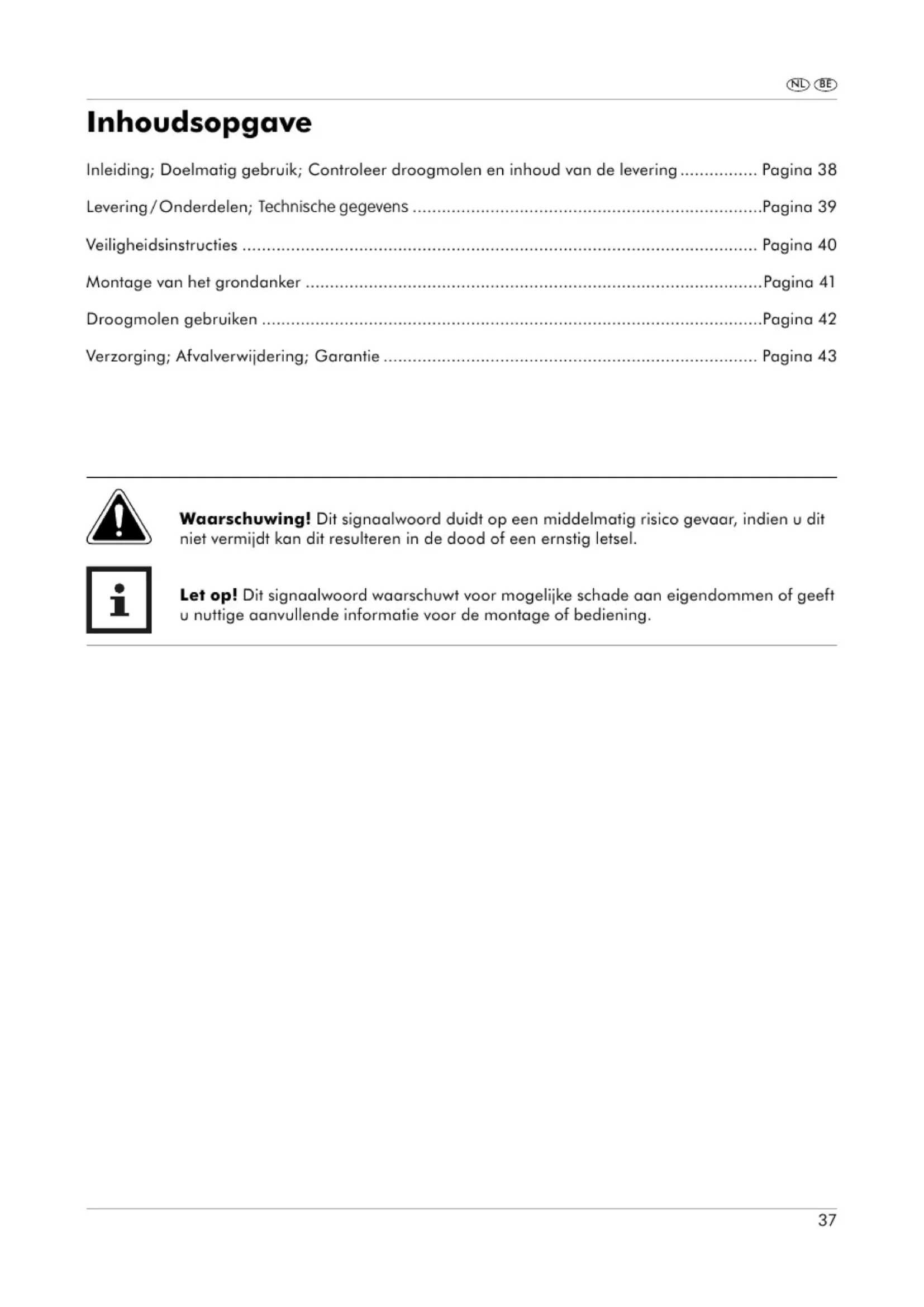- Un prodotto, risultante difettoso, potrà essere poi spedito gratuitamente all’indirizzo del centro di assistenza comunicatoVi, allegando lo scontrino ed indicando il tipo di difetto riscontrato. Sul sito www.lidl-service.com è possibile scaricare queste istruzioni come pure altri manuali, video sui prodotti e software. Centro di assistenza JUWEL H. Wüster GmbH E-Mail: kund@juwel.com Telefono: 0049-8821-1679 Sede: GERMANIA IAN 290775 IT CH37 NL BE Inhoudsopgave Inleiding; Doelmatig gebruik; Controleer droogmolen en inhoud van de levering ................ Pagina 38 Levering / Onderdelen; Technische gegevens ........................................................................Pagina 39 Veiligheidsinstructies .......................................................................................................... Pagina 40 Montage van het grondanker ..............................................................................................Pagina 41 Droogmolen gebruiken .......................................................................................................Pagina 42 Verzorging; Afvalverwijdering; Garantie ............................................................................. Pagina 43 Waarschuwing! Dit signaalwoord duidt op een middelmatig risico gevaar, indien u dit niet vermijdt kan dit resulteren in de dood of een ernstig letsel. Let op! Dit signaalwoord waarschuwt voor mogelijke schade aan eigendommen of geeft u nuttige aanvullende informatie voor de montage of bediening.38 Inleiding Gefeliciteerd! Met uw aankoop heeft U zich besloten een kwaliteitsproduct te kopen. Gelieve zich met het product vertrouwd te maken voor de installatie en inbedrijfstelling. Deze gebruiksaanwijzing behoort tot deze aluminium droogmolen. Ze bevat belangrijke informatie in verband met montage en gebruik. Om de duidelijkheid te verhogen wordt de aluminium droogmolen hieronder gewoon “droogmolen” genoemd. Lees de gebruiksaanwijzing, vooral de veiligheidsinstructies, voor het gebruik van de droogmolen. Het negeren van deze instructies kan leiden tot ernstig letsel of schade aan de droogmolen. De handleiding is gebaseerd op de geldende normen en regels van de Europese Unie. Gelieve ook op landspecifiek beleid en wetgeving in het buitenland te achten. Bewaar deze instructies voor verder gebruik. Als U de droogmolen aan derden doorgeeft, geeft dan aub deze instructies mee. Doelmatig gebruik
