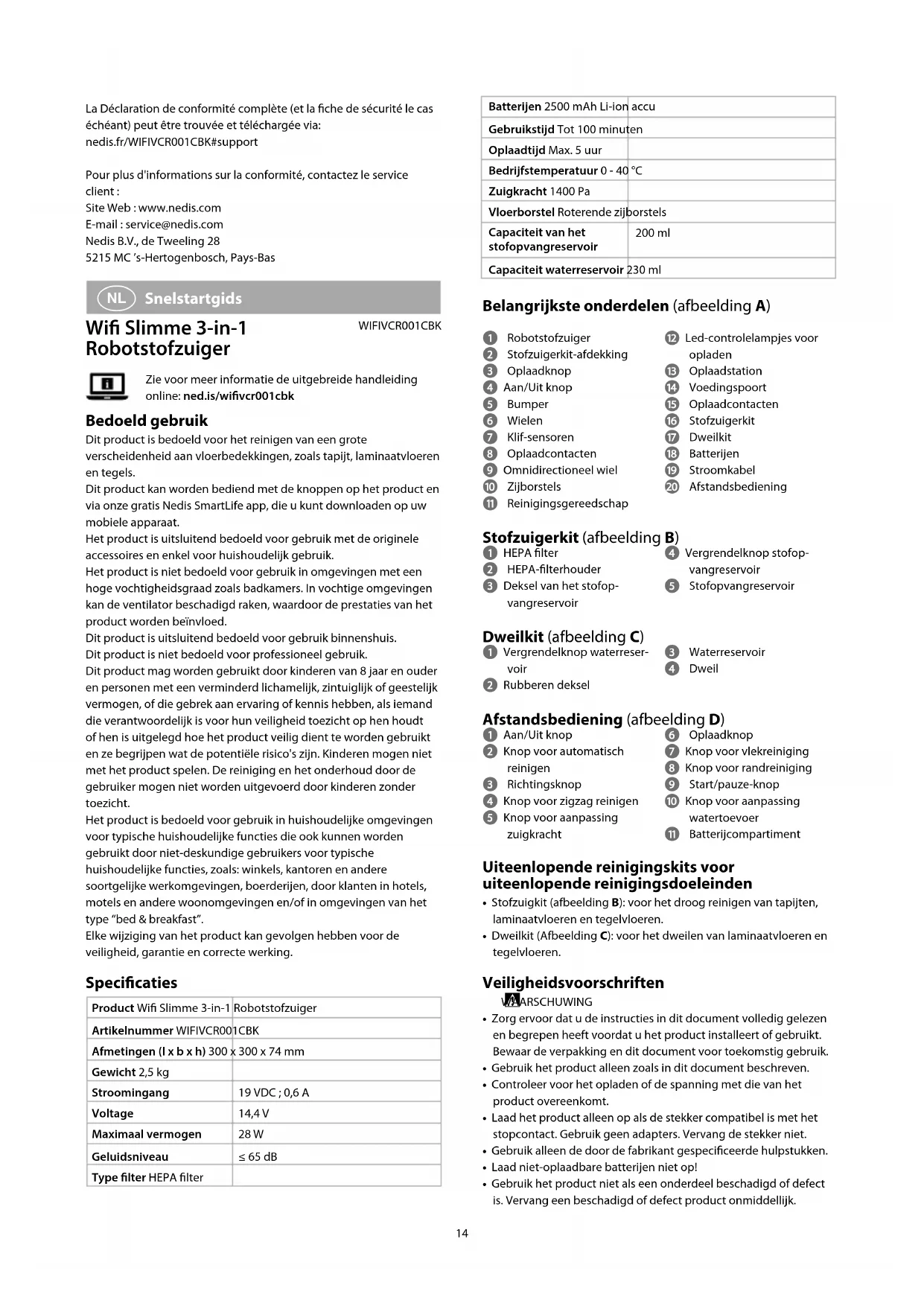 Snelstartgids Wi Slimme 3-in-1 Robotstofzuiger WIFIVCR001CBKZie voor meer informatie de uitgebreide handleiding online: ned.is/wivcr001cbk Bedoeld gebruik Dit product is bedoeld voor het reinigen van een grote verscheidenheid aan vloerbedekkingen, zoals tapijt, laminaatvloeren en tegels.Dit product kan worden bediend met de knoppen op het product en via onze gratis Nedis SmartLife app, die u kunt downloaden op uw mobiele apparaat.Het product is uitsluitend bedoeld voor gebruik met de originele accessoires en enkel voor huishoudelijk gebruik.Het product is niet bedoeld voor gebruik in omgevingen met een hoge vochtigheidsgraad zoals badkamers. In vochtige omgevingen kan de ventilator beschadigd raken, waardoor de prestaties van het product worden beïnvloed.Dit product is uitsluitend bedoeld voor gebruik binnenshuis.Dit product is niet bedoeld voor professioneel gebruik.Dit product mag worden gebruikt door kinderen van 8 jaar en ouder en personen met een verminderd lichamelijk, zintuiglijk of geestelijk vermogen, of die gebrek aan ervaring of kennis hebben, als iemand die verantwoordelijk is voor hun veiligheid toezicht op hen houdt of hen is uitgelegd hoe het product veilig dient te worden gebruikt en ze begrijpen wat de potentiële risico's zijn. Kinderen mogen niet met het product spelen. De reiniging en het onderhoud door de gebruiker mogen niet worden uitgevoerd door kinderen zonder toezicht.Het product is bedoeld voor gebruik in huishoudelijke omgevingen voor typische huishoudelijke functies die ook kunnen worden gebruikt door niet-deskundige gebruikers voor typische huishoudelijke functies, zoals: winkels, kantoren en andere soortgelijke werkomgevingen, boerderijen, door klanten in hotels, motels en andere woonomgevingen en/of in omgevingen van het type “bed & breakfast”.Elke wijziging van het product kan gevolgen hebben voor de veiligheid, garantie en correcte werking. Specicaties Product Wi Slimme 3-in-1 RobotstofzuigerArtikelnummer WIFIVCR001CBKAfmetingen (l x b x h) 300 x 300 x 74 mmGewicht 2,5 kgStroomingang 19 VDC ; 0,6 AVoltage 14,4 VMaximaal vermogen 28 WGeluidsniveau ≤ 65 dBType lter HEPA lter15